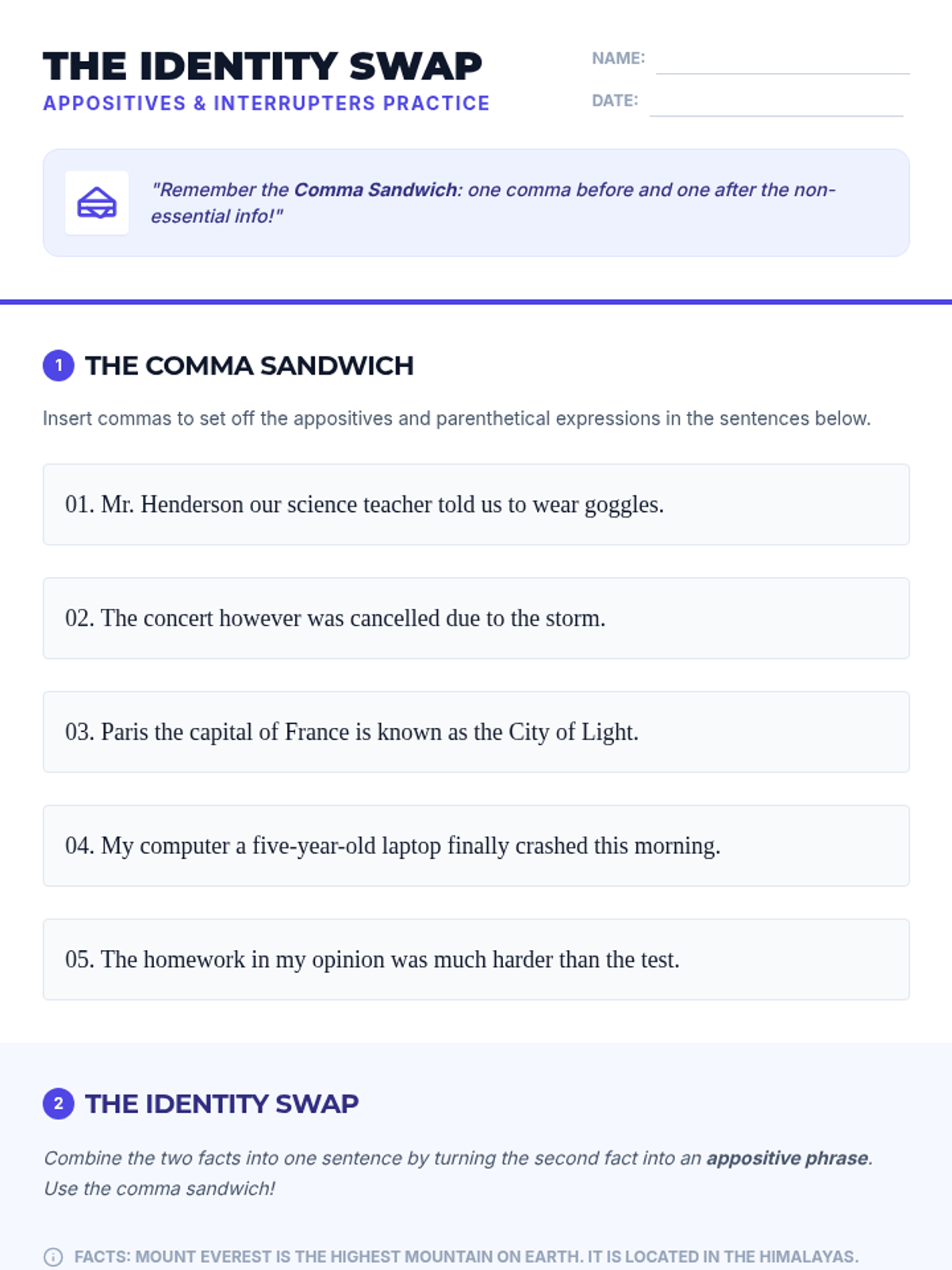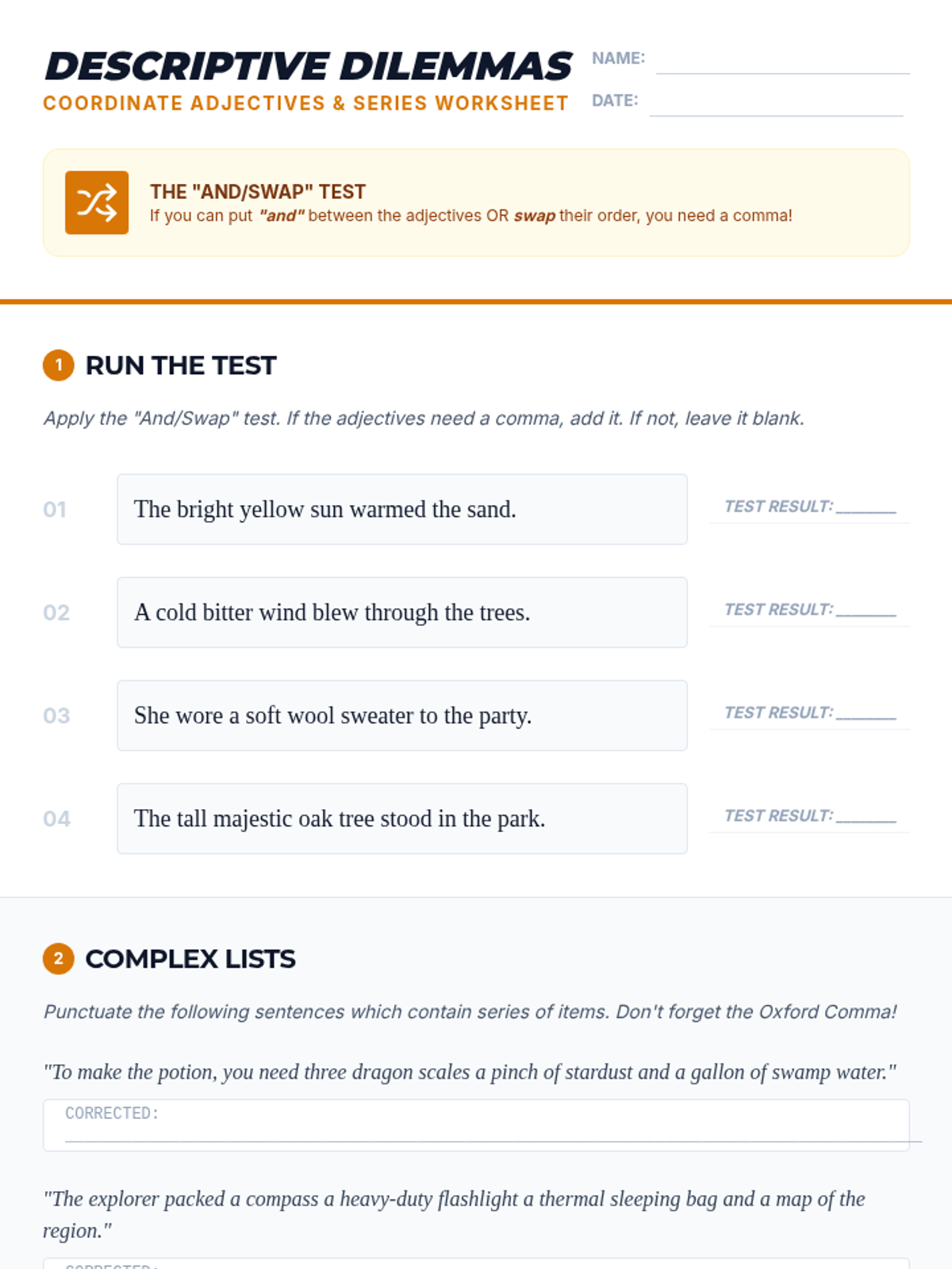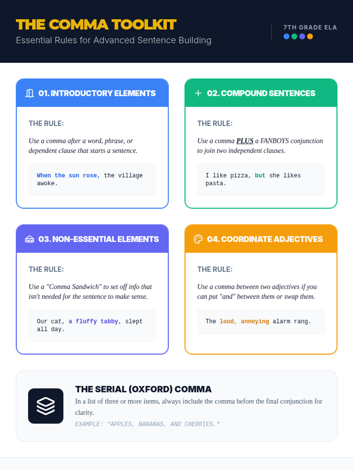 A comprehensive 7th-grade unit focused on the strategic use of commas to improve sentence clarity, variety, and rhythm. Students move from basic rules to sophisticated applications in introductory elements, compound sentences, and non-essential phrases.