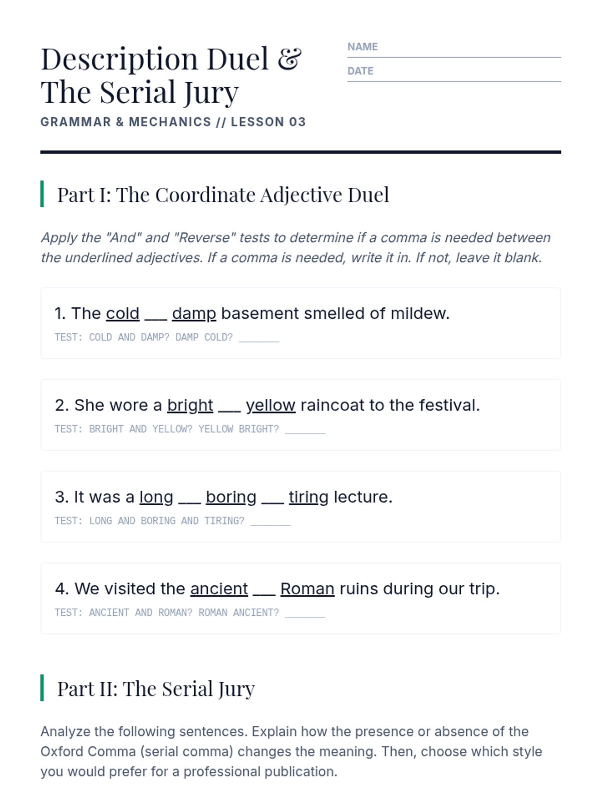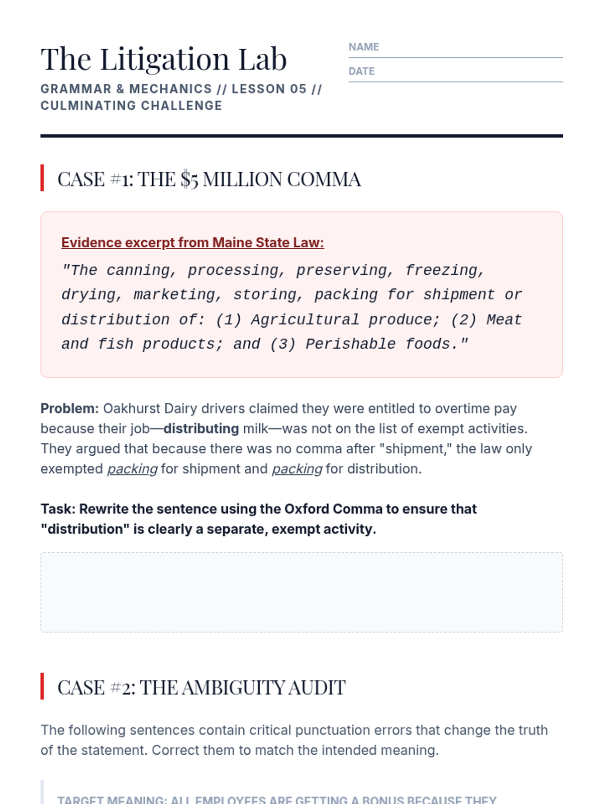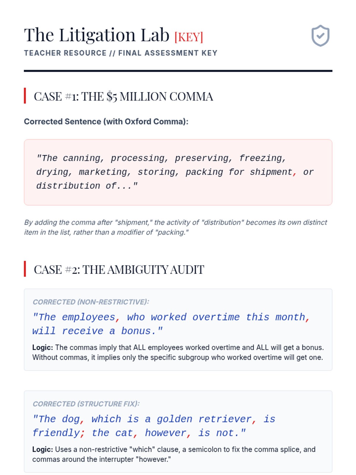 This sequence targets the nuance of advanced comma usage, specifically focusing on restrictive and non-restrictive elements, introductory phrases, and serial commas. Students explore how punctuation dictates the fundamental meaning and truth of academic and legal writing.