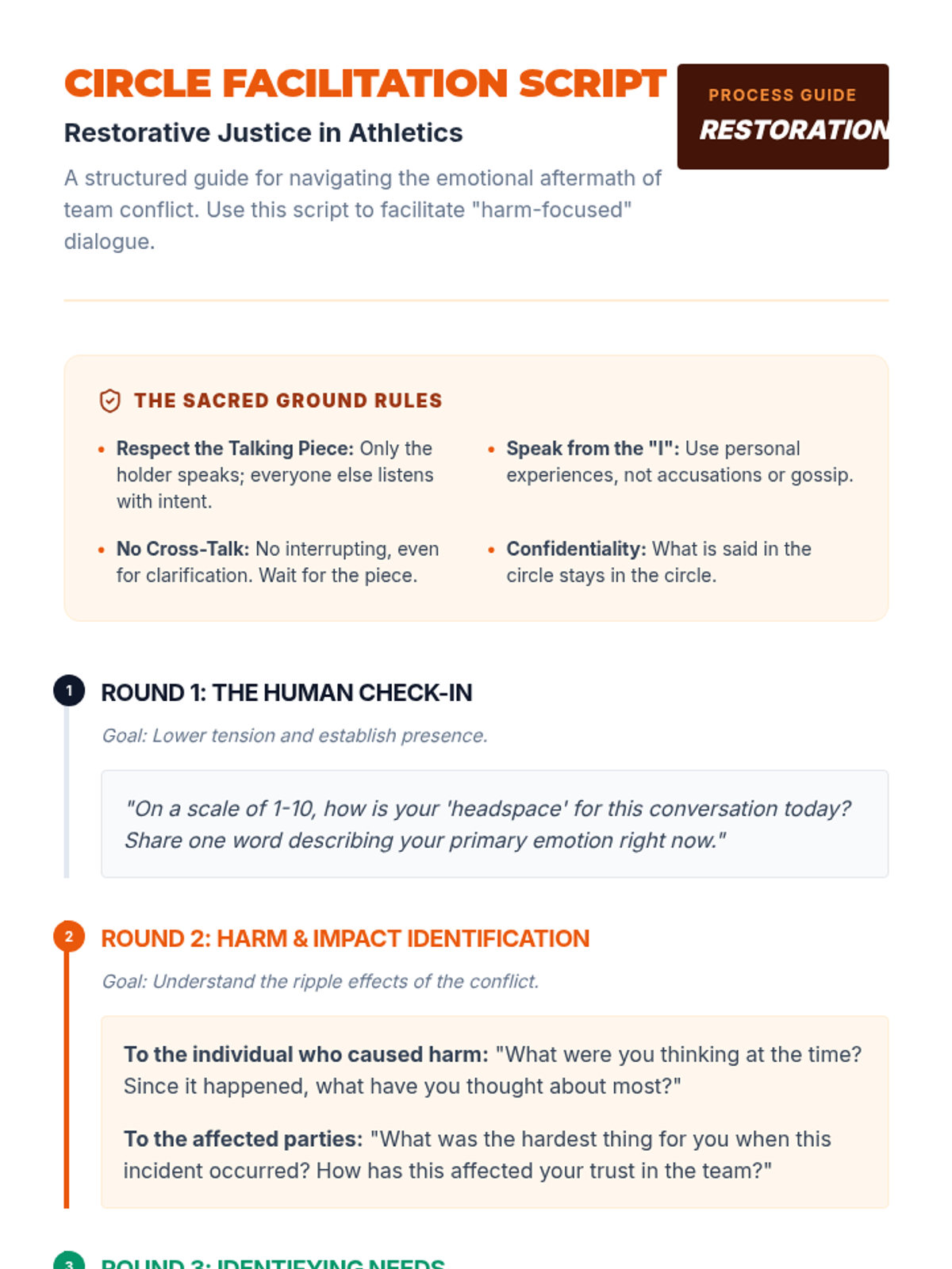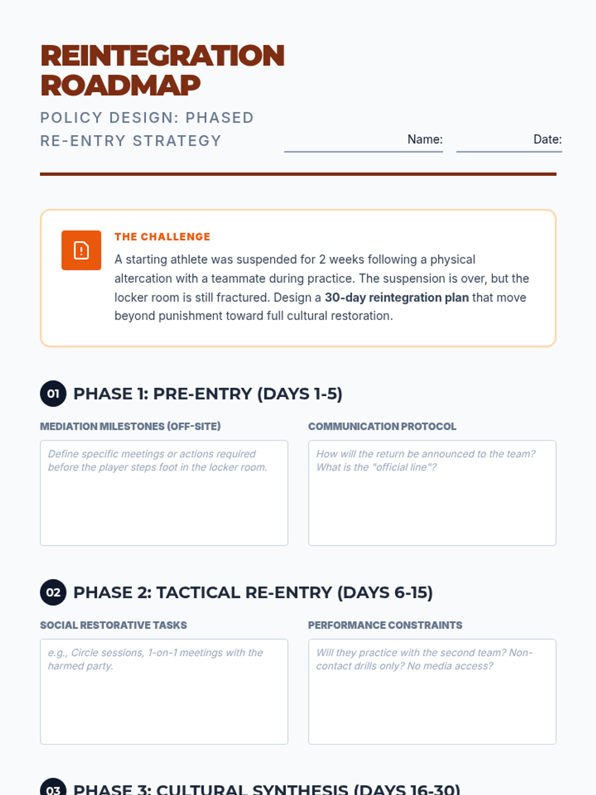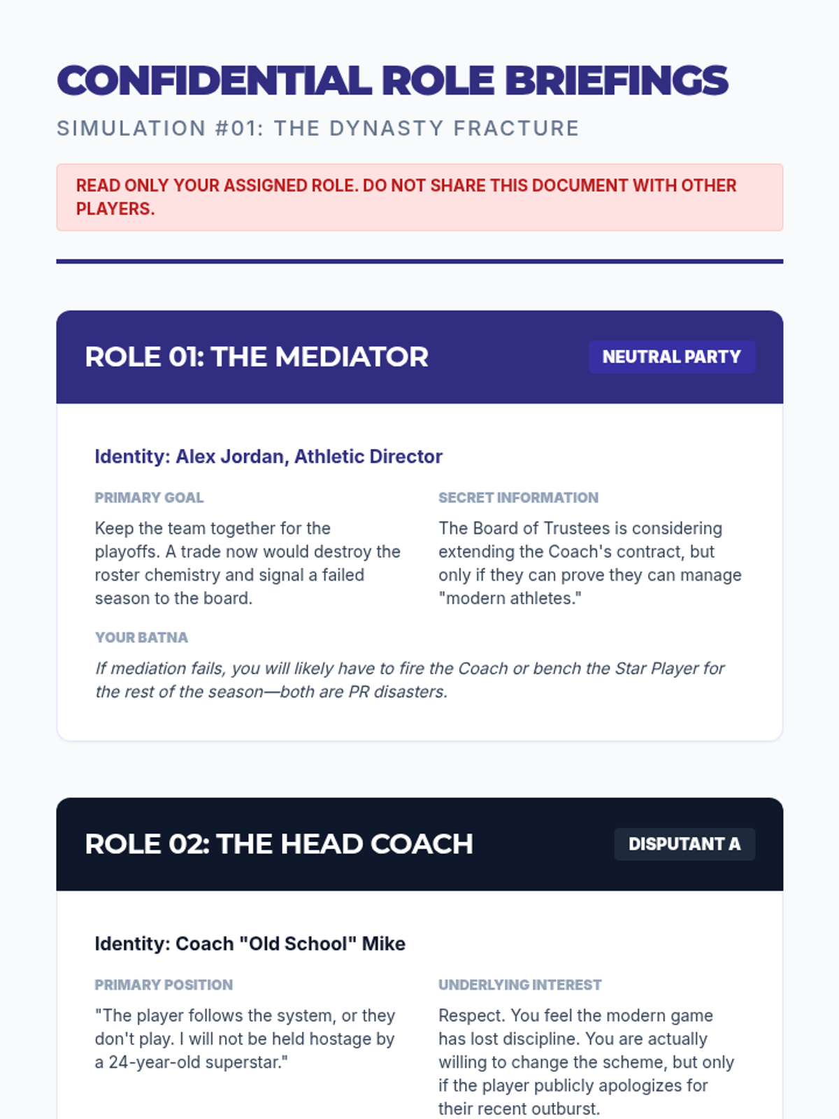 A graduate-level course exploring theoretical and practical conflict resolution within sports organizations. Students analyze archetypes, practice high-stakes mediation, and develop organizational protocols for professional athletic environments.