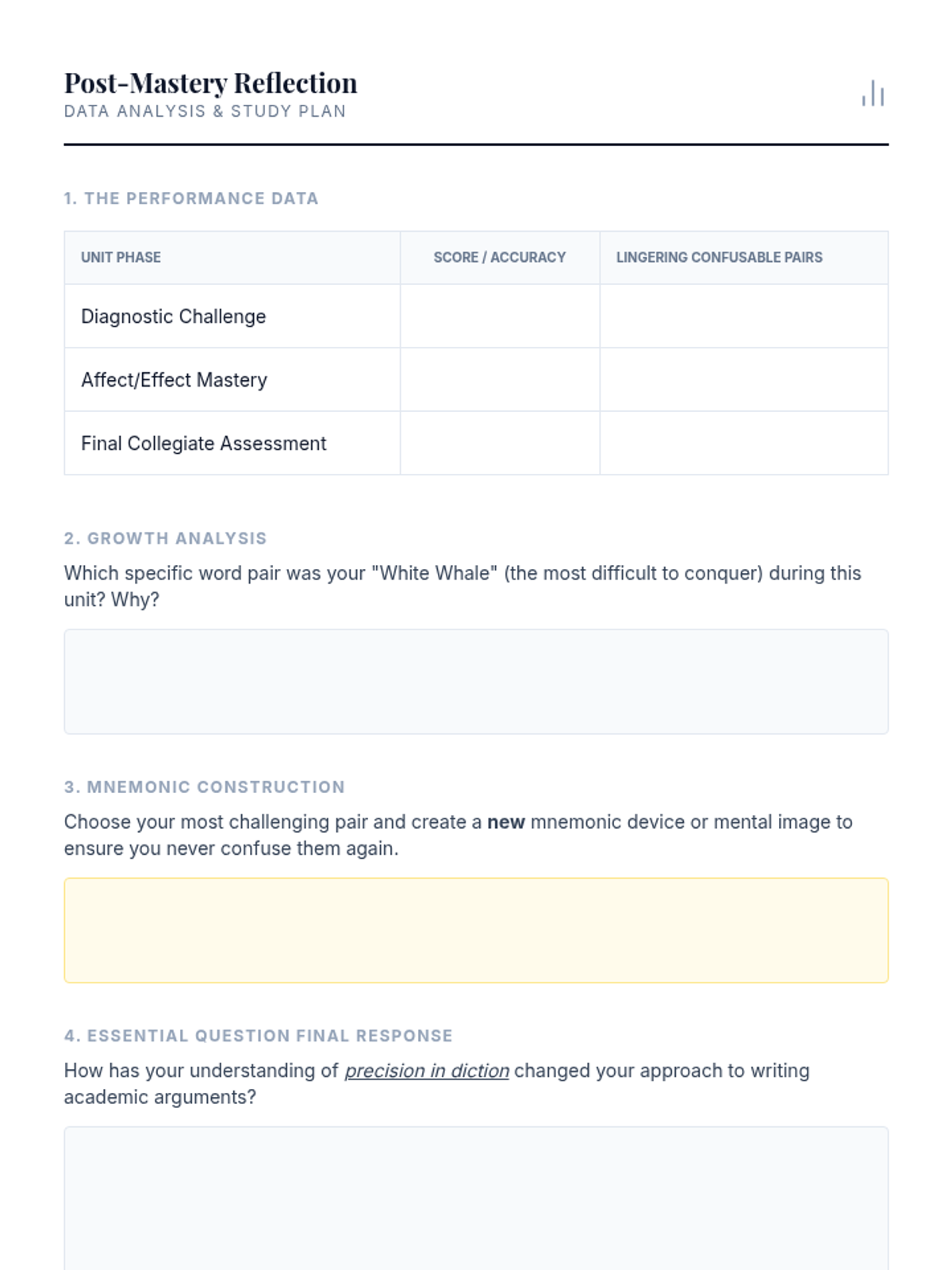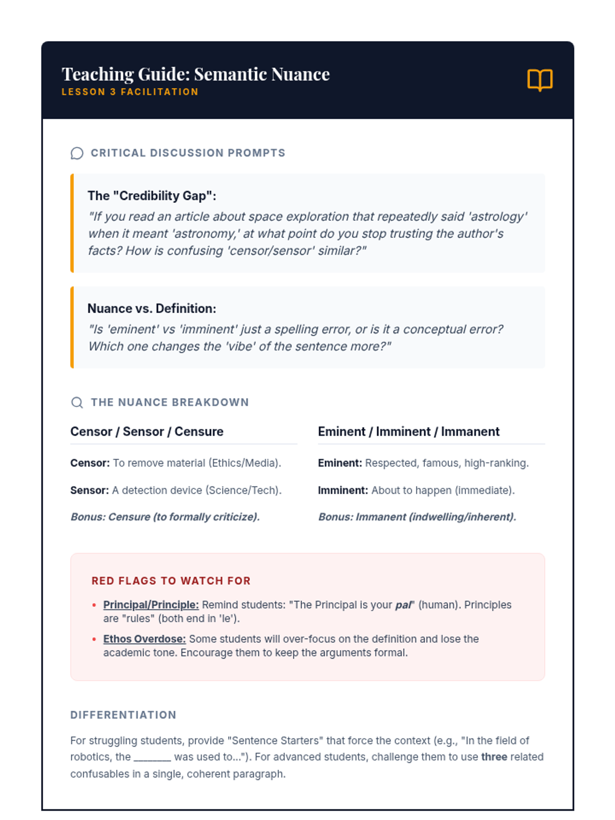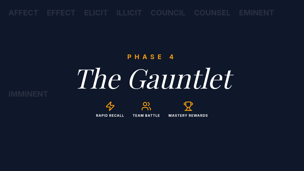 A rigorous sequence for 11th-grade students focusing on high-level academic confusables, paronyms, and homophones commonly found in college-level writing and standardized tests. Students move from diagnostic assessment to deep usage analysis and competitive mastery.