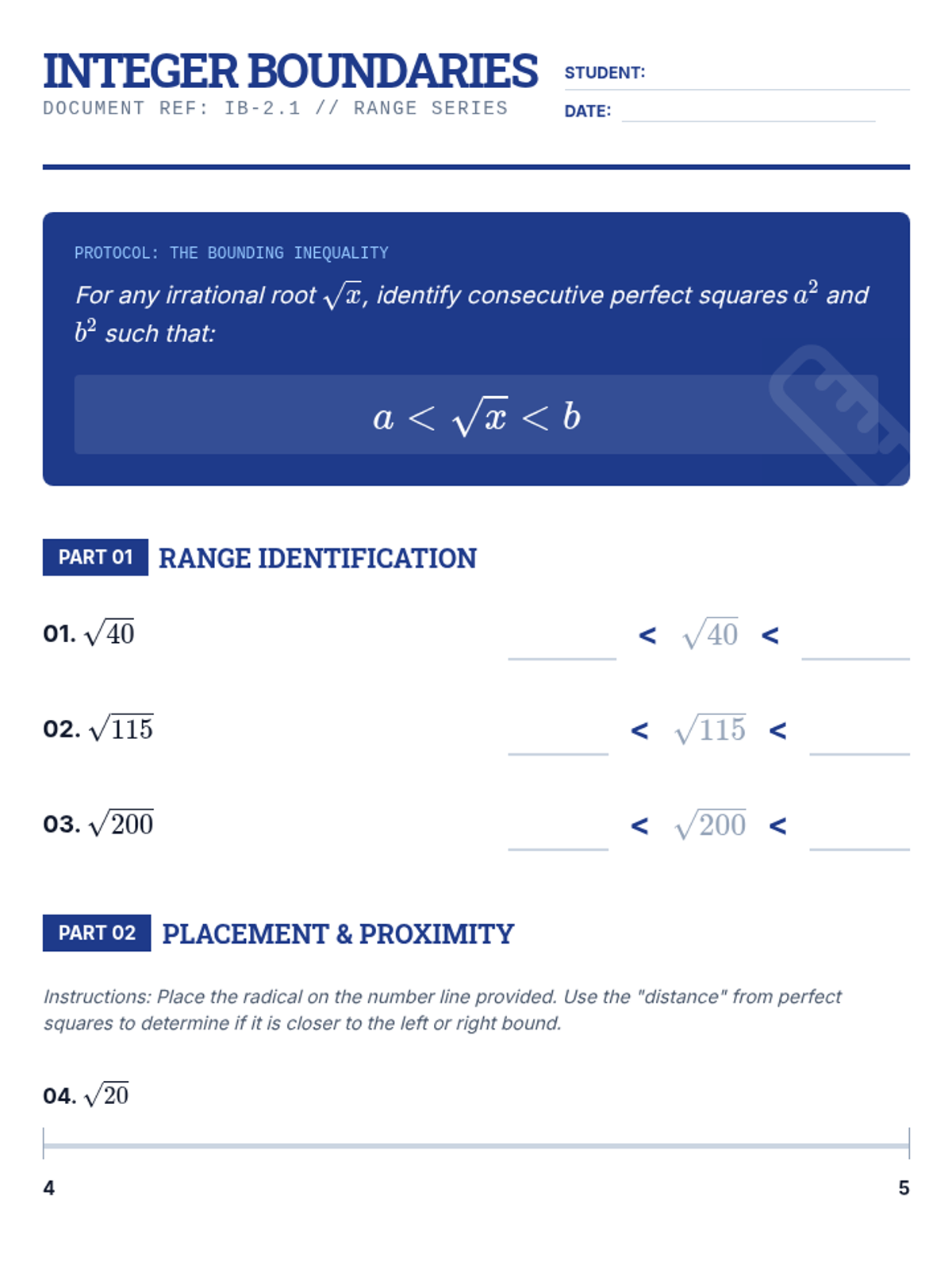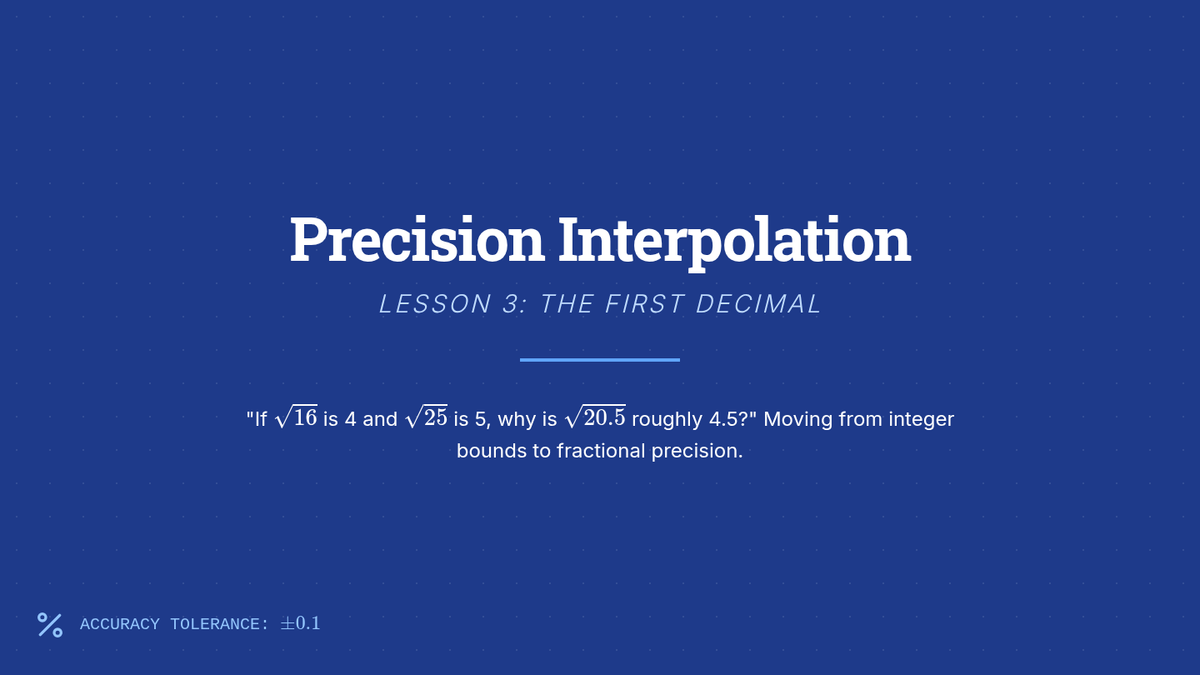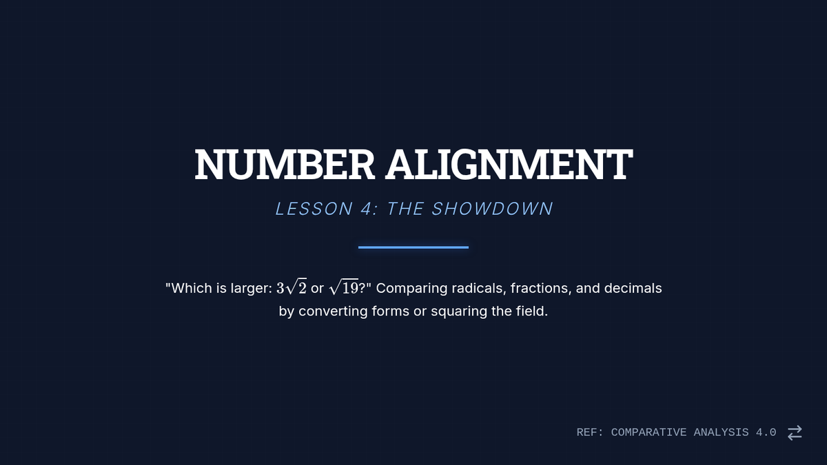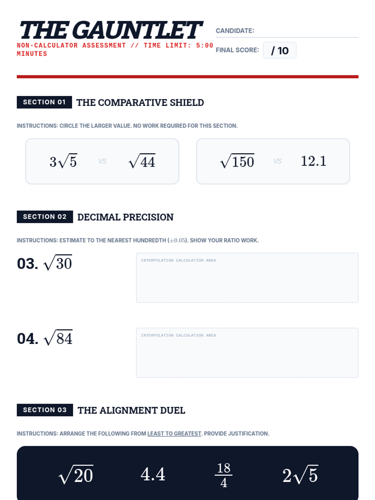 A high-school level sequence focused on developing advanced number sense and mental estimation skills for irrational numbers without the use of calculators. Students progress from basic radical simplification to complex ordering and linear interpolation, preparing for college-level calculus and standardized tests.