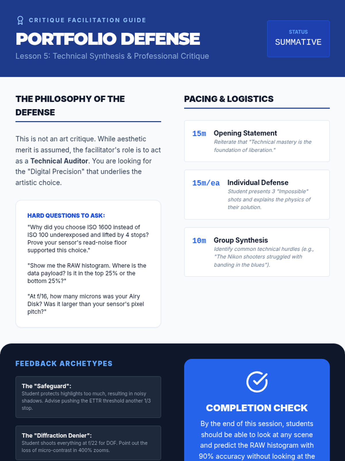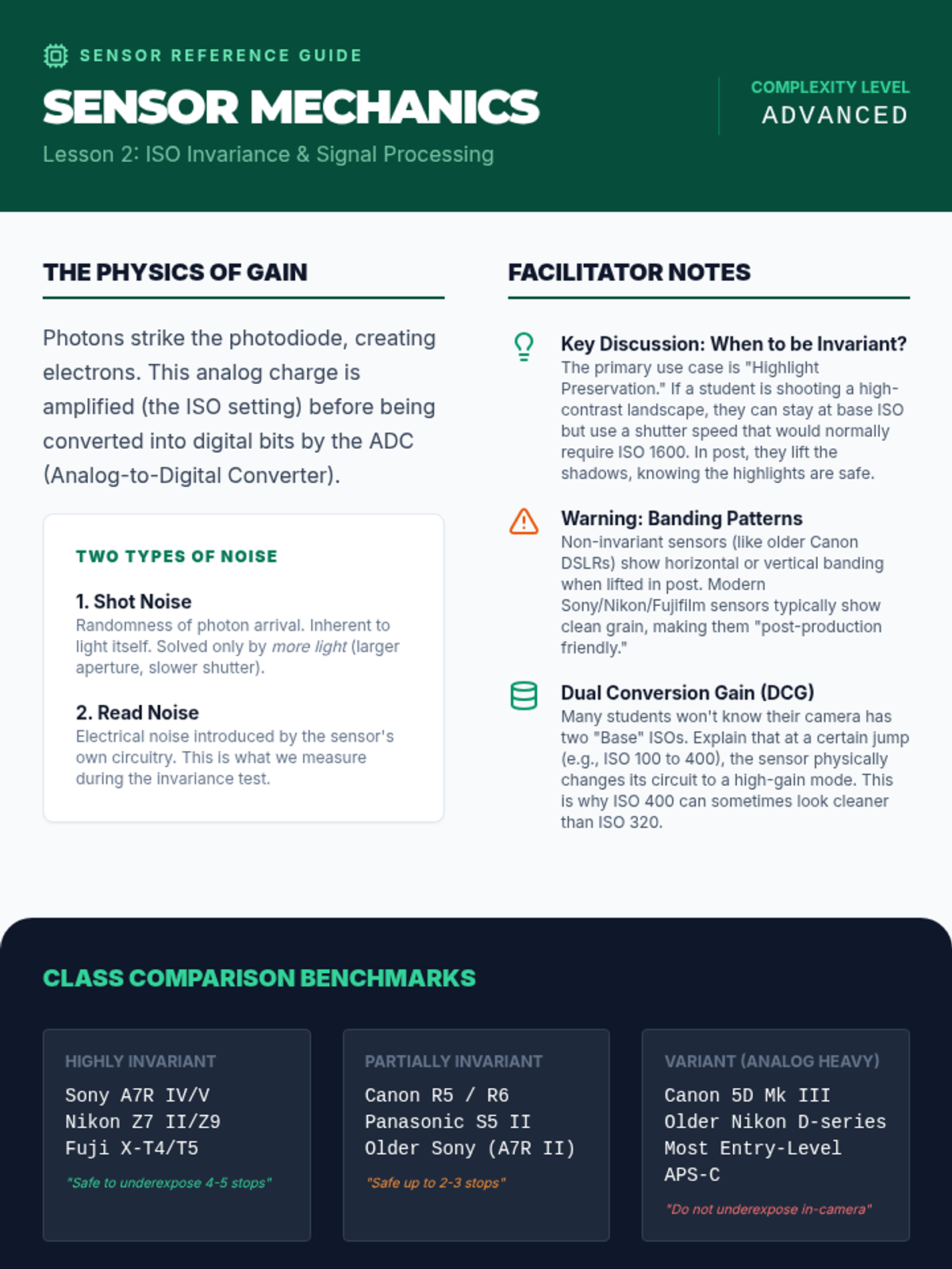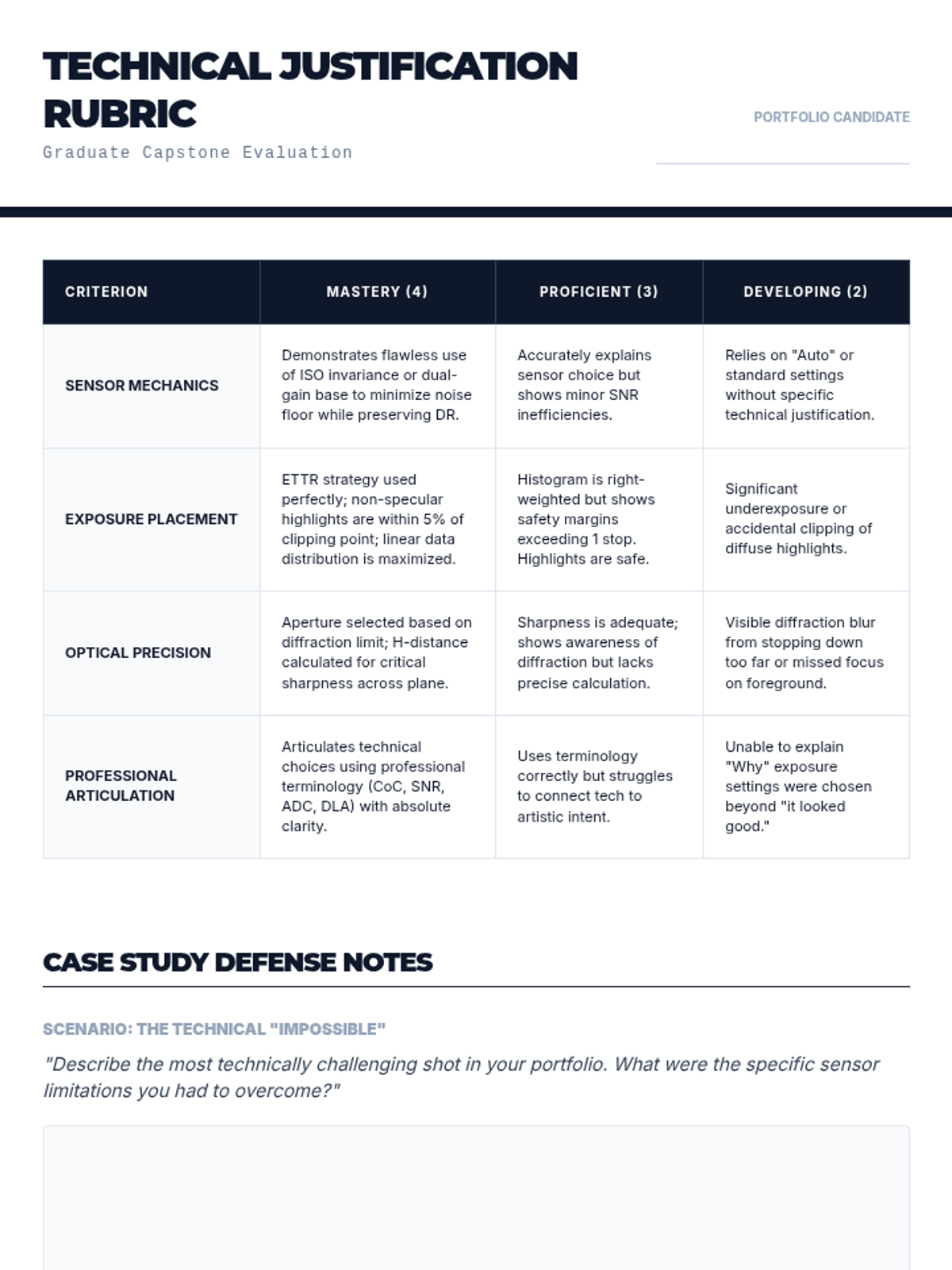 A graduate-level technical sequence exploring the physics of digital sensors, ISO invariance, advanced optics, and raw data management. Students master the technical precision required to execute high-level artistic intent in photography.