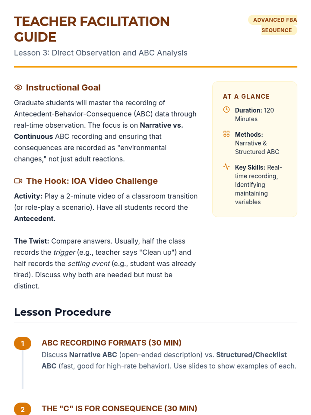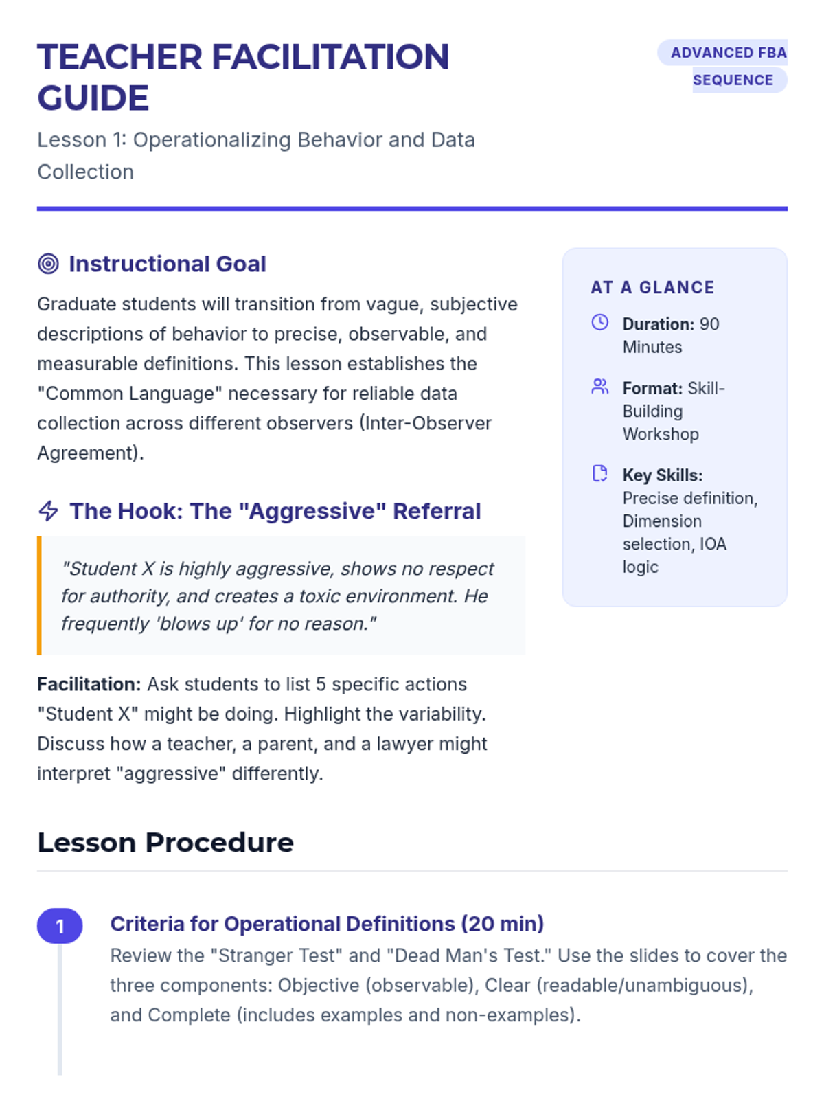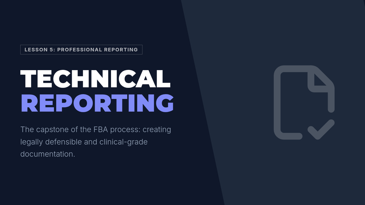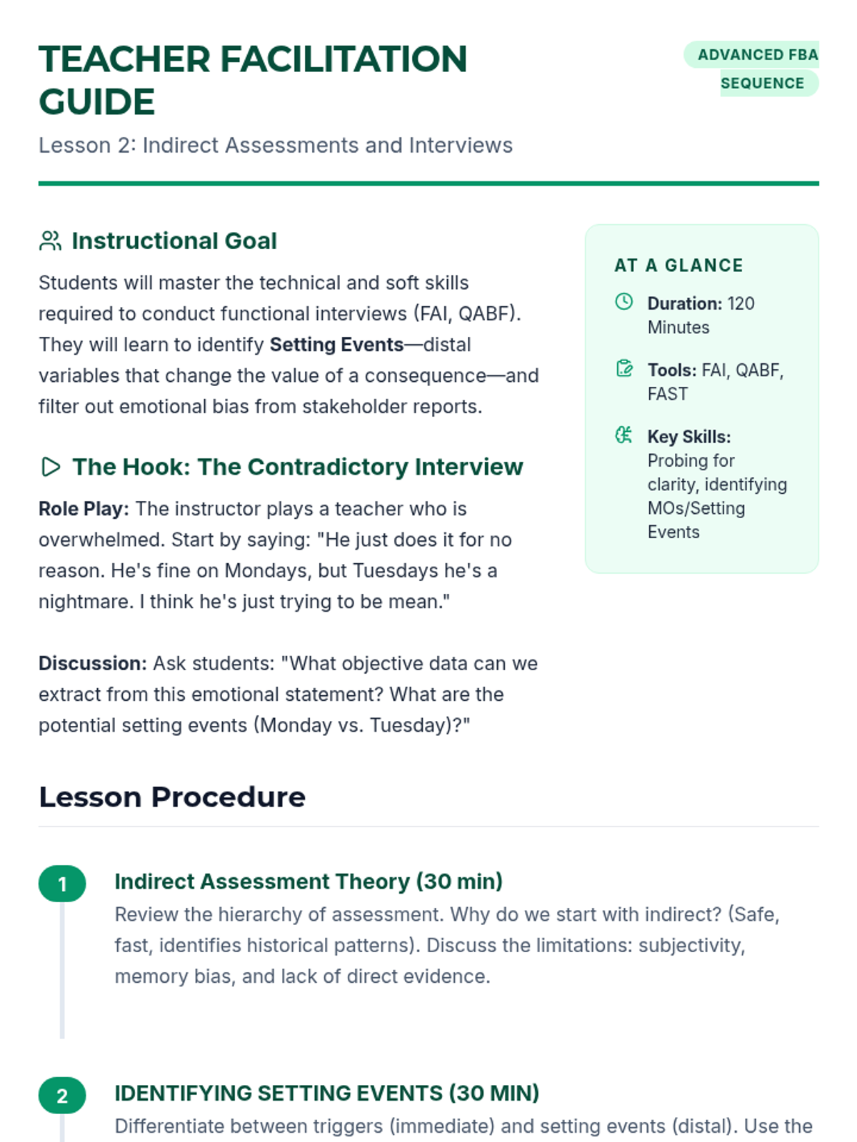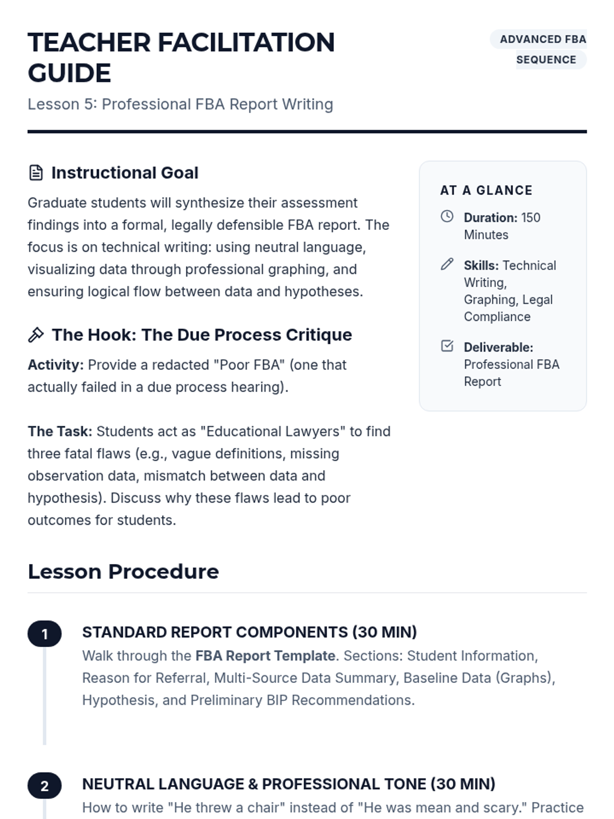 A comprehensive graduate-level sequence on conducting rigorous Functional Behavioral Assessments (FBAs). Students master operationalizing behavior, collecting multi-source data, triangulating findings, and writing professional, legally defensible FBA reports.