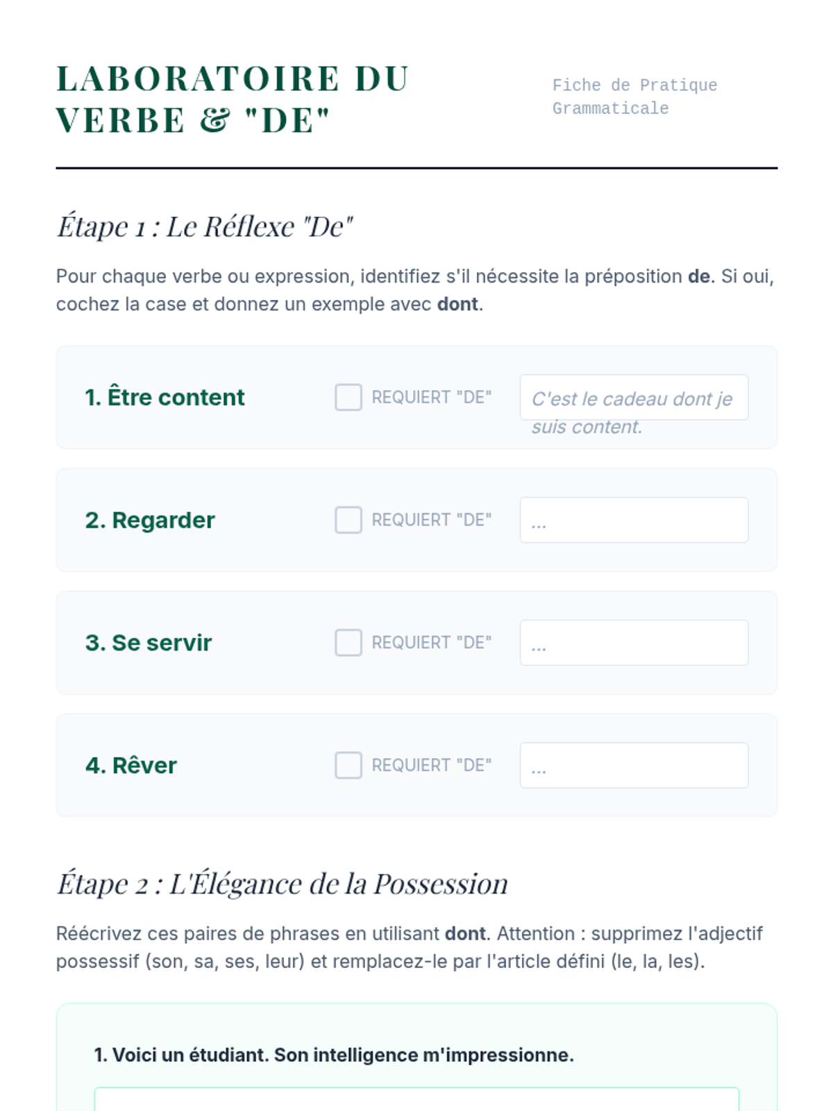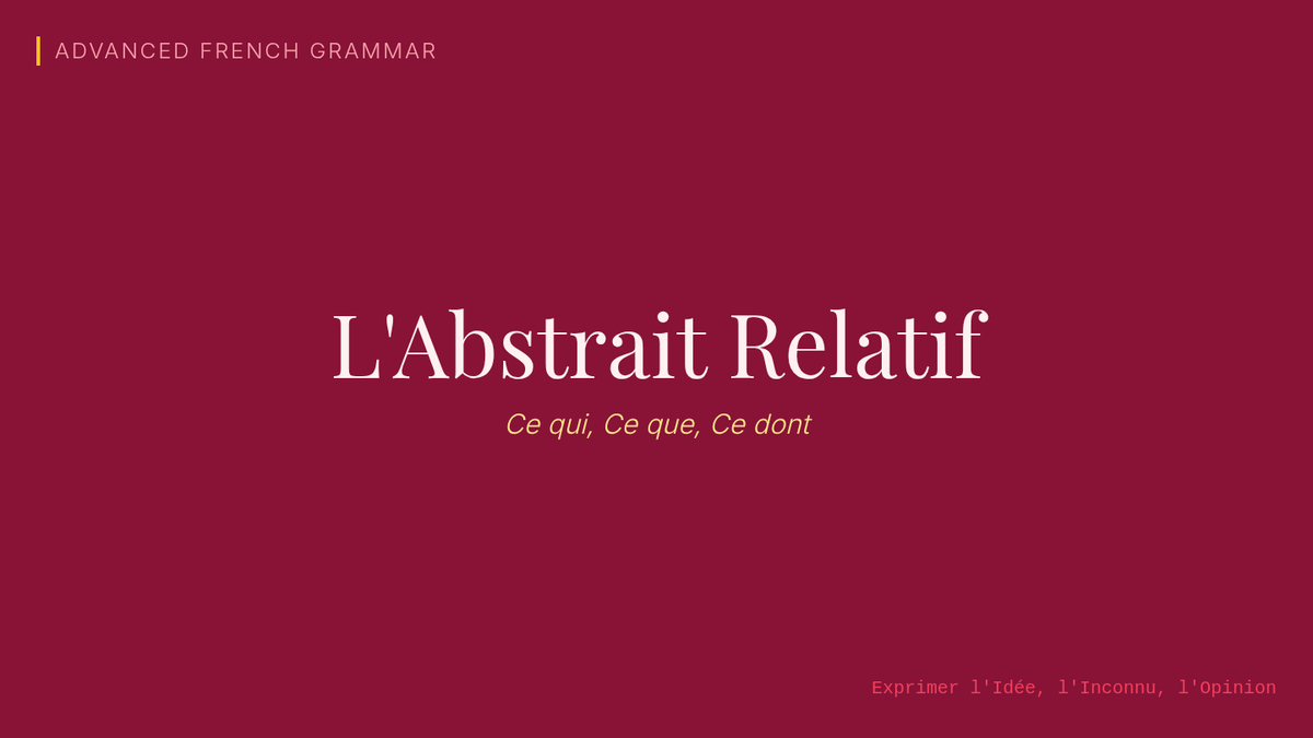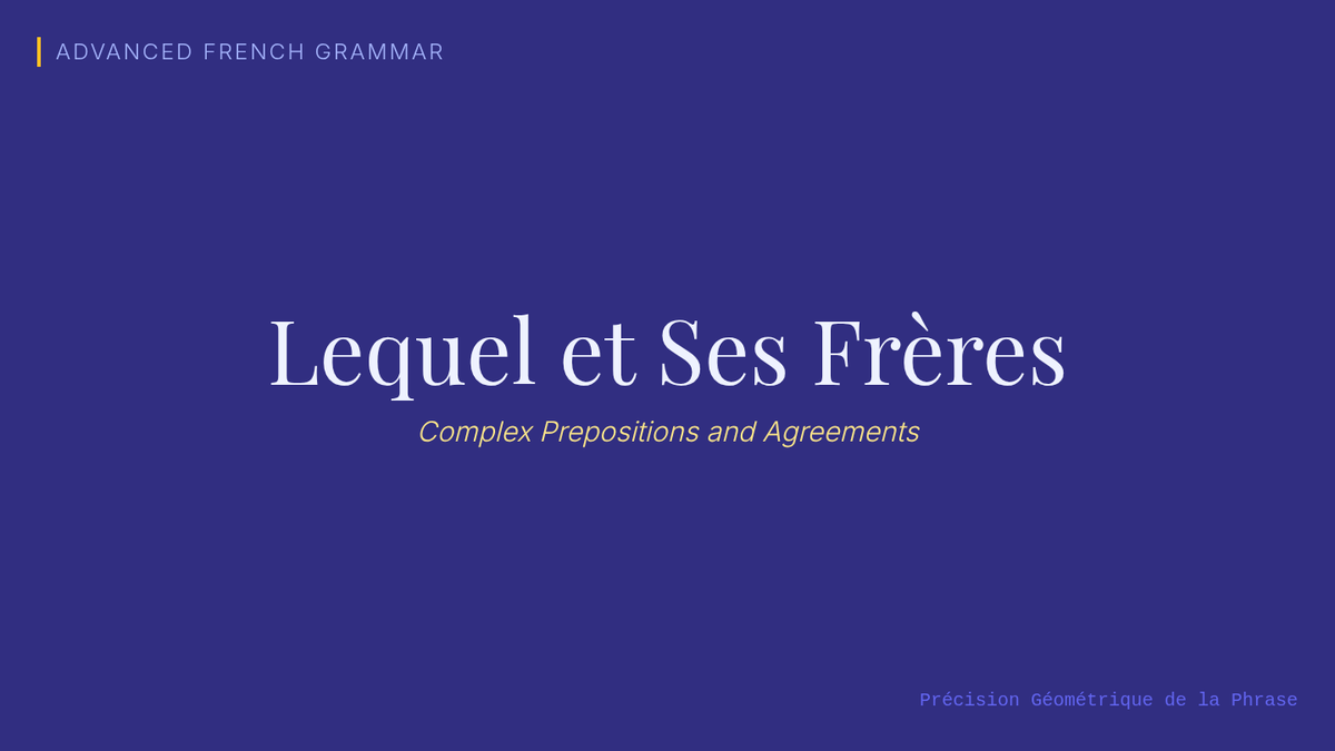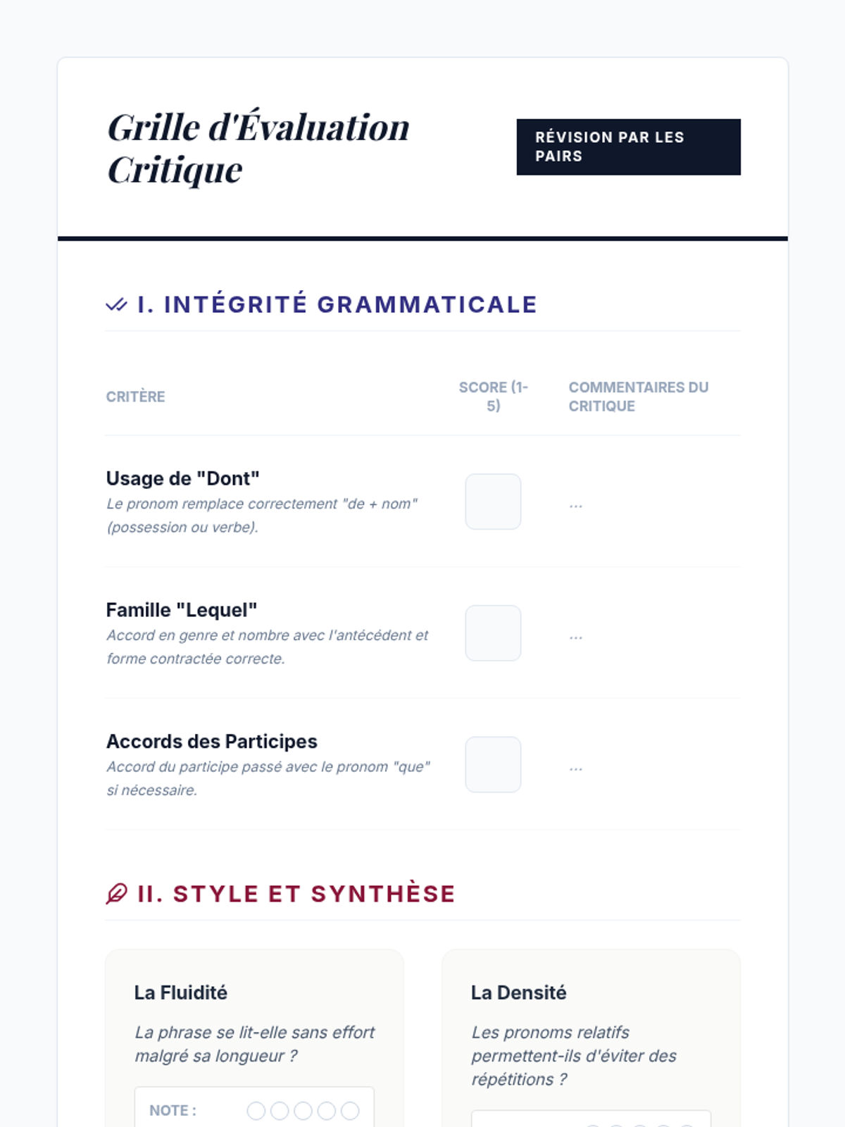 A high-level grammar sequence for 12th Grade French students focusing on the mastery of advanced relative pronouns (dont, lequel, ce qui/que/dont) to enhance syntactic complexity and academic writing maturity.