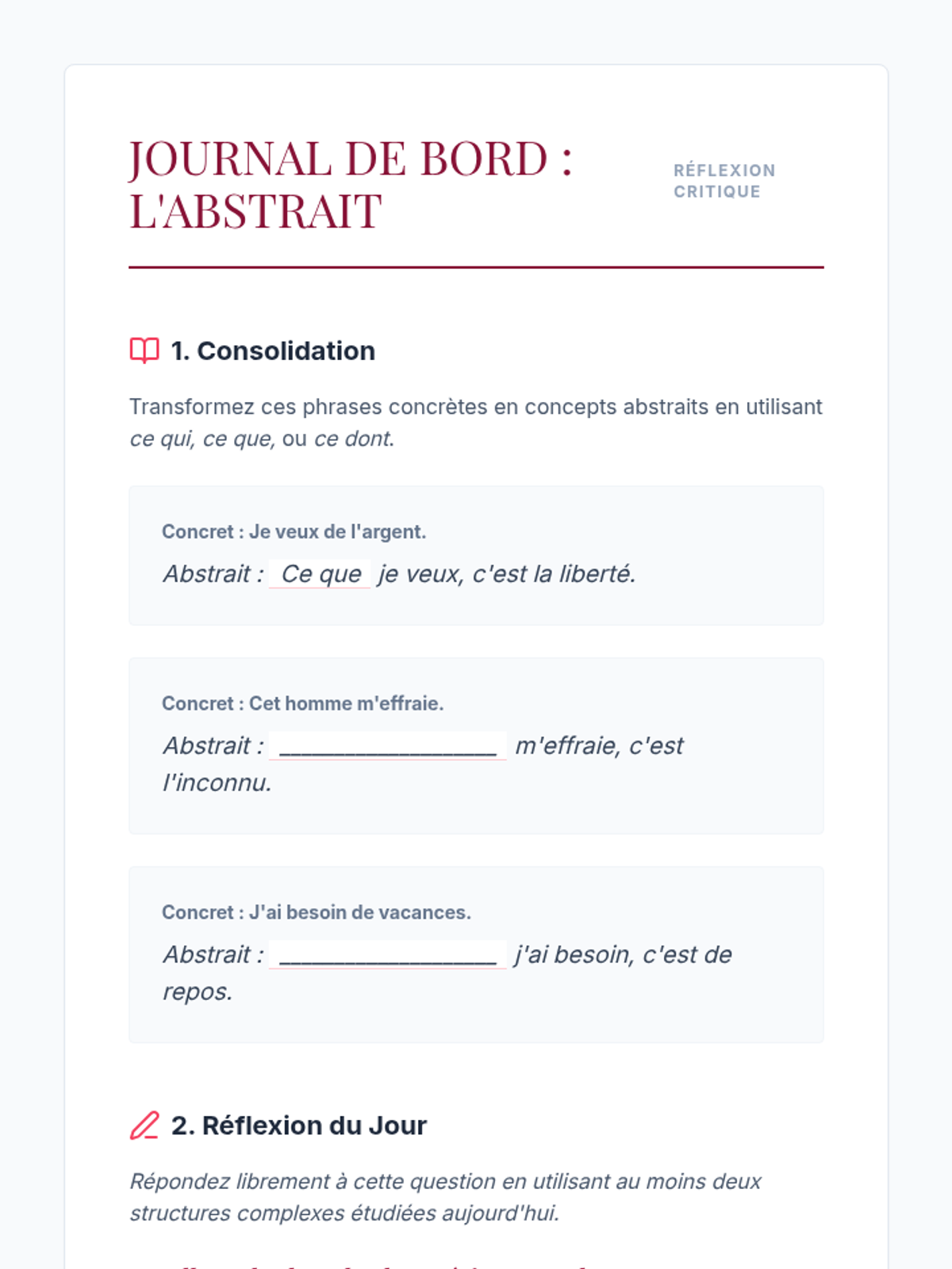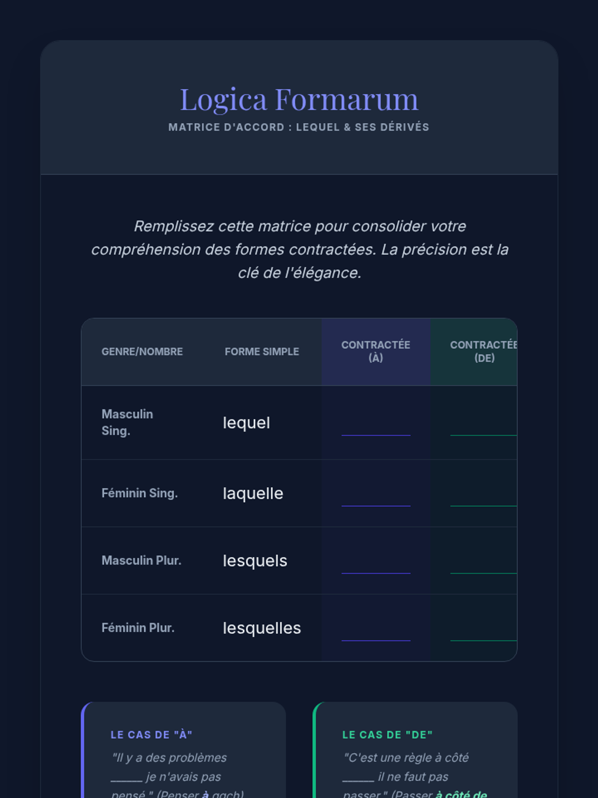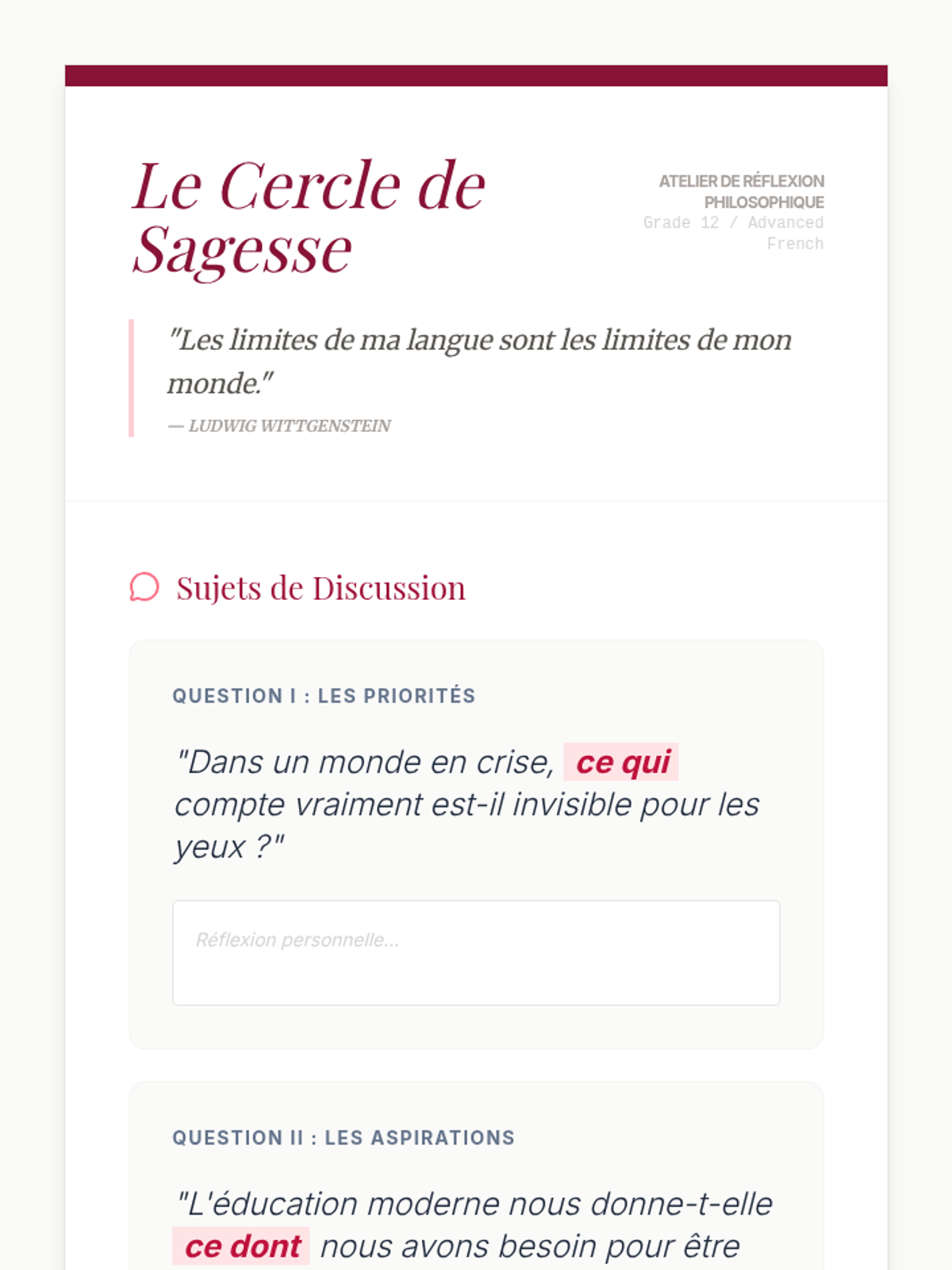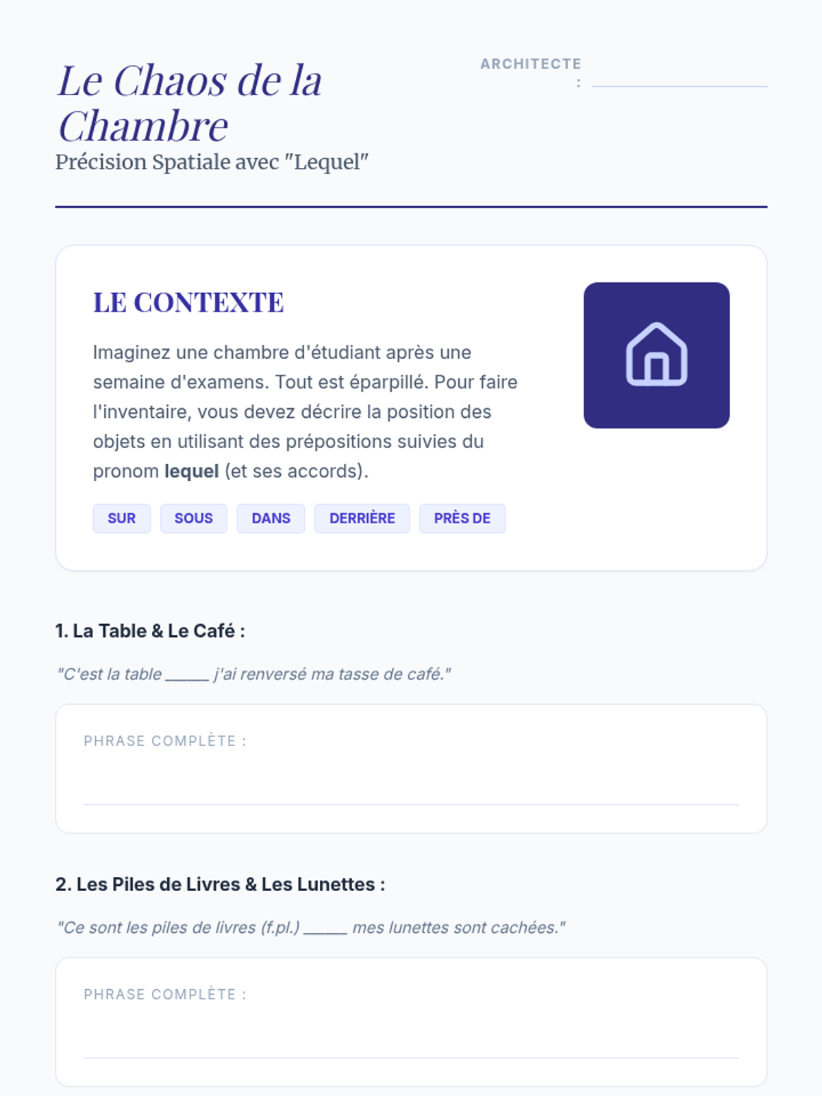 A high-level grammar sequence for 12th Grade French students focusing on the mastery of advanced relative pronouns (dont, lequel, ce qui/que/dont) to enhance syntactic complexity and academic writing maturity.