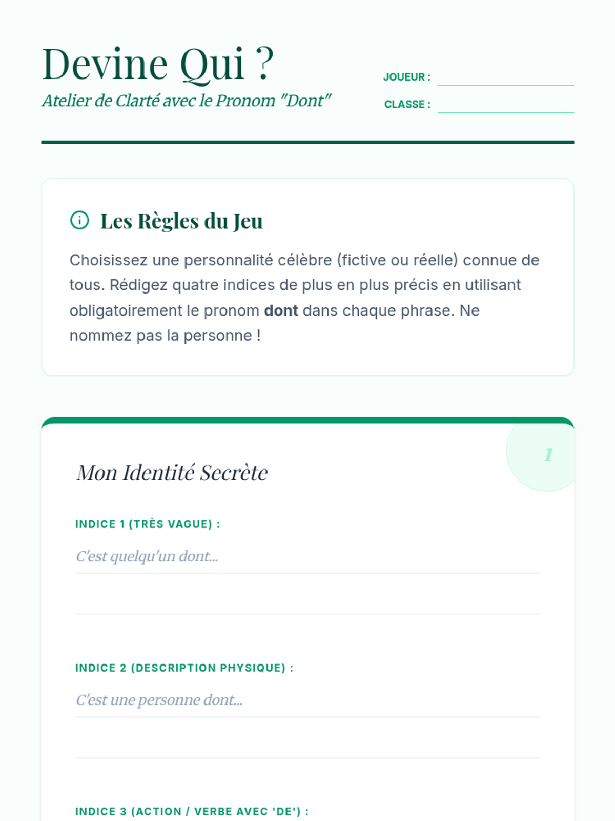 A beginner French listening sequence where students act as social observers, analyzing registers, personal details, family structures, and preferences through auditory scripts.