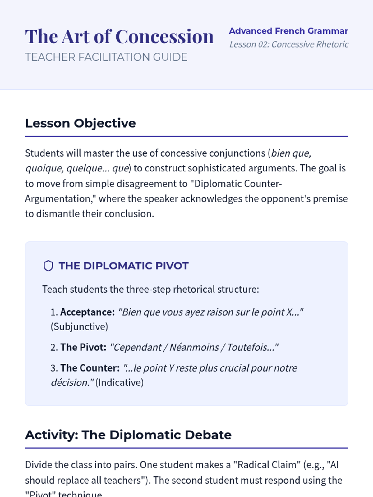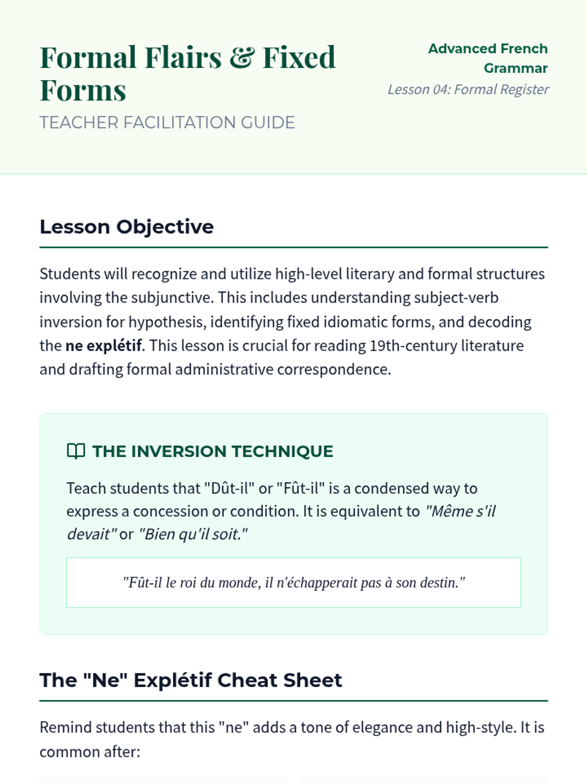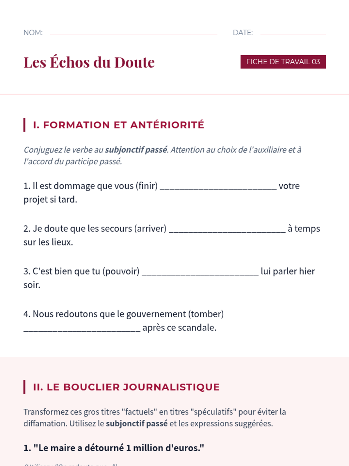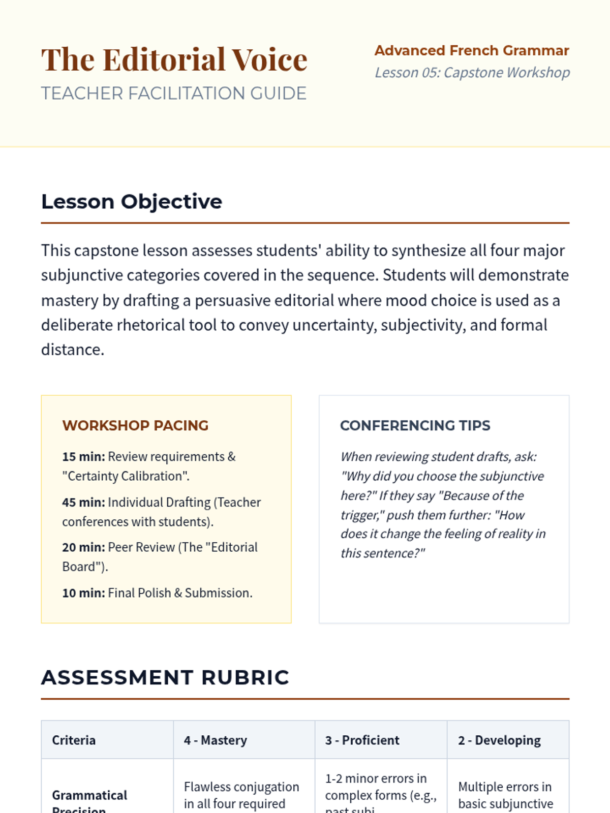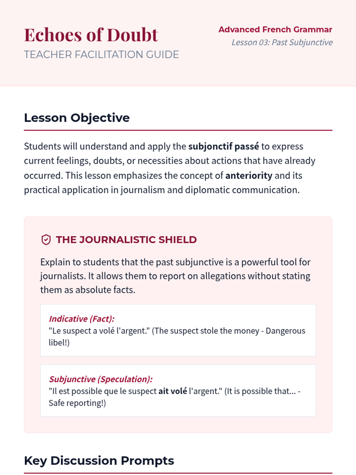 This advanced French grammar sequence explores the subtle semantic distinctions between the indicative and subjunctive moods. Students move beyond rote memorization to analyze how mood choice influences rhetoric, certainty, and subjectivity in complex composition.