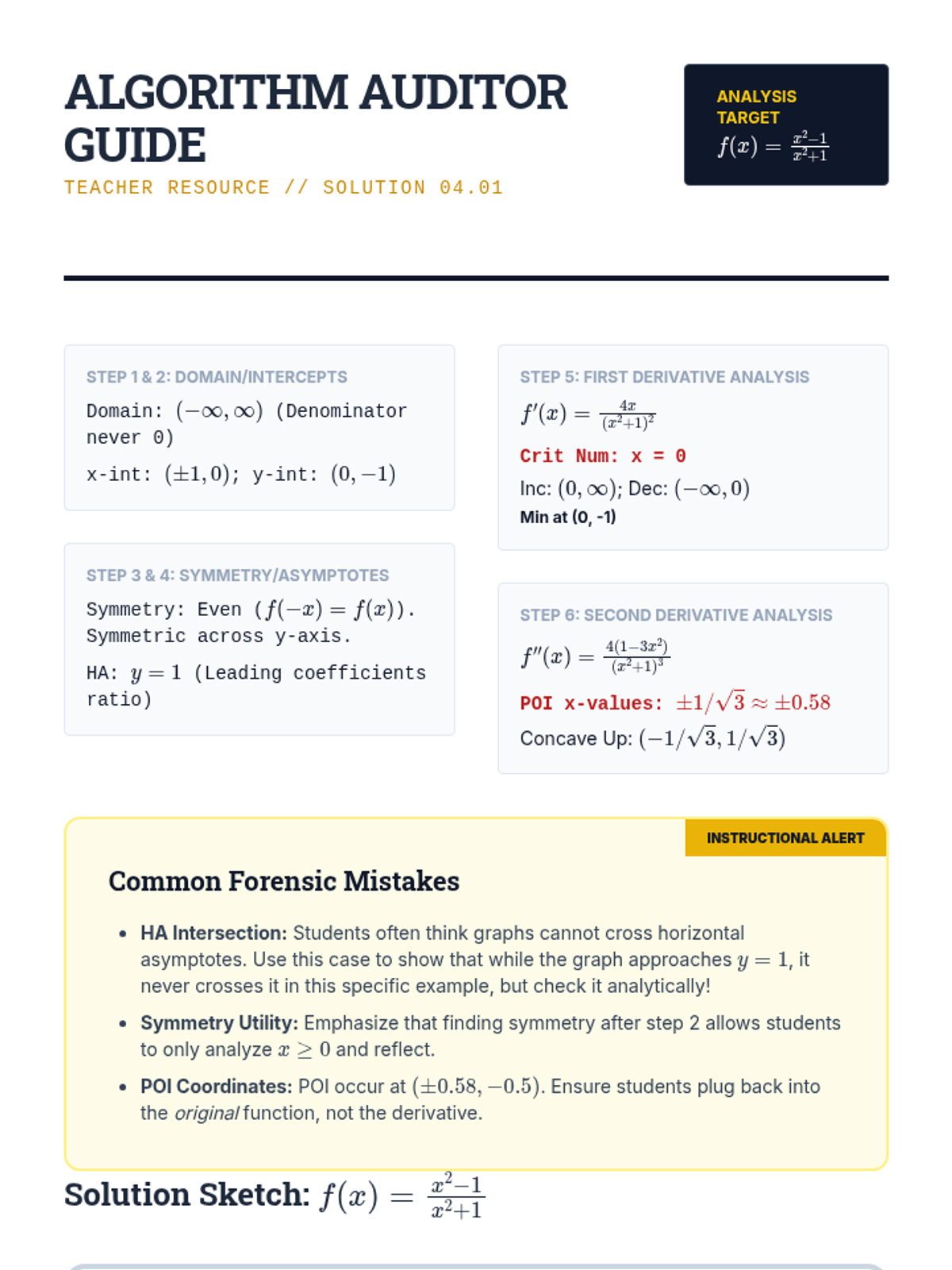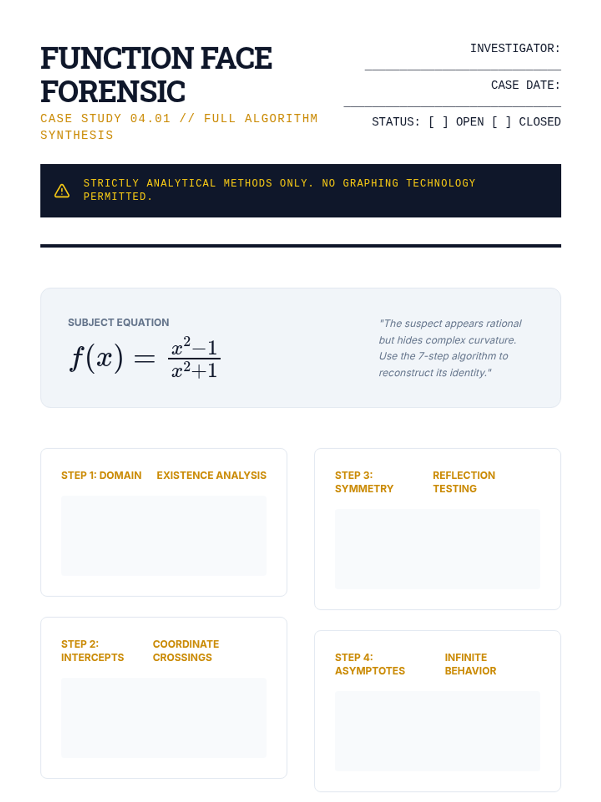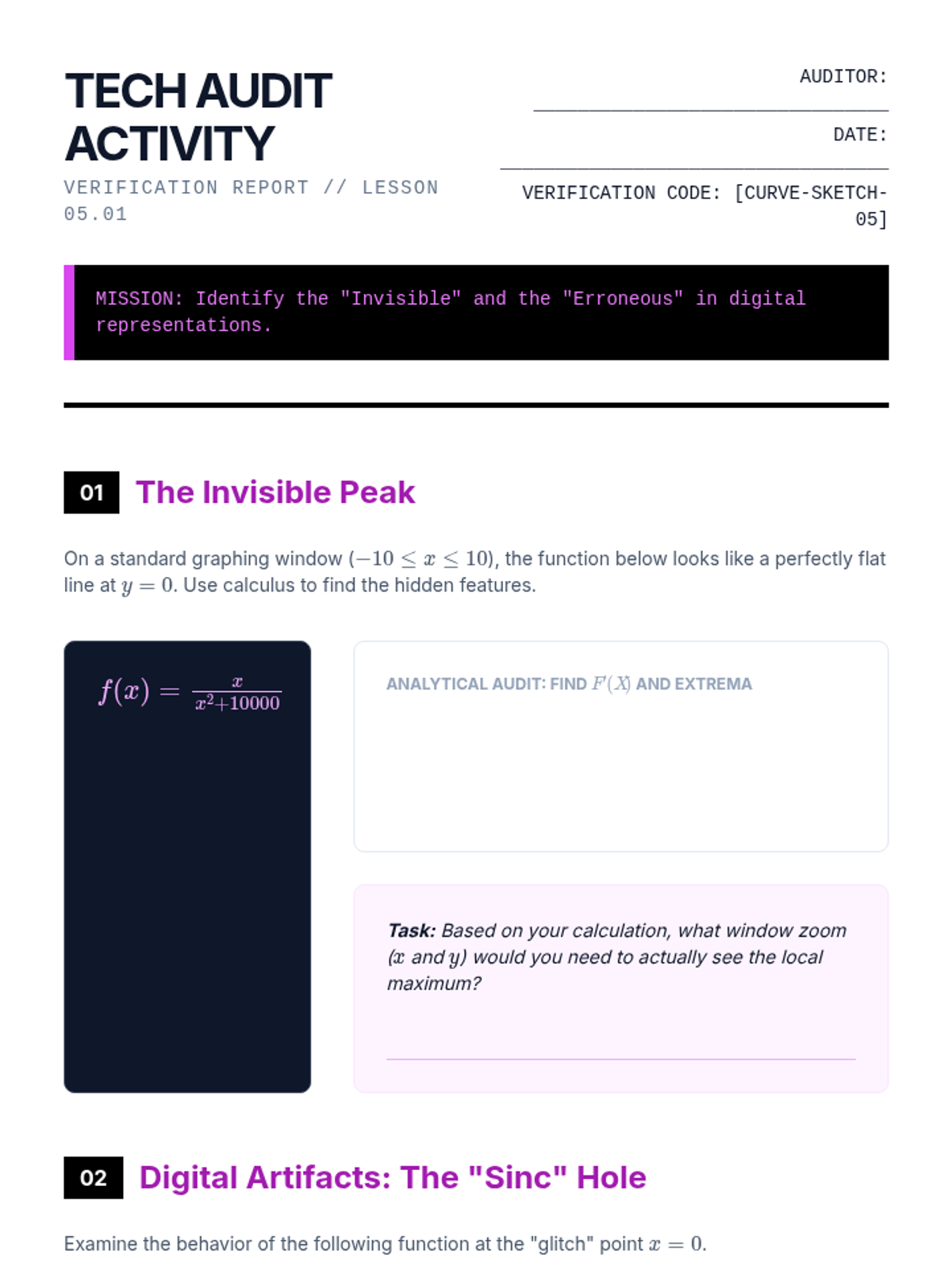 A rigorous undergraduate calculus sequence on the analytical techniques of curve sketching. Students master limits, first and second derivative tests, and asymptotic behavior to visualize complex functions without technology, culminating in a synthesis workshop and technological audit.