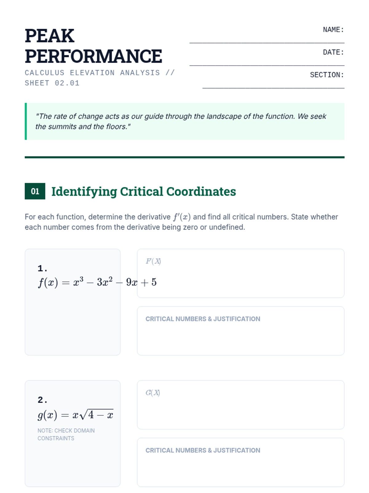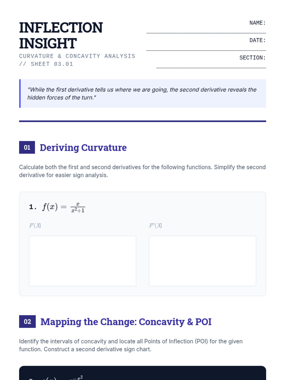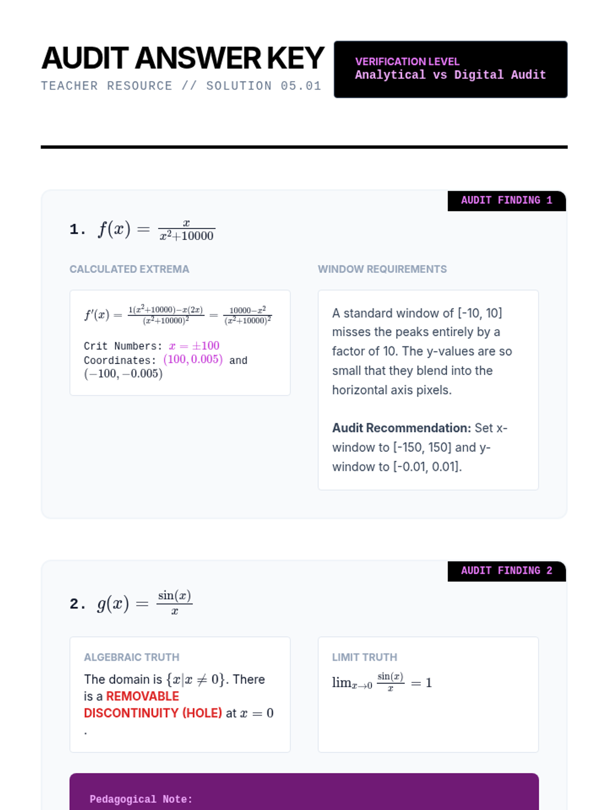 A rigorous undergraduate calculus sequence on the analytical techniques of curve sketching. Students master limits, first and second derivative tests, and asymptotic behavior to visualize complex functions without technology, culminating in a synthesis workshop and technological audit.