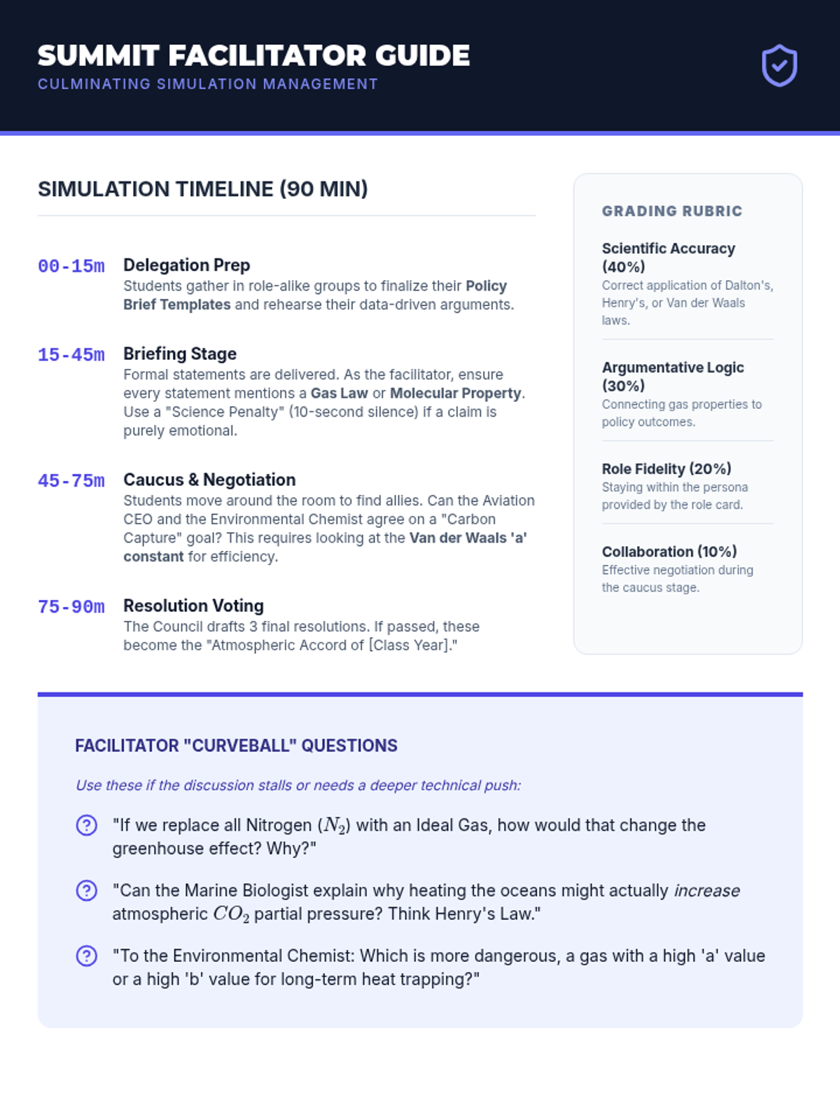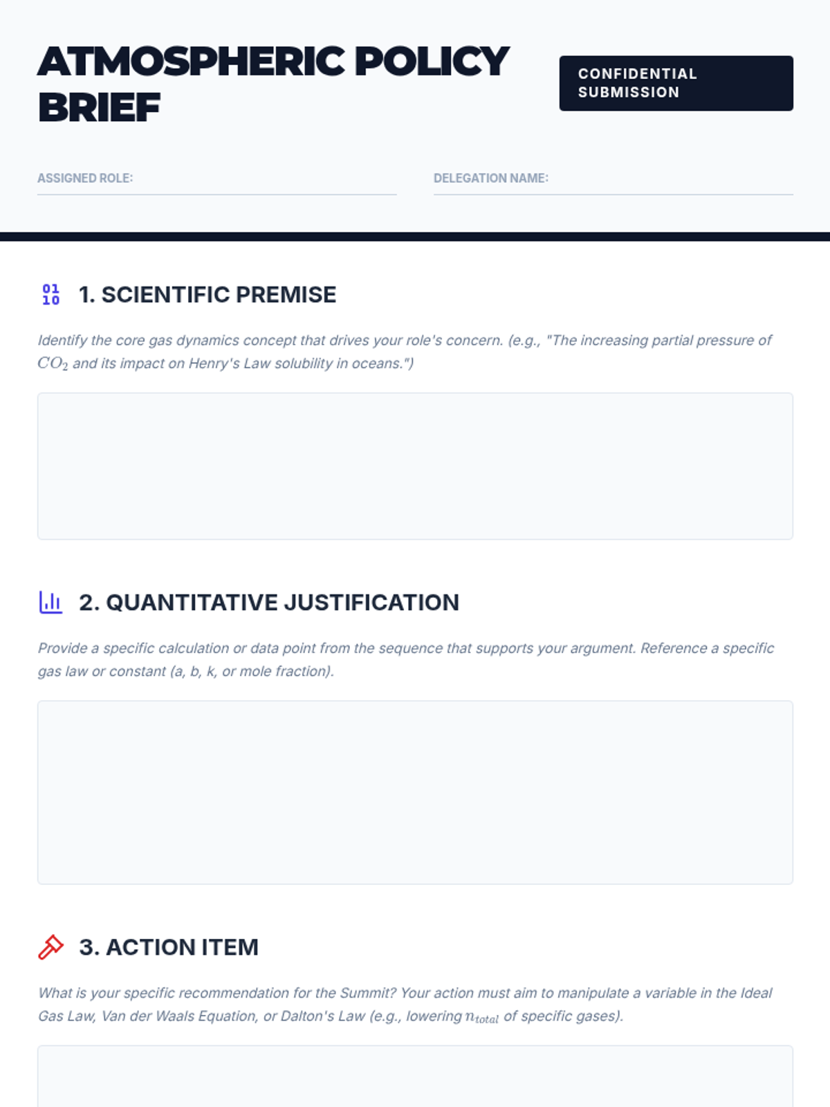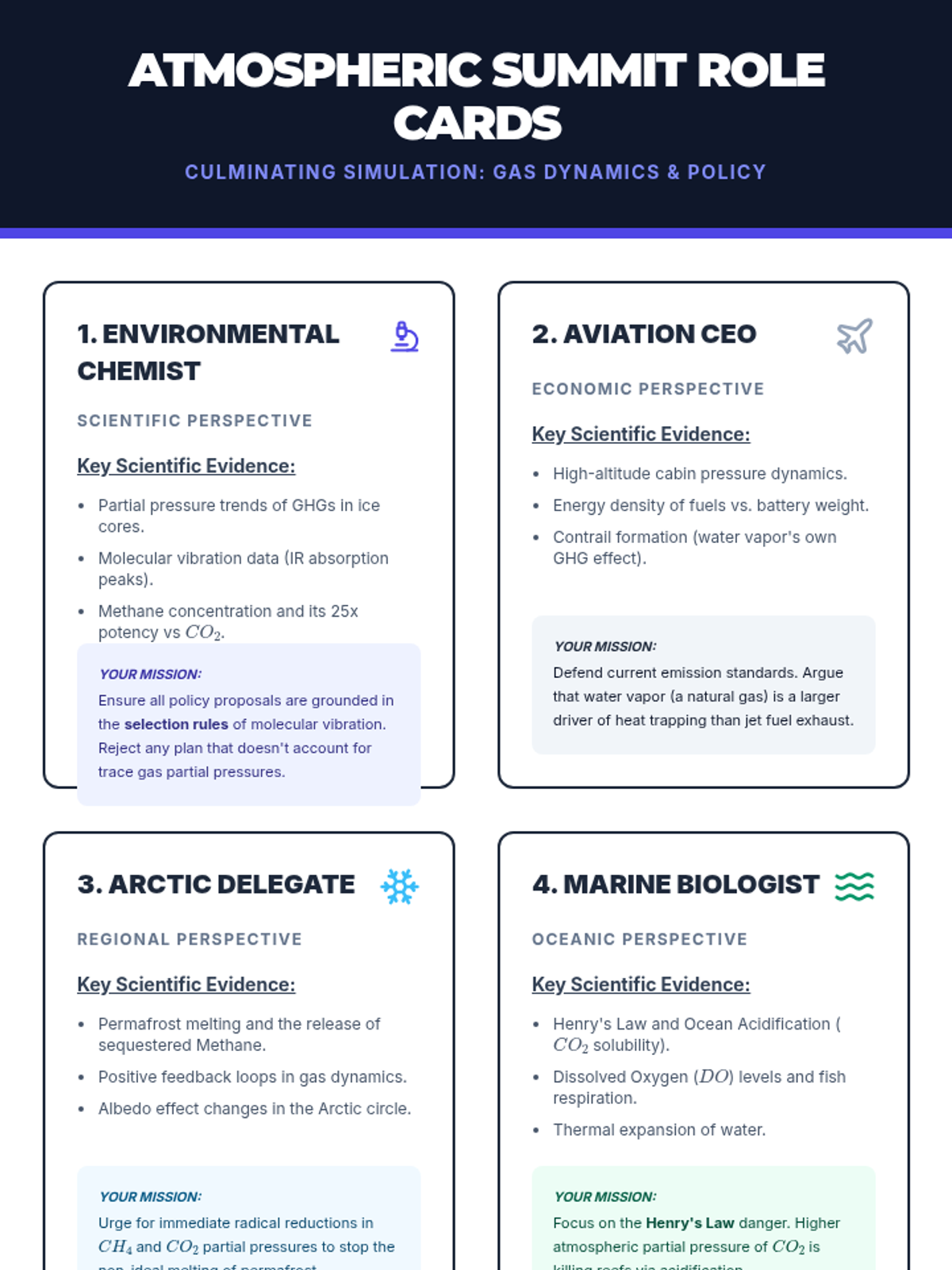 An advanced 12th-grade chemistry sequence exploring non-ideal gas behavior, partial pressures, and atmospheric applications through case studies like scuba diving and the greenhouse effect.