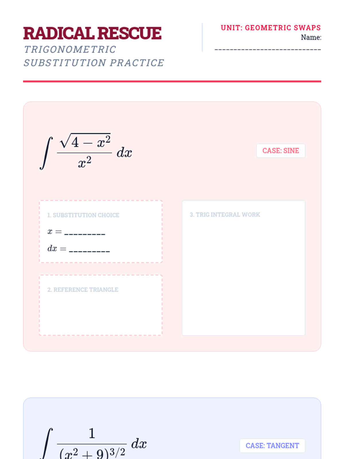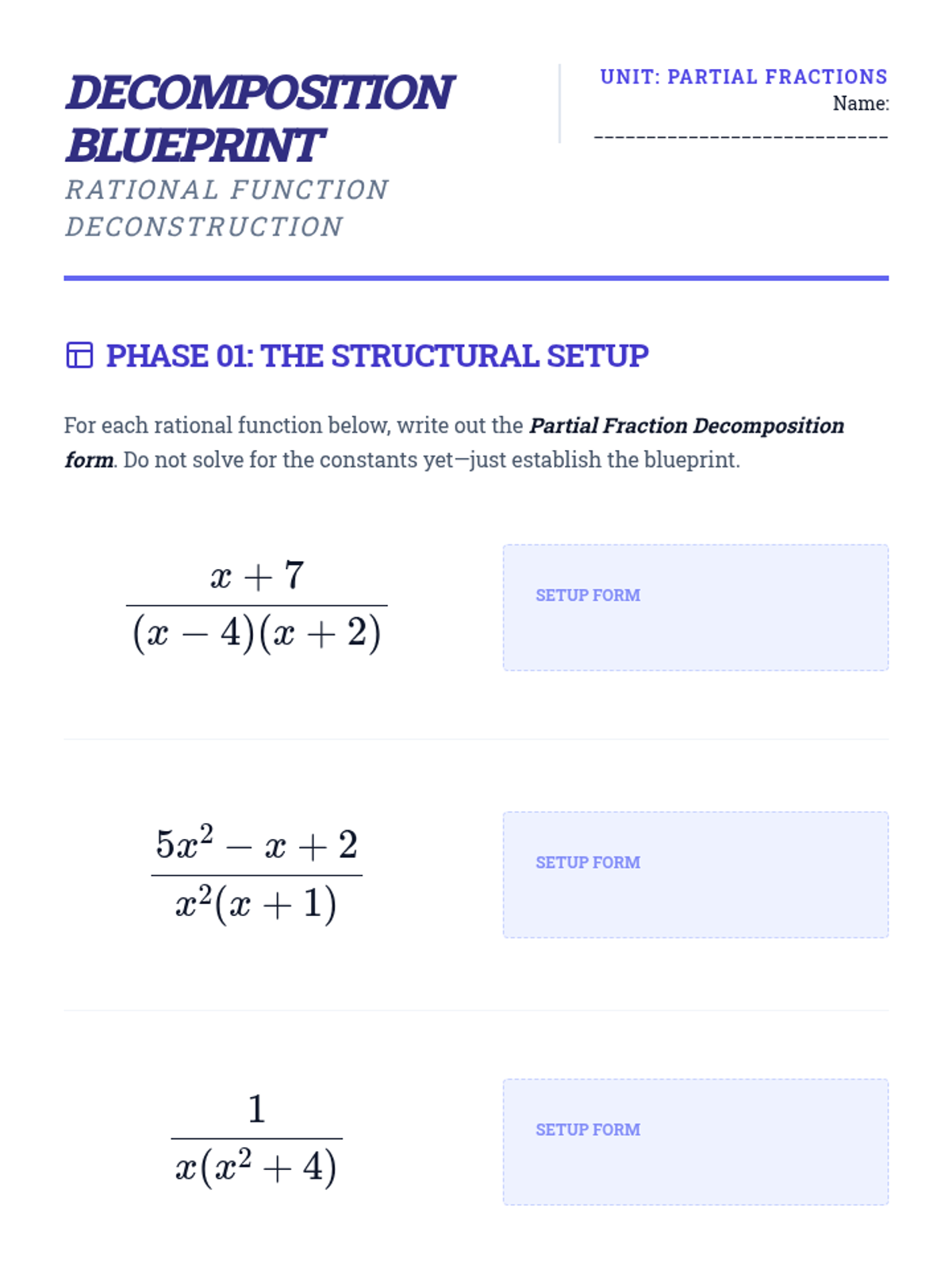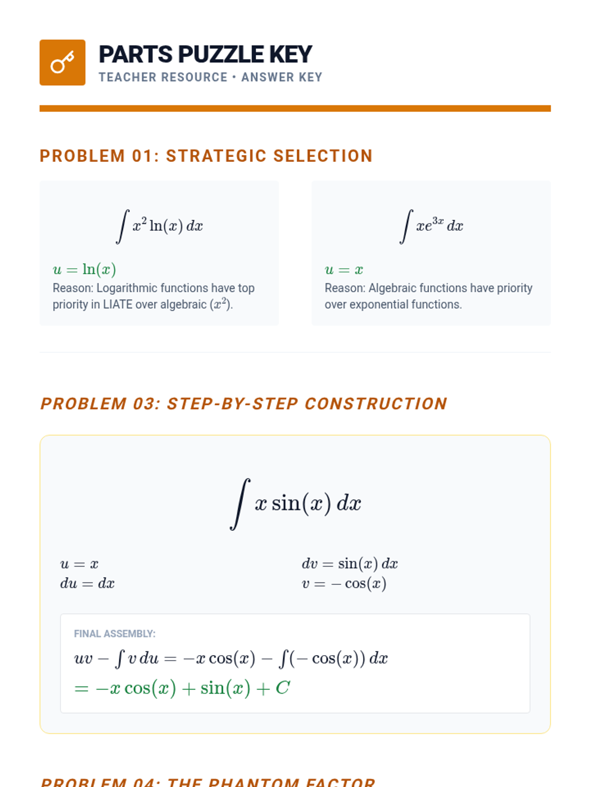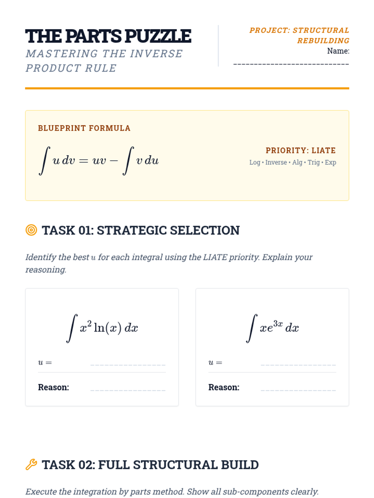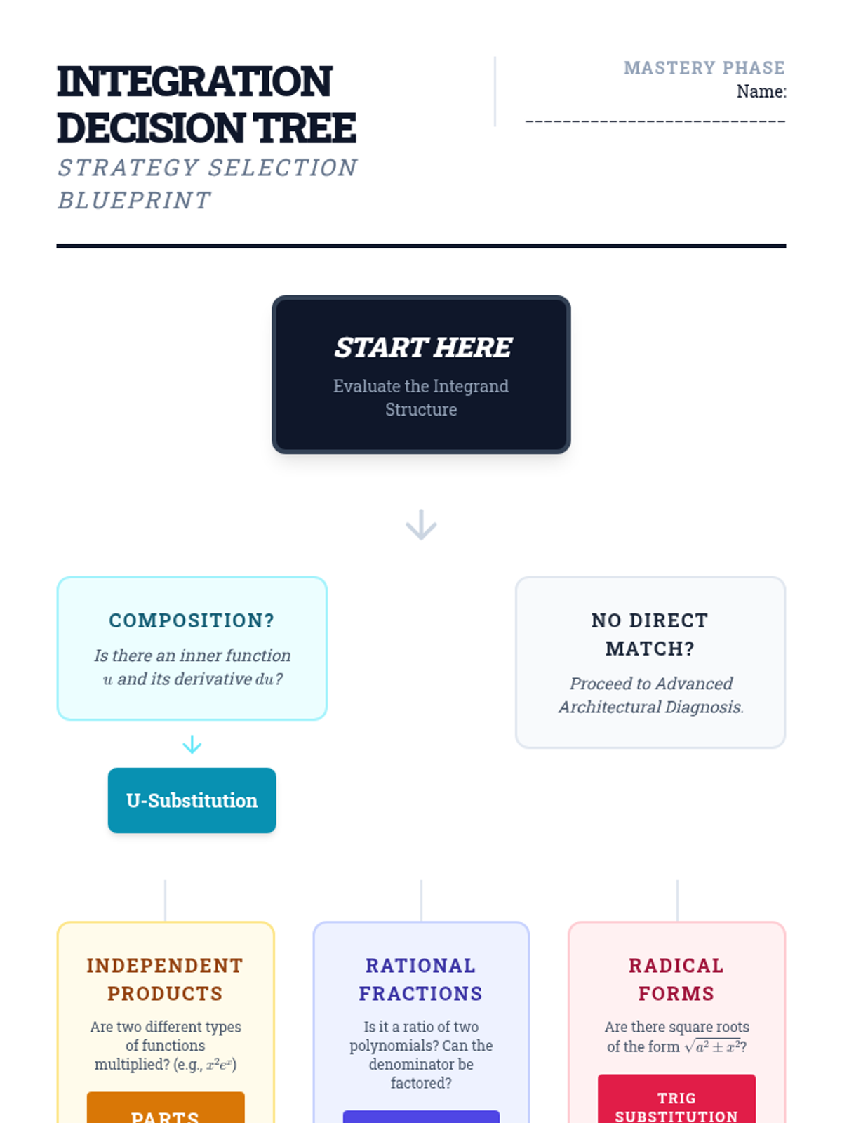 This advanced calculus sequence guides students through the systematic application of complex integration techniques including integration by parts, partial fractions, and trigonometric substitution. Students move from basic antiderivatives to analyzing the algebraic structure of functions to determine the most efficient solution pathway.