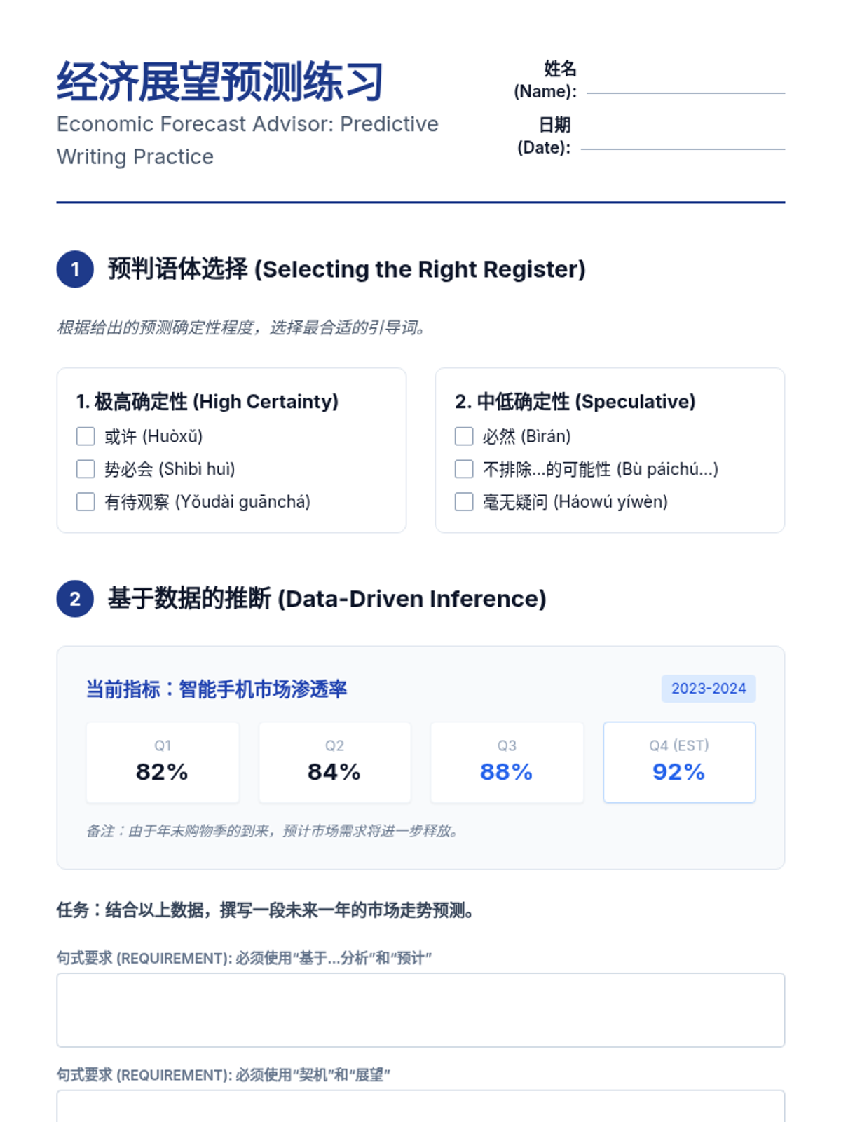 A graduate-level Mandarin Chinese sequence focusing on advanced data interpretation and analysis. Students learn the technical lexicon and complex syntax required to describe, compare, and analyze quantitative data in professional and academic Chinese contexts.