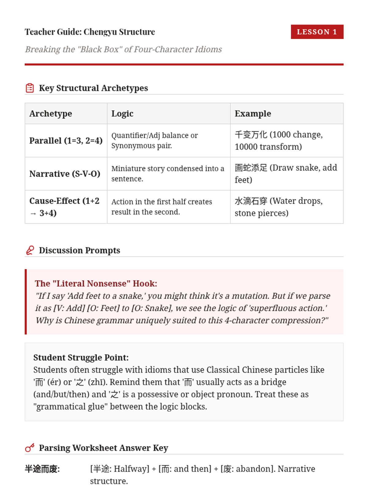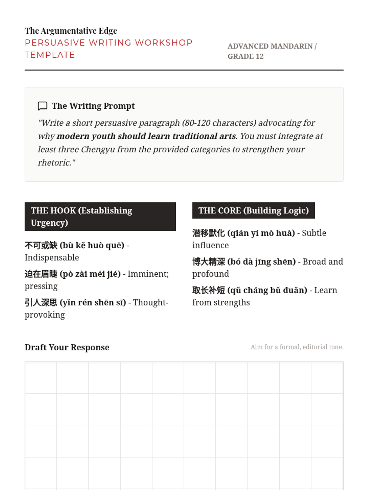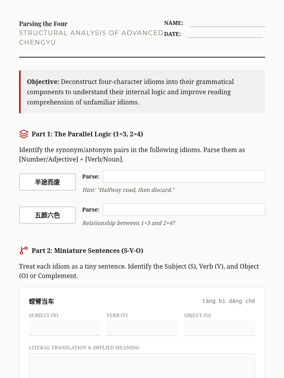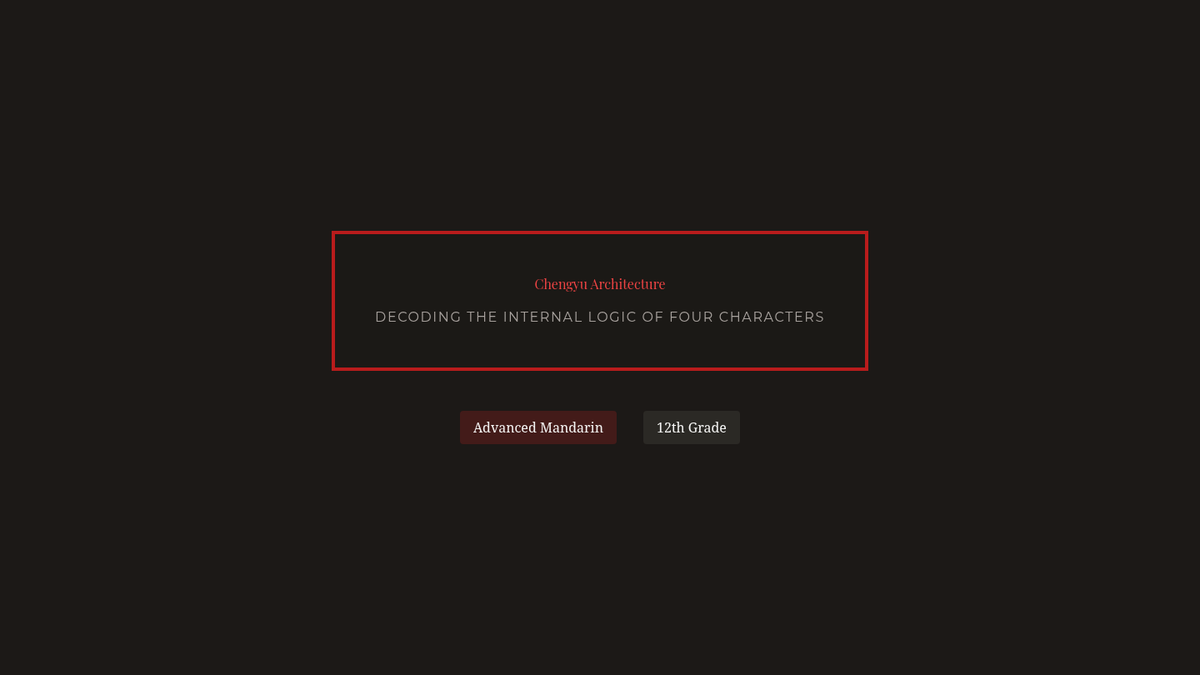 A comprehensive 12th-grade sequence exploring the grammatical structure, historical origins, and rhetorical application of advanced Mandarin Chinese idioms (Chengyu). Students progress from structural parsing to creative adaptation in modern media.