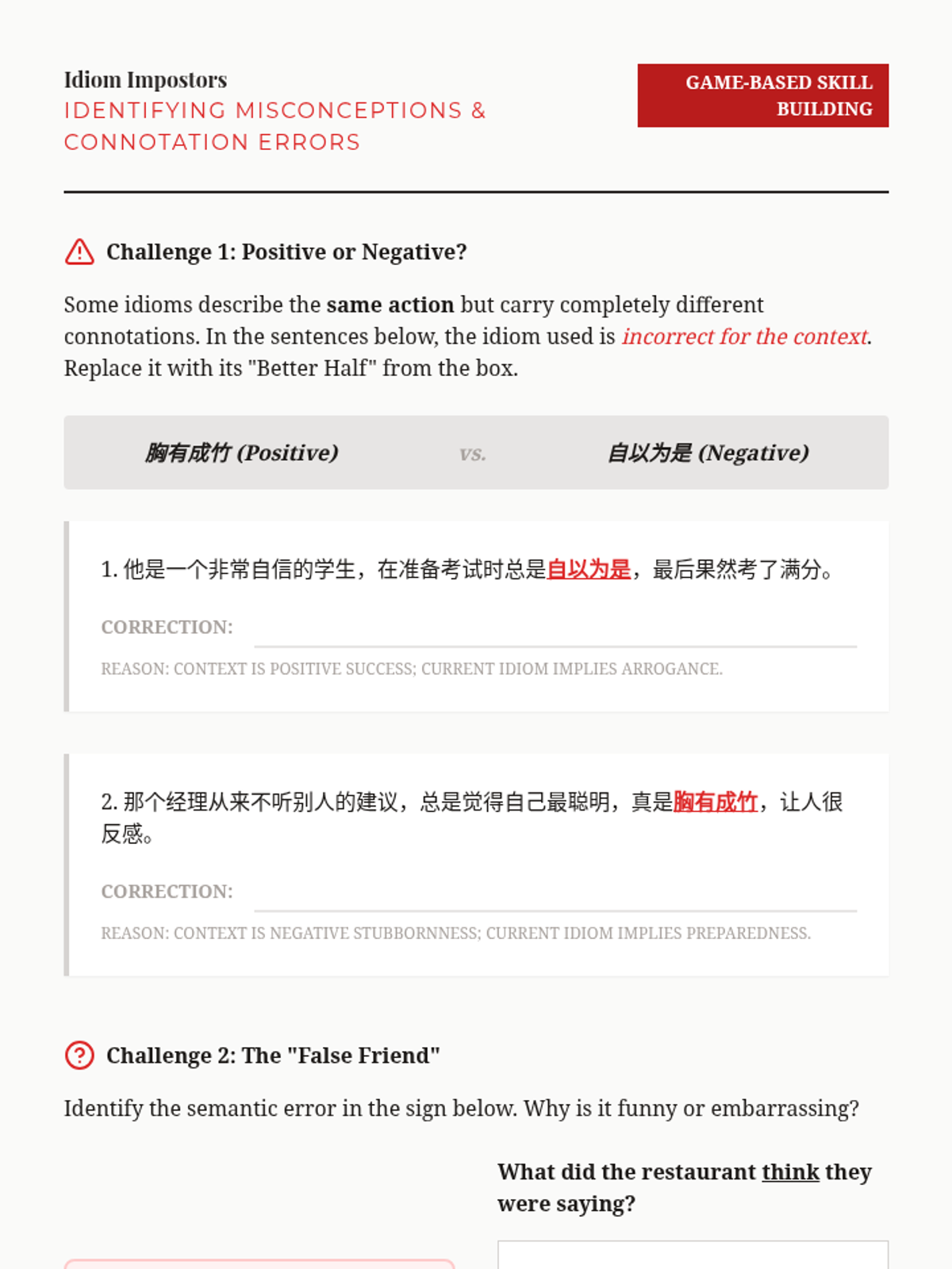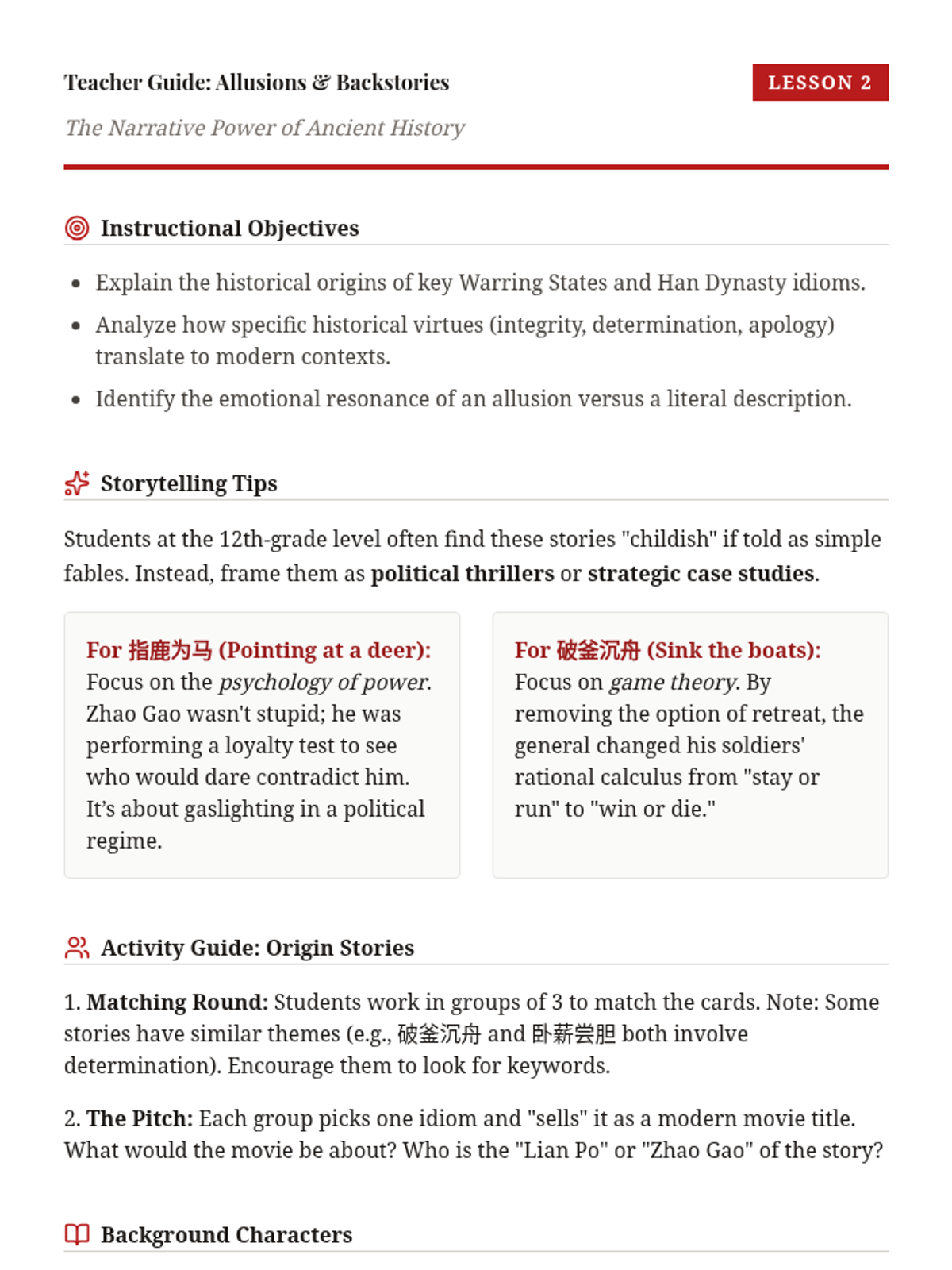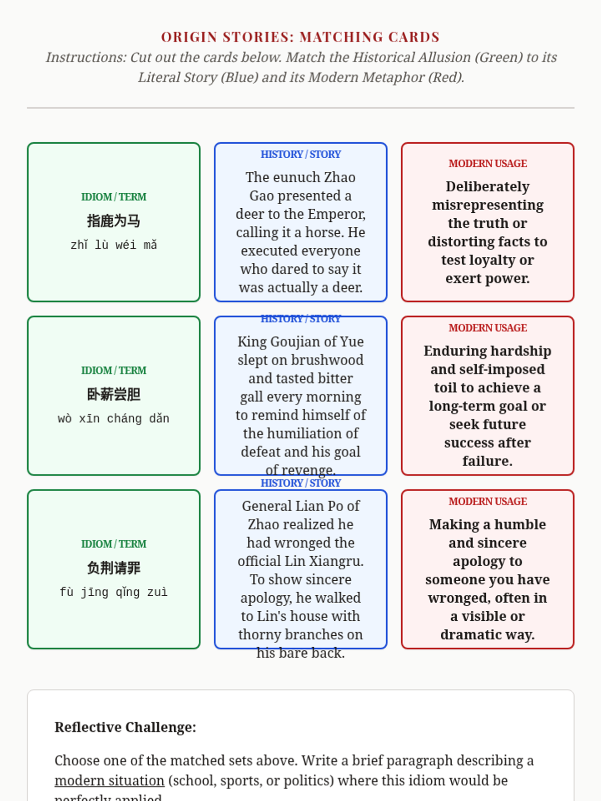 A comprehensive 12th-grade sequence exploring the grammatical structure, historical origins, and rhetorical application of advanced Mandarin Chinese idioms (Chengyu). Students progress from structural parsing to creative adaptation in modern media.