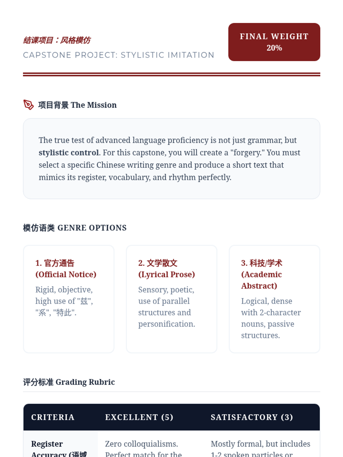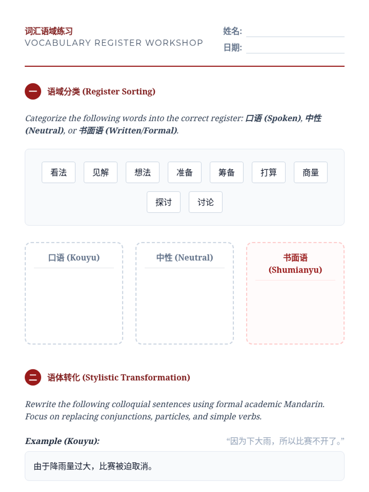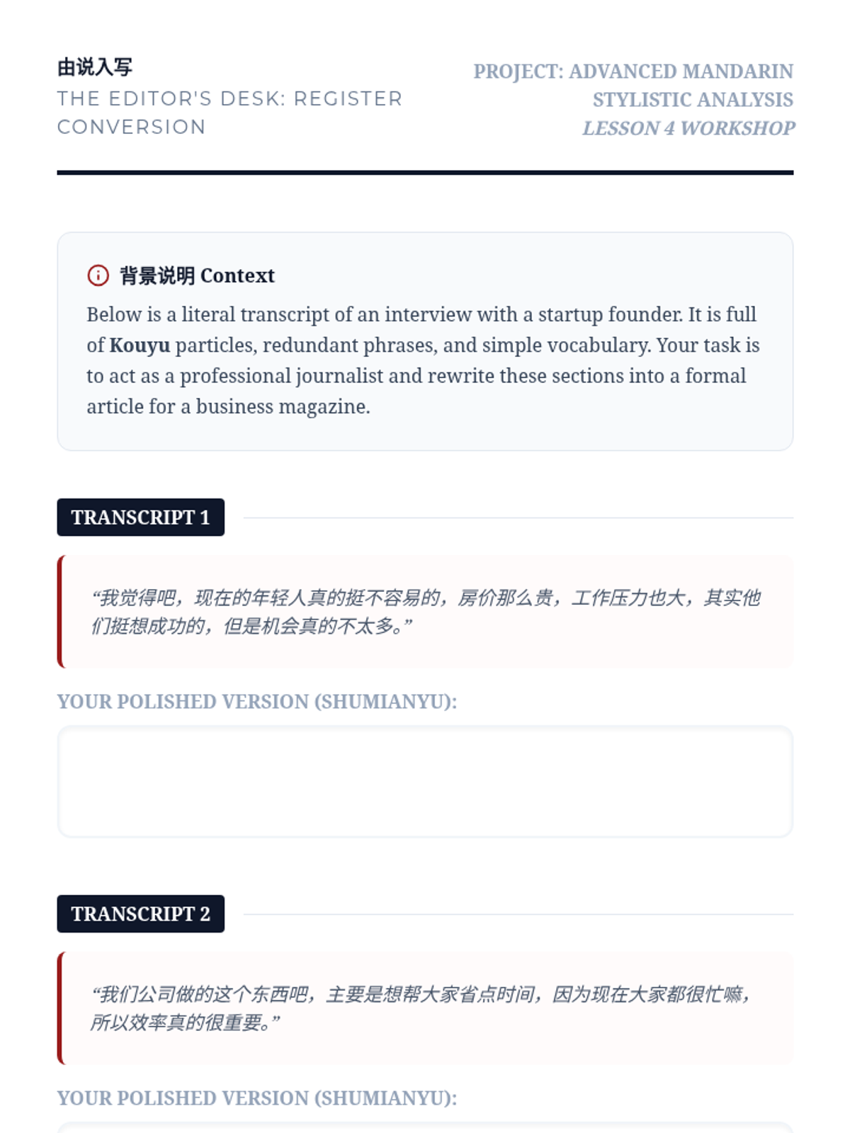 An advanced Mandarin Chinese sequence focusing on the distinction between spoken (kouyu) and written (shumianyu) registers. Students analyze texts, practice formal correspondence, and develop stylistic flexibility for high-level professional and academic contexts.