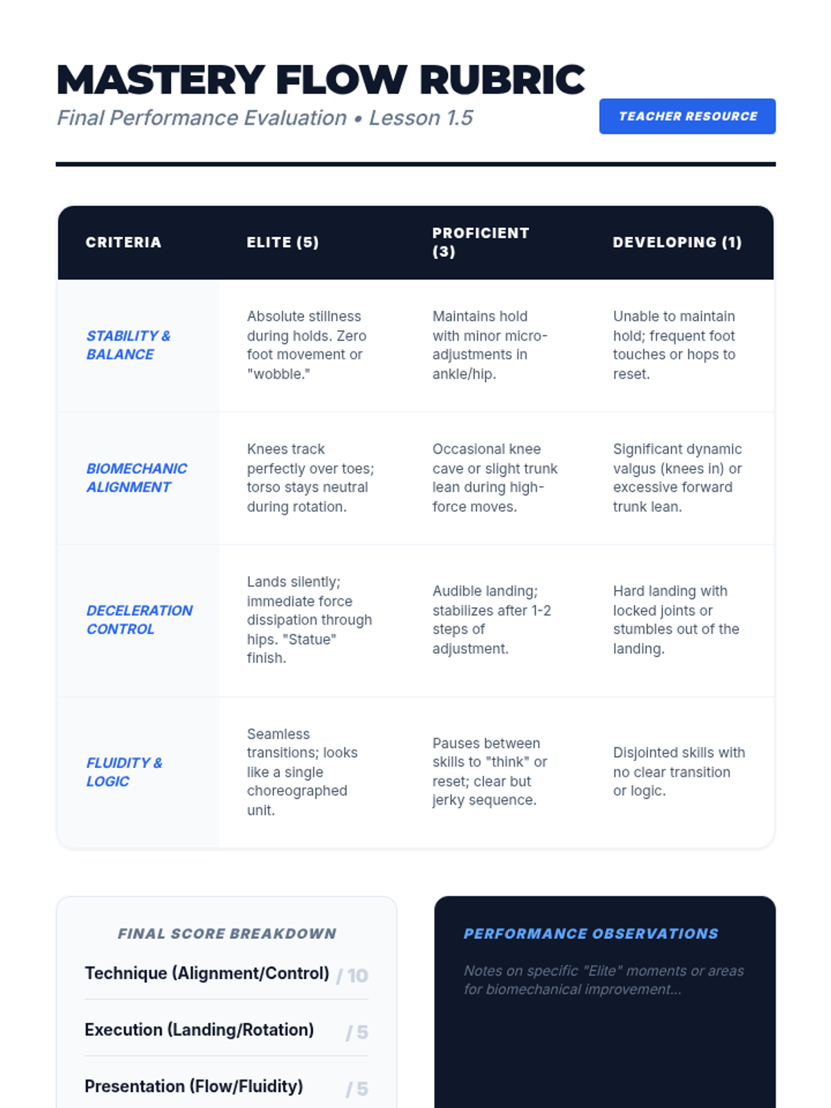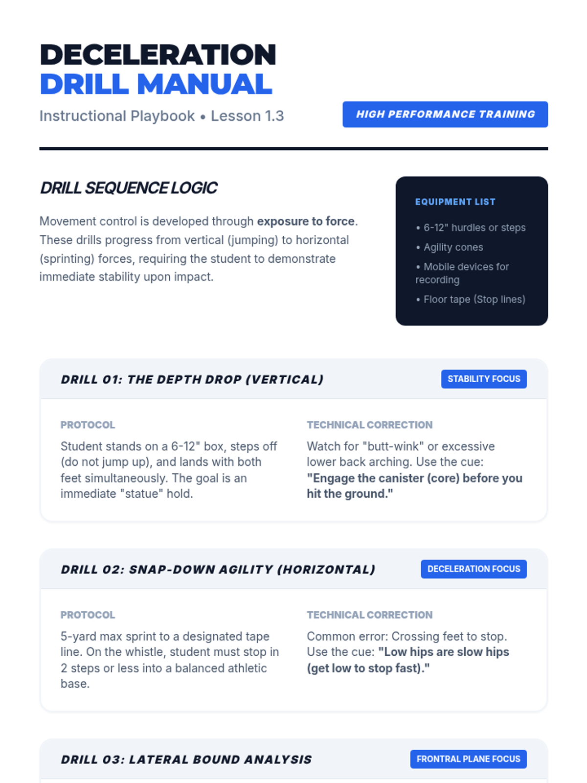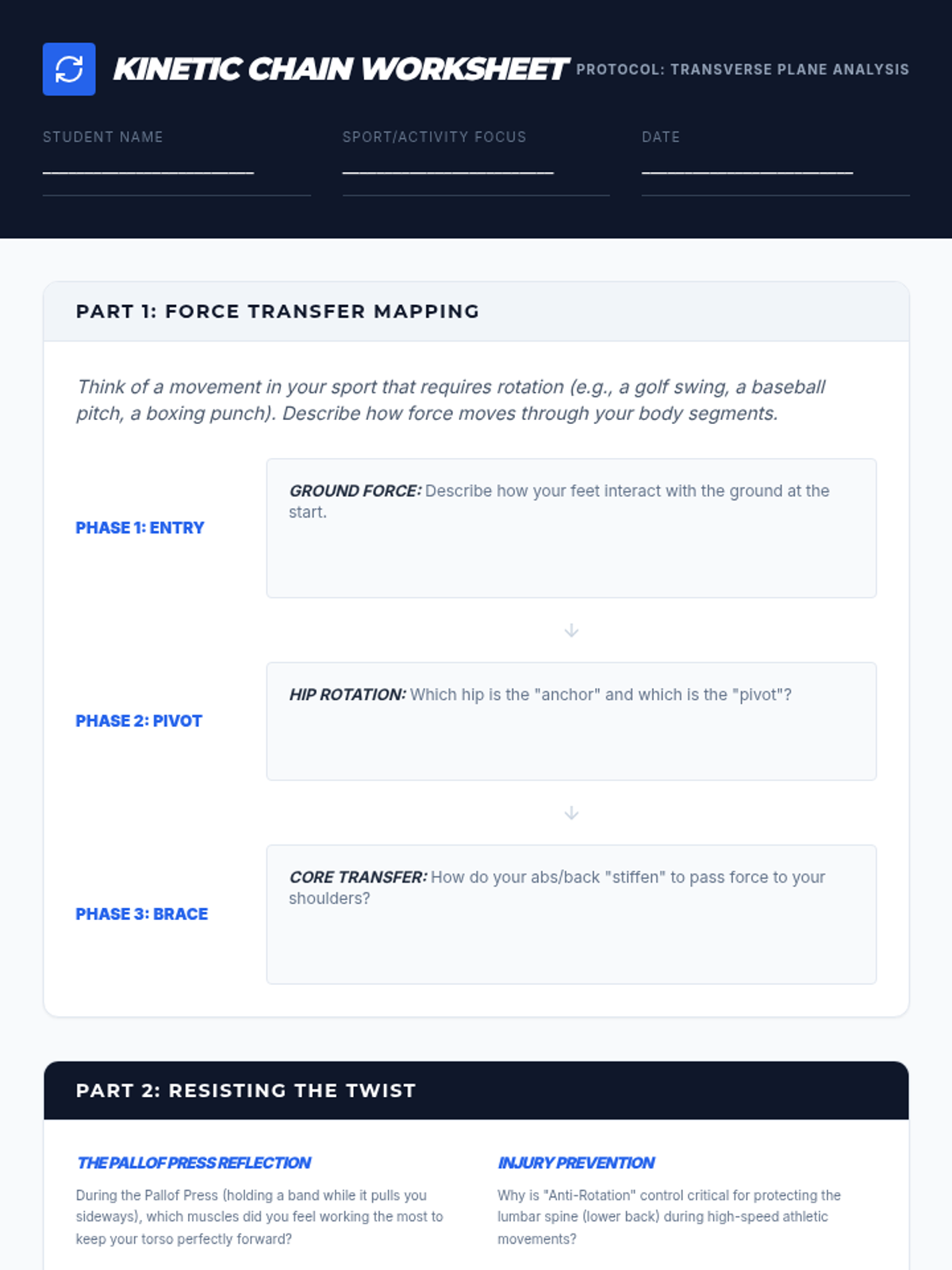 This sequence explores advanced neuromuscular control, focusing on the kinetic chain, core stability, and dynamic balance. Students progress from anatomical understanding to complex functional movement patterns designed to enhance athletic performance and prevent injury.