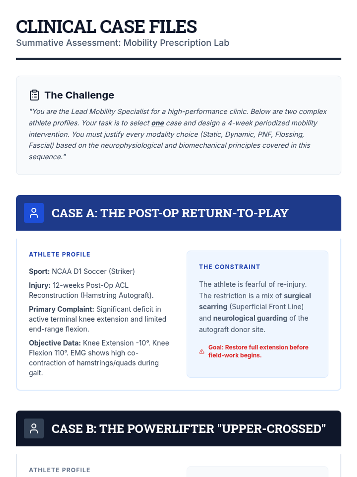 An advanced graduate-level sequence exploring the neurophysiological mechanisms, biomechanical principles, and evidence-based programming for flexibility and mobility in elite and clinical populations.