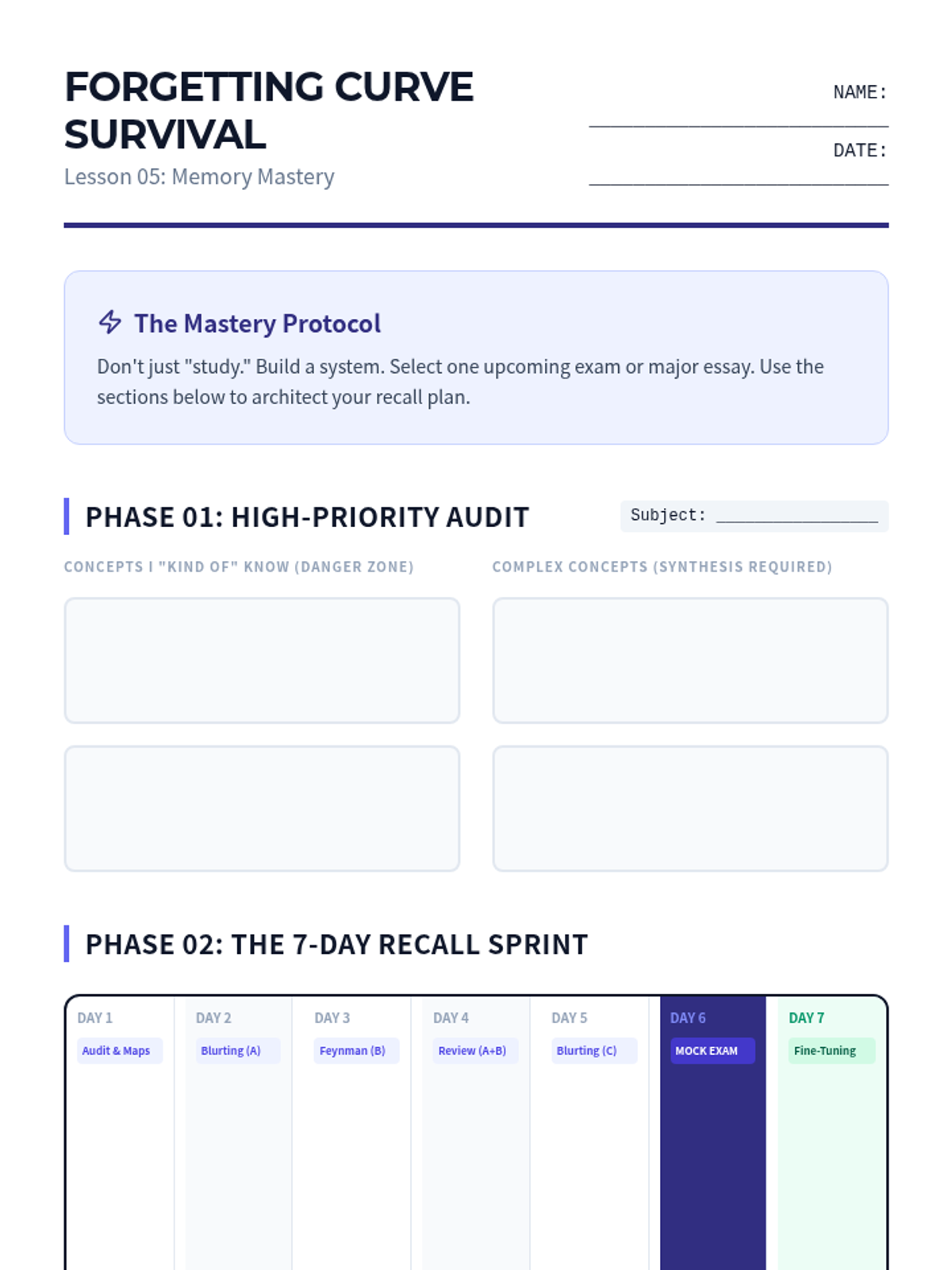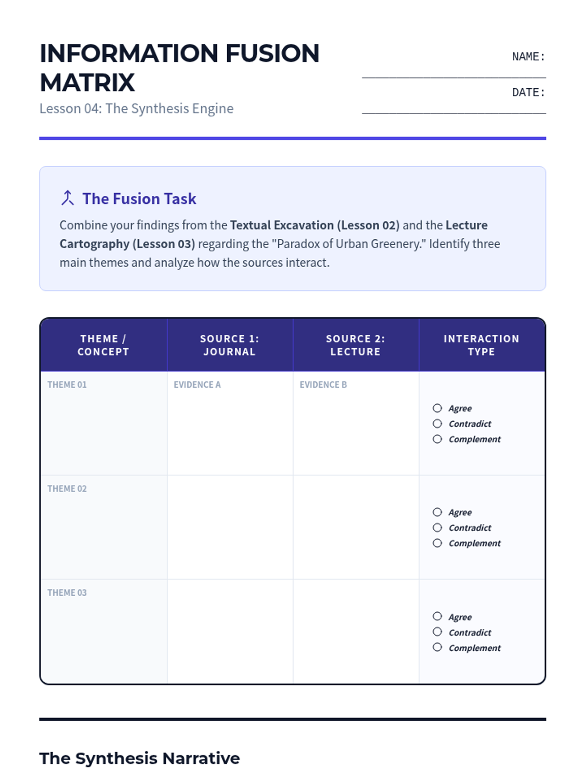 This sequence guides undergraduate students through the critical transition from passive information consumption to active academic synthesis. Students will master note-taking systems, active reading strategies, auditory analysis of lectures, and multi-source synthesis, culminating in a personalized mastery plan based on active recall principles.
