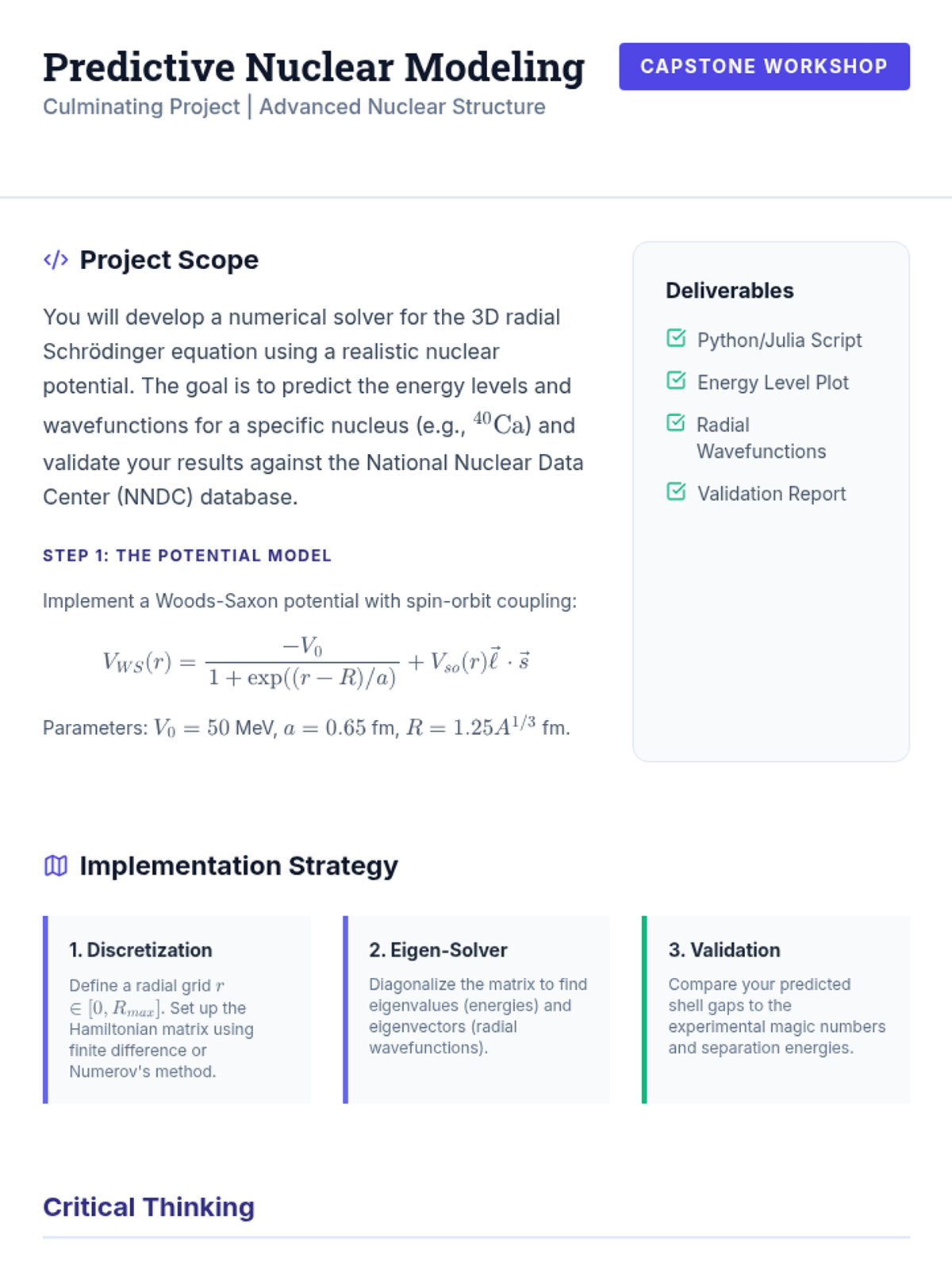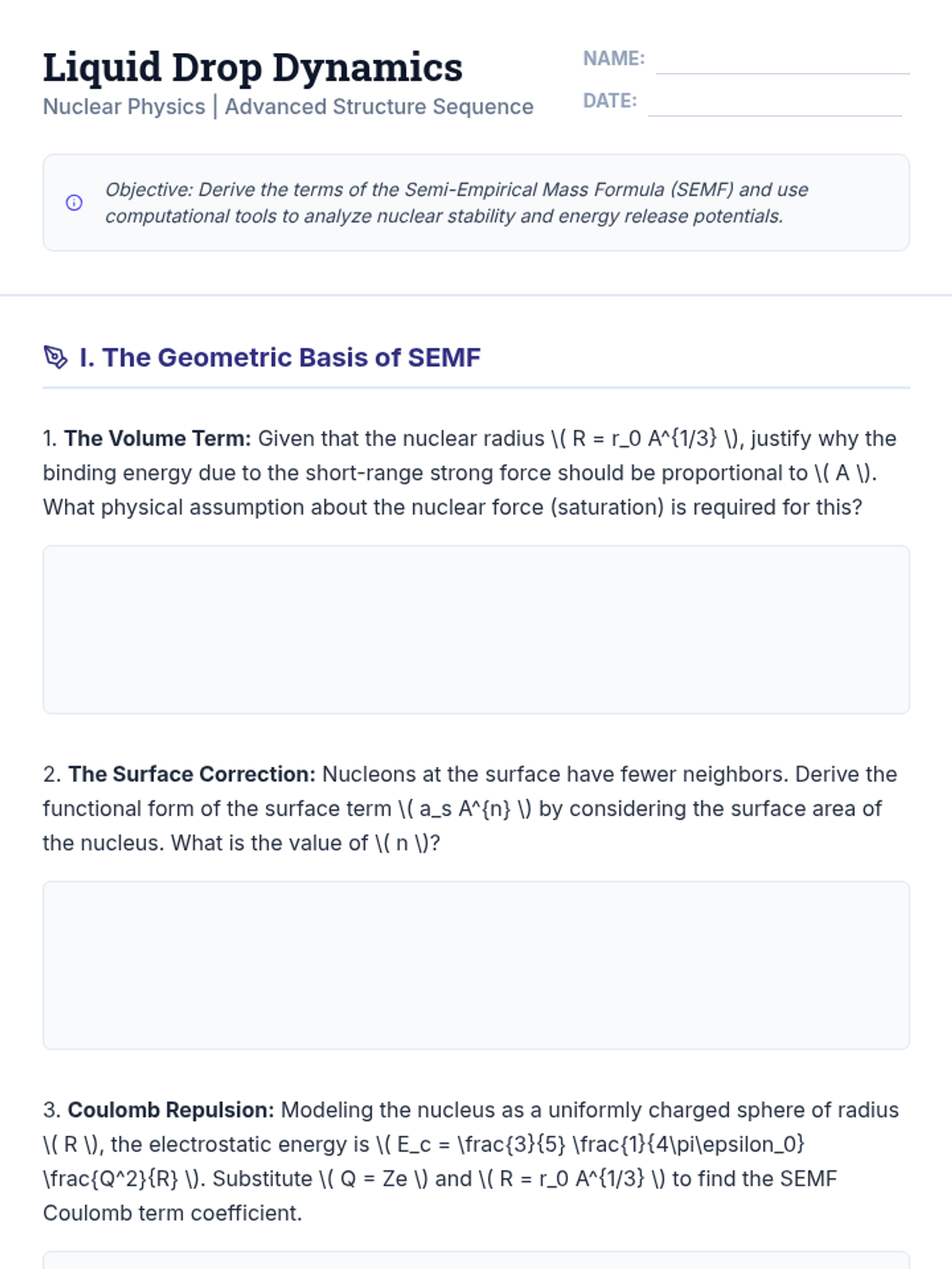 This advanced sequence for graduate students explores the theoretical and computational frameworks of nuclear physics, from semi-empirical models to ab initio Hartree-Fock methods. Students will bridge the gap between macroscopic liquid drop analogies and microscopic quantum descriptions through mathematical derivation and computational modeling.