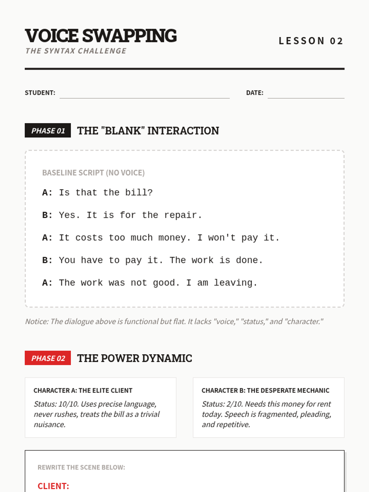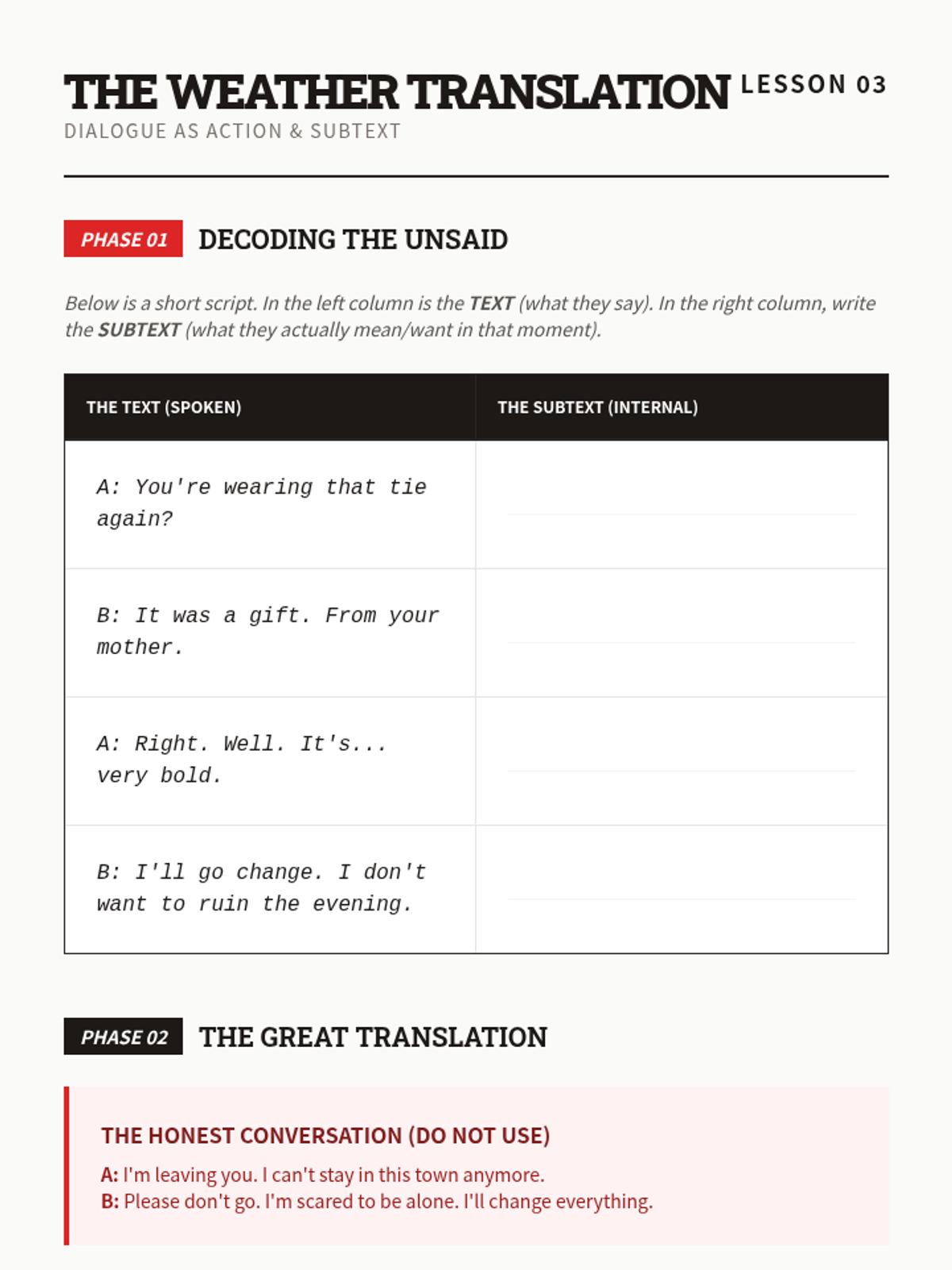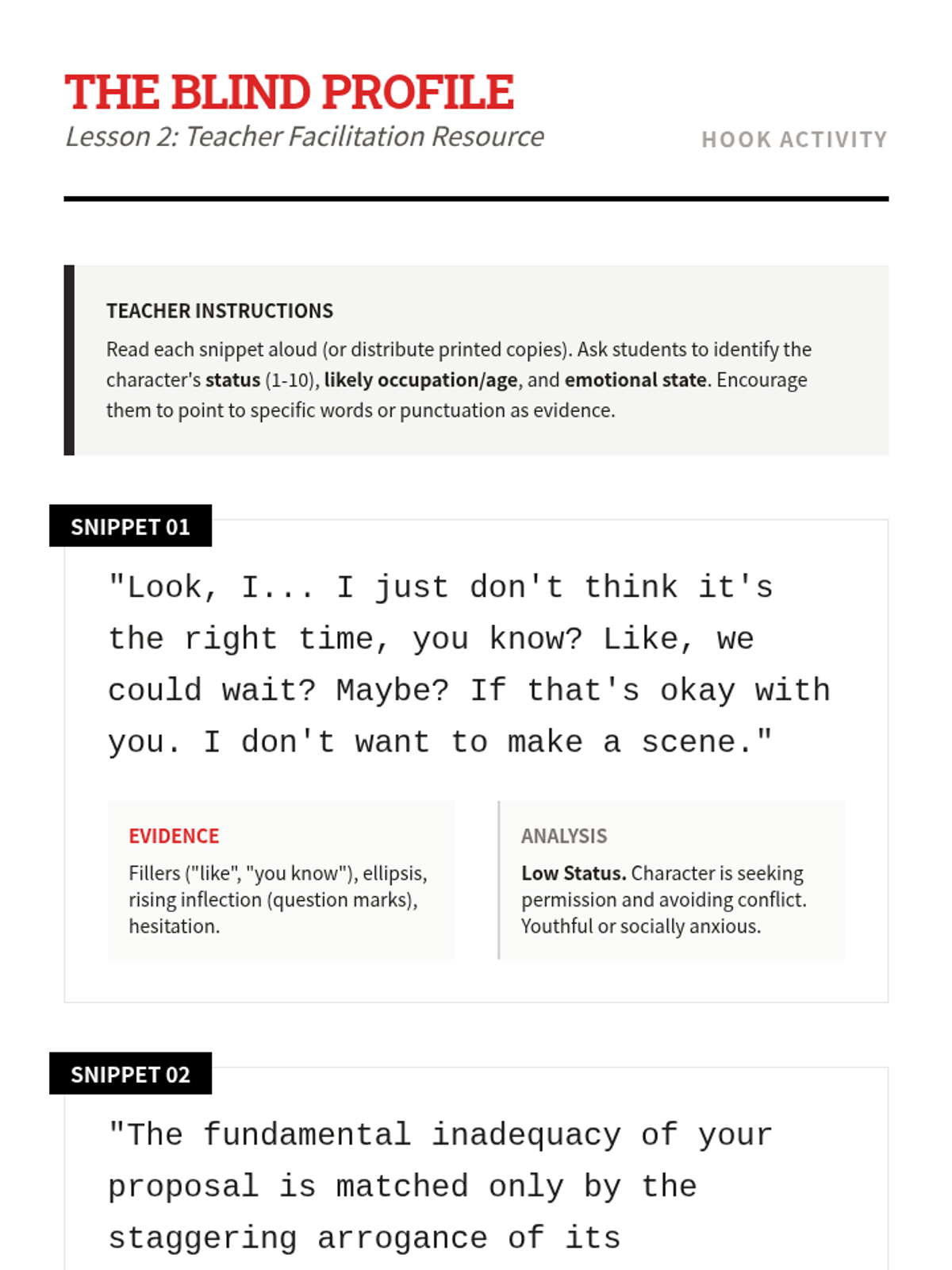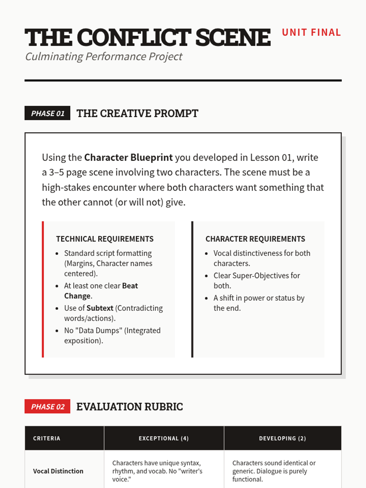 A high-level playwriting sequence for 12th-grade students focused on building complex characters and writing dialogue that drives action through subtext and vocal distinctiveness.