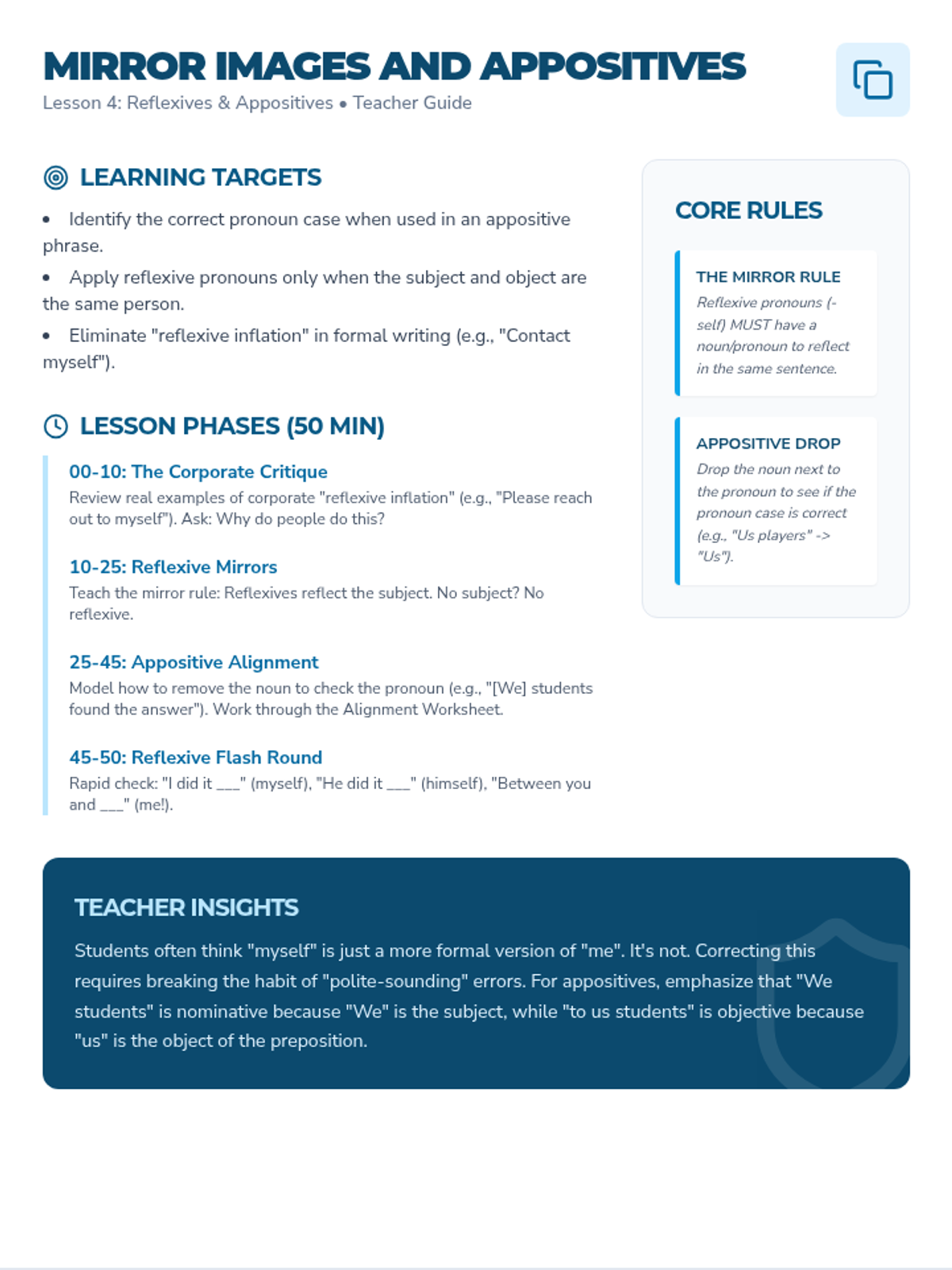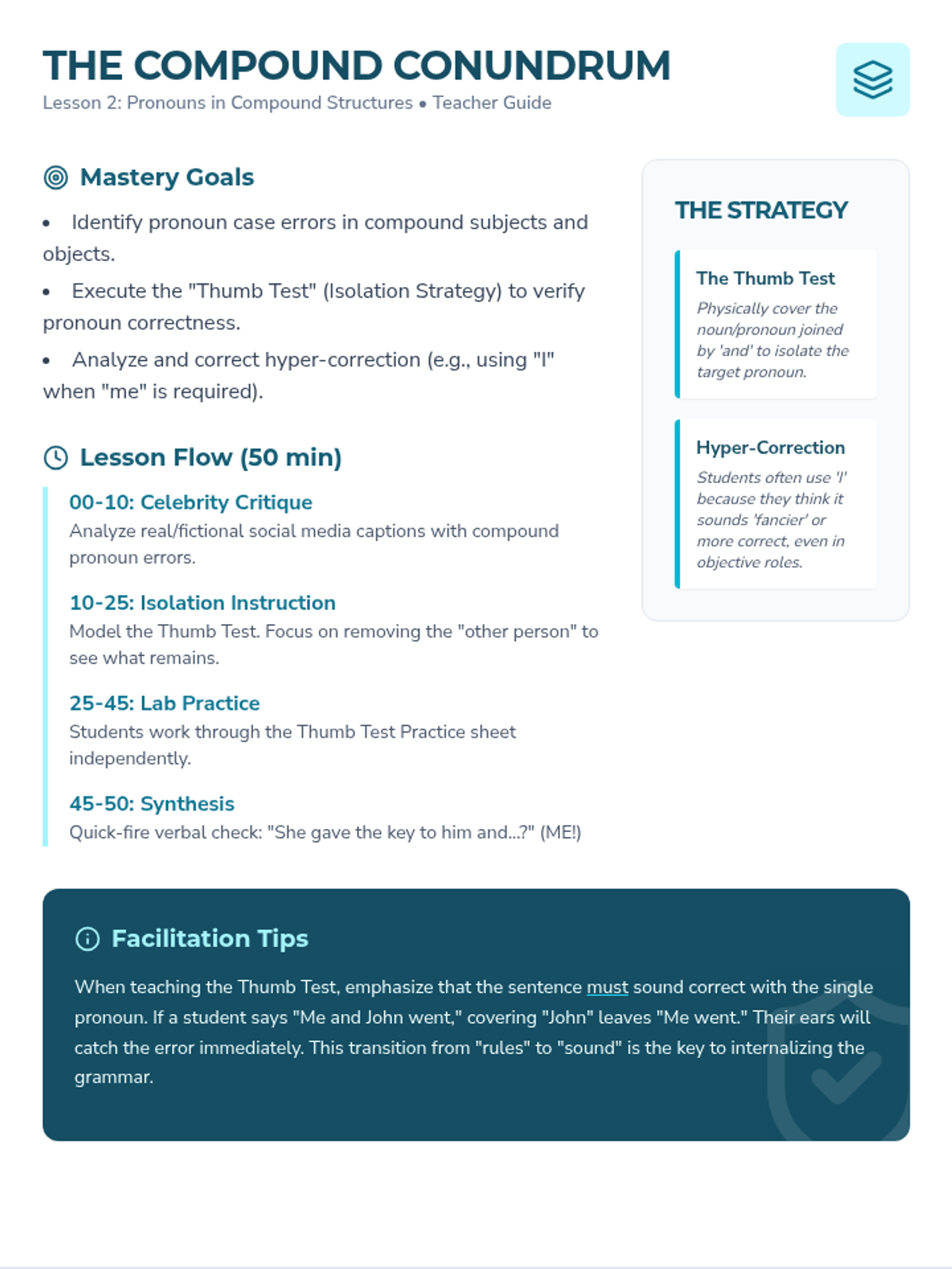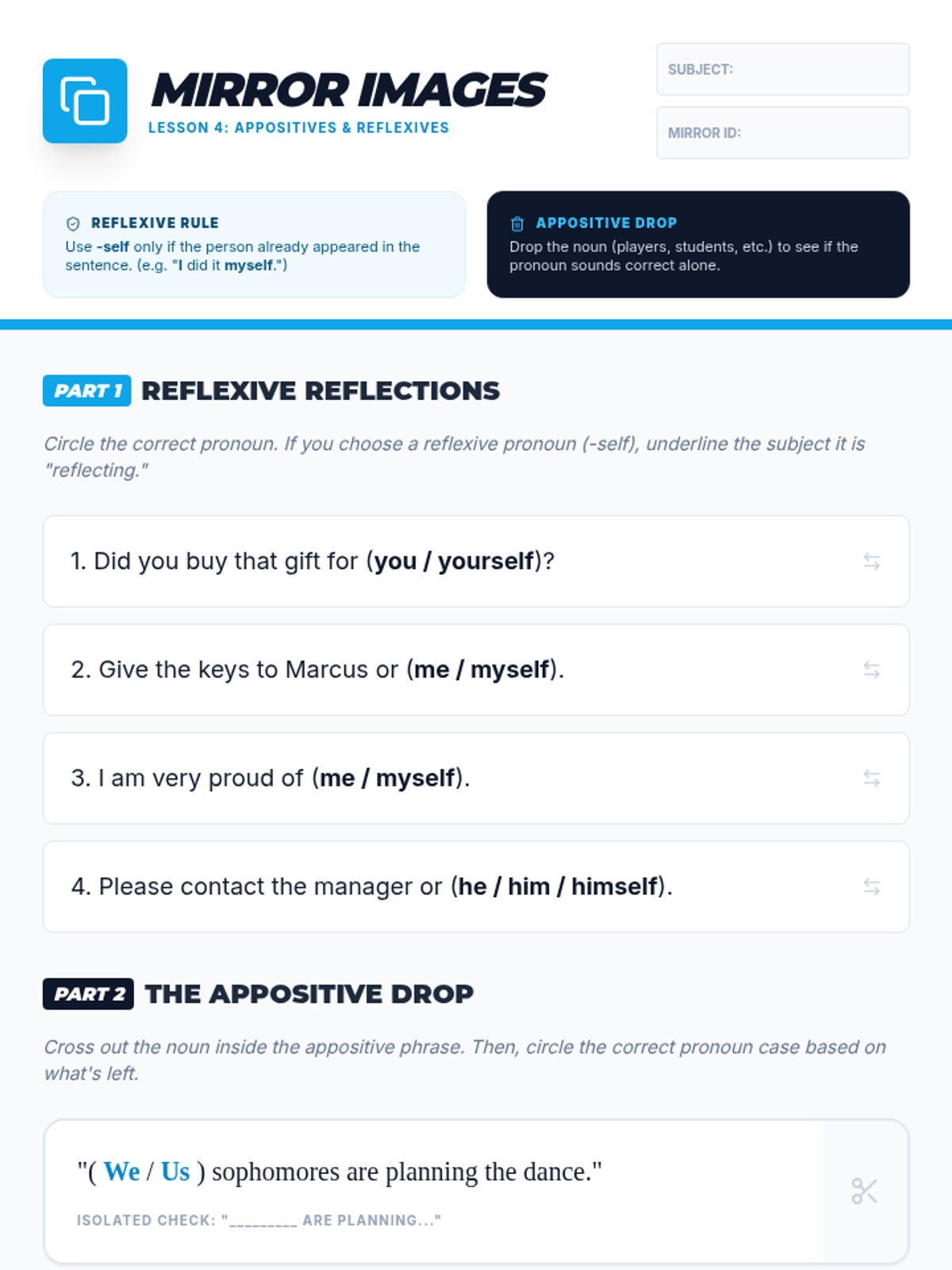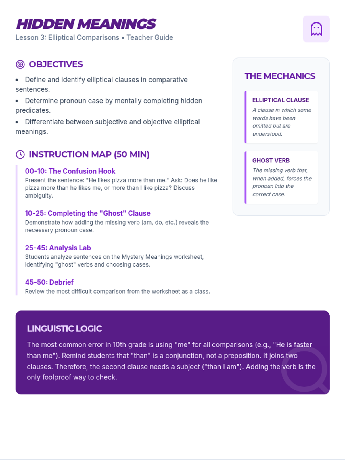 A rigorous sequence designed for 10th-grade mastery of complex pronoun case rules, focusing on compound structures, elliptical comparisons, and appositives. Students use logic-based strategies to navigate advanced grammar mechanics common in standardized testing.