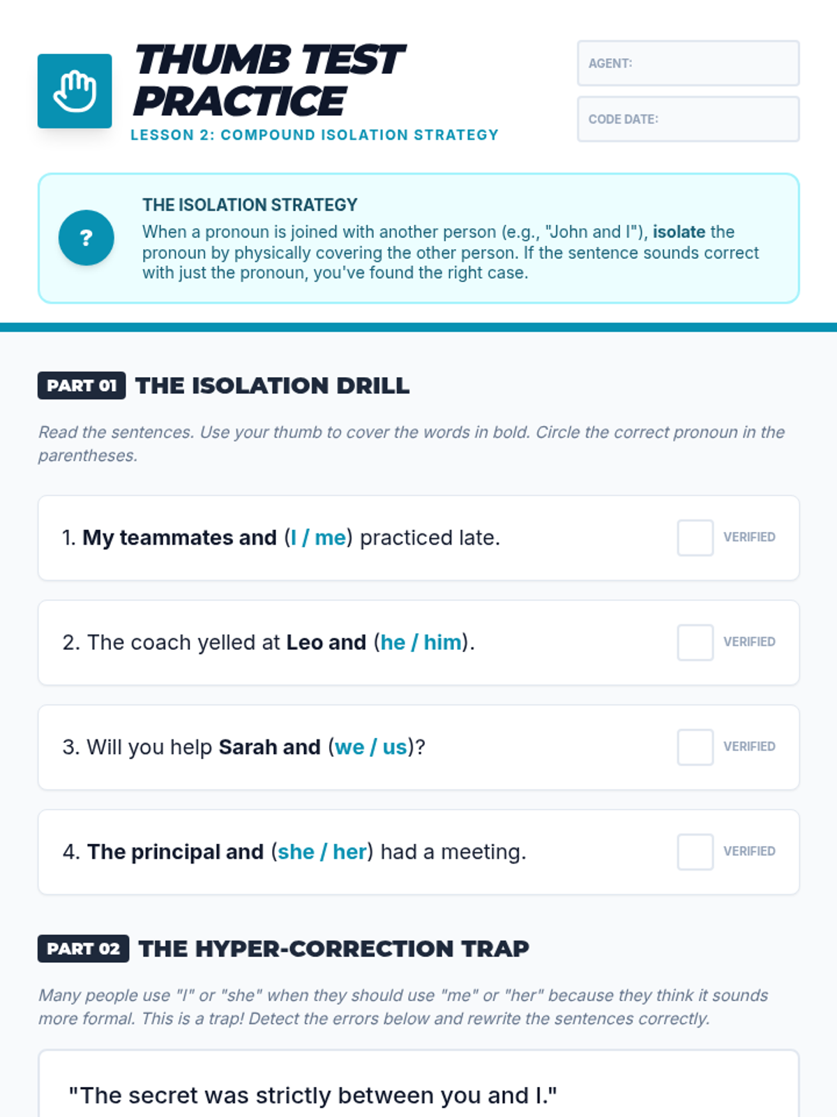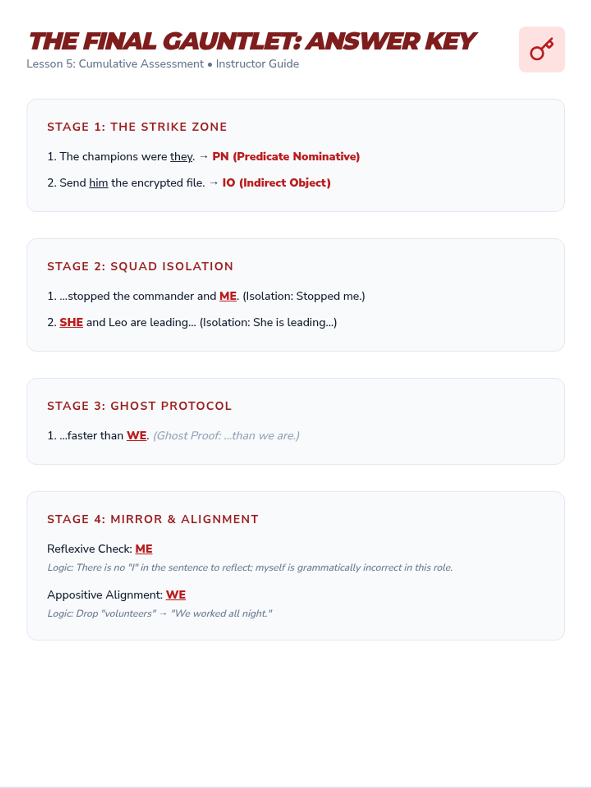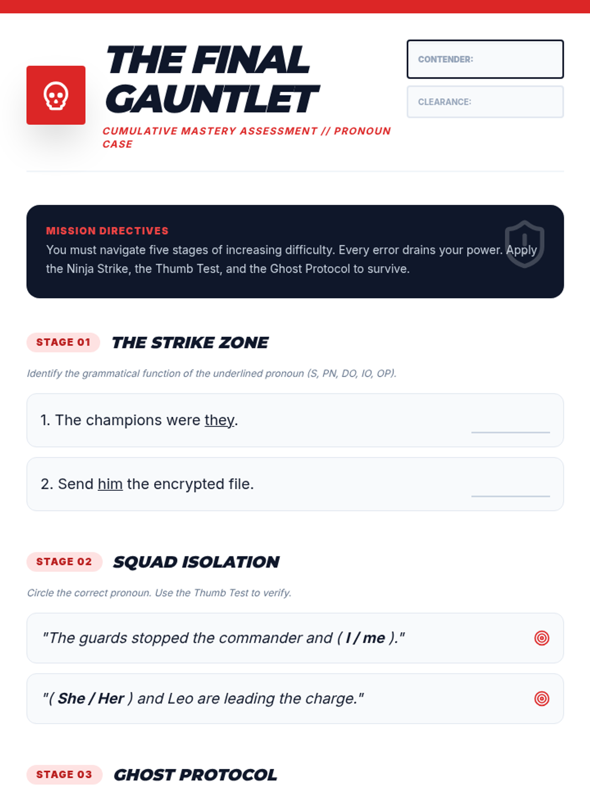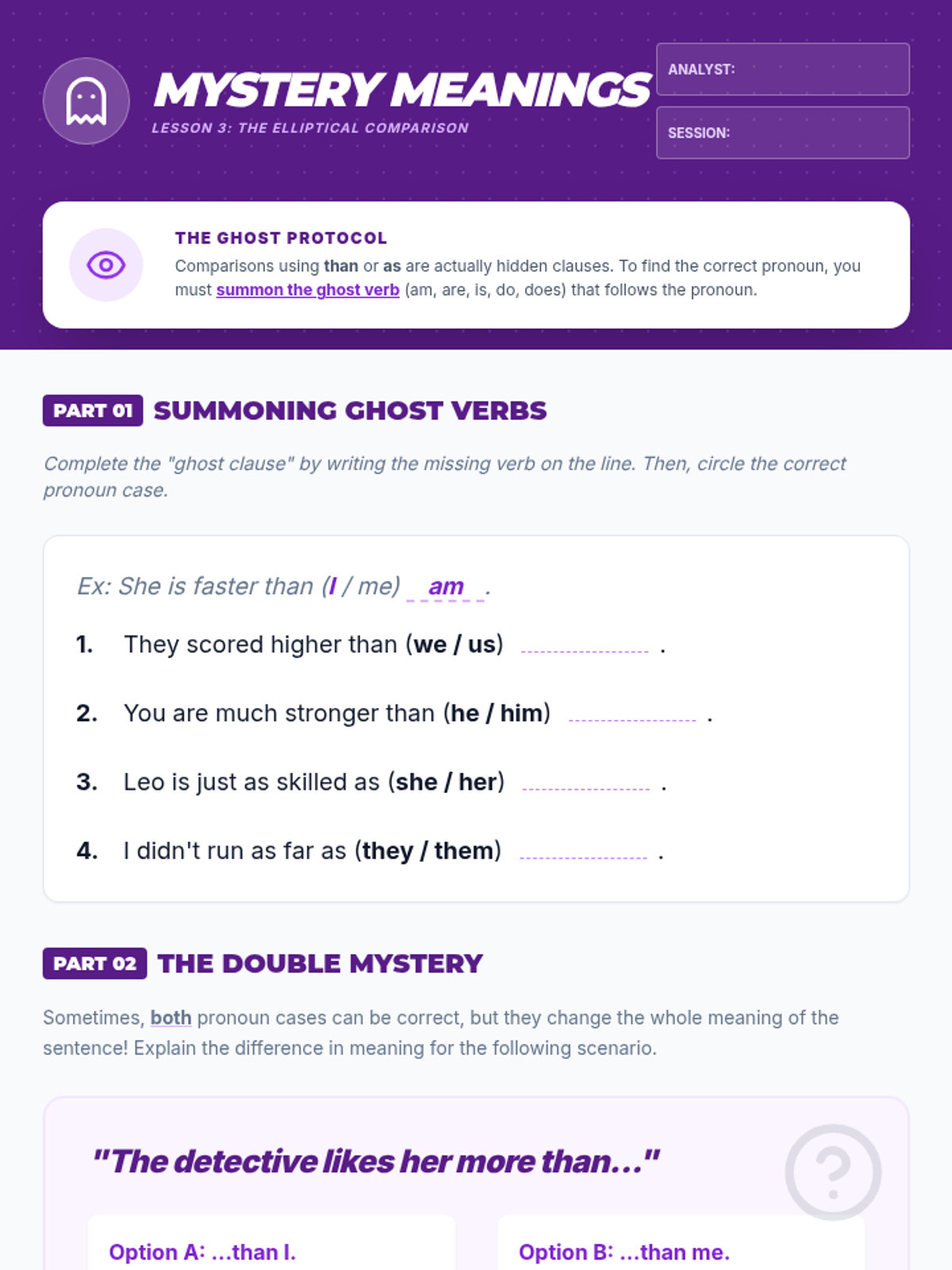 A rigorous sequence designed for 10th-grade mastery of complex pronoun case rules, focusing on compound structures, elliptical comparisons, and appositives. Students use logic-based strategies to navigate advanced grammar mechanics common in standardized testing.