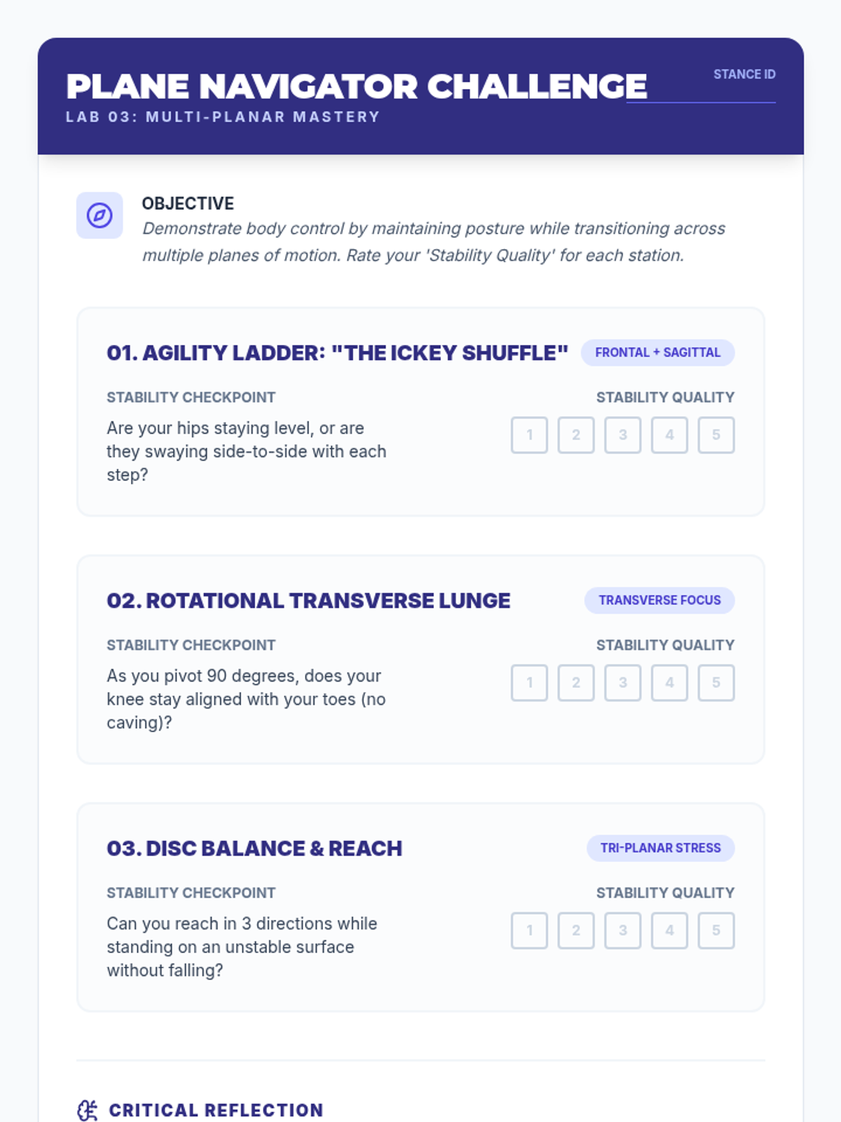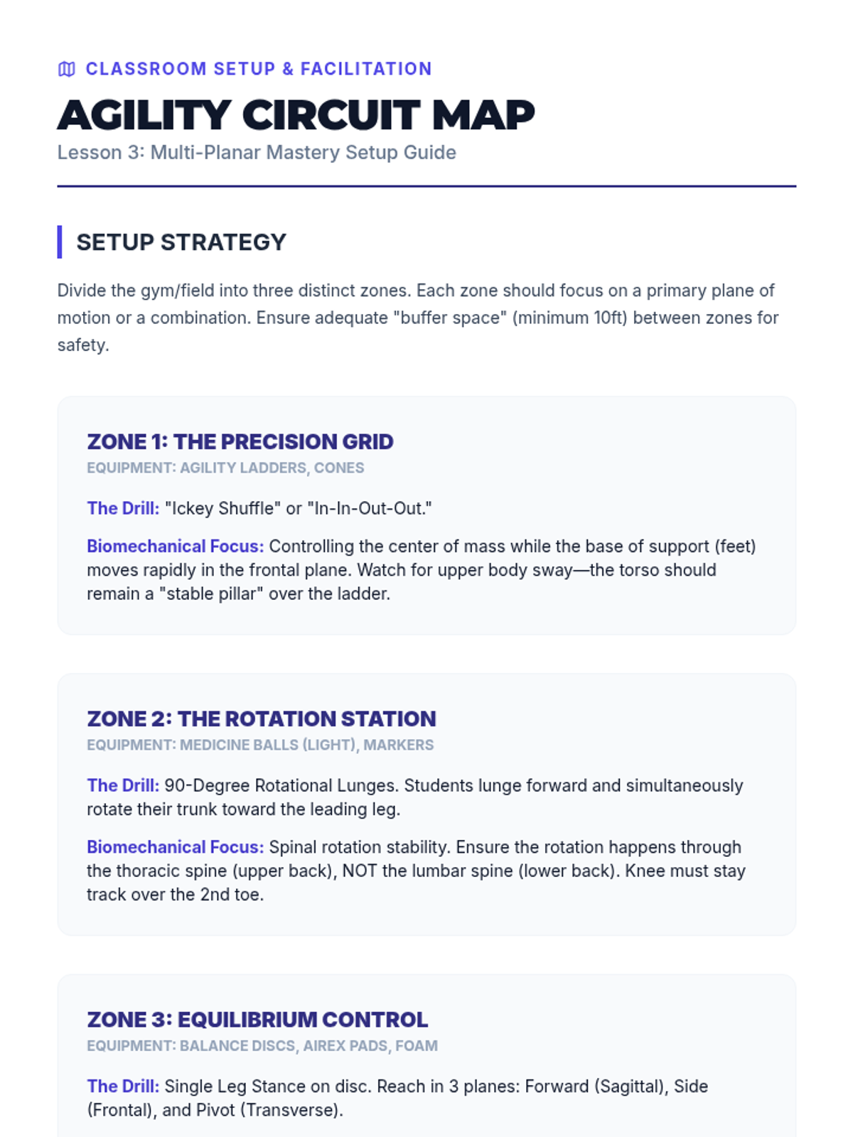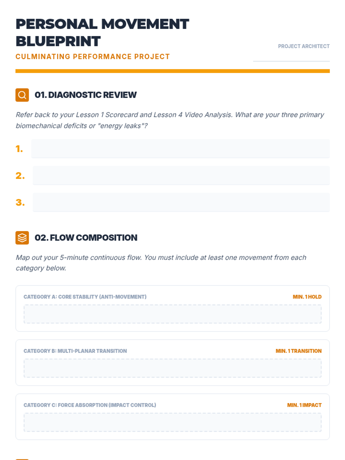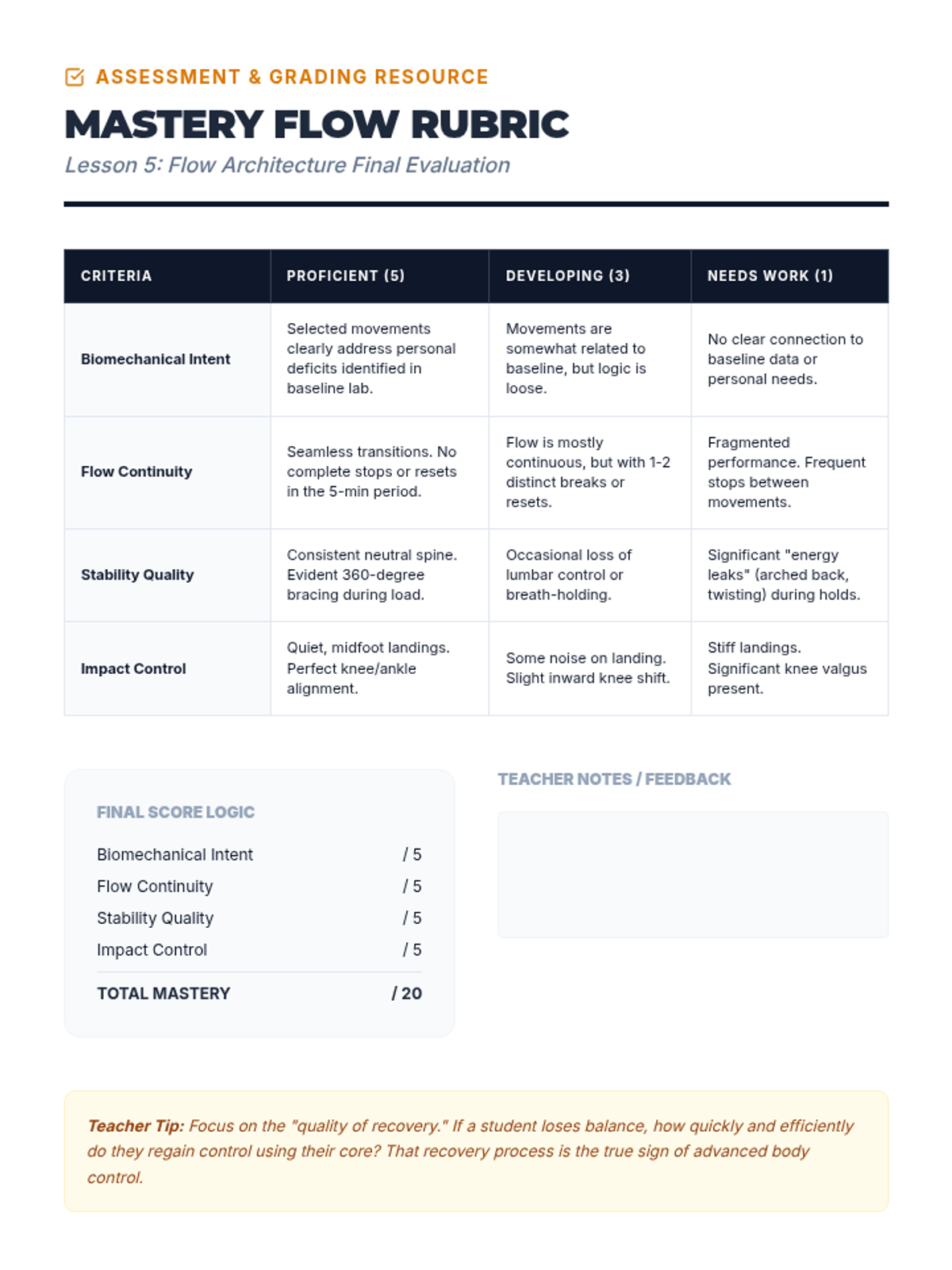 This advanced 12th-grade sequence explores body control through the lens of biomechanics and proprioception. Students progress from assessing their own kinetic chain to mastering anti-rotation core stability, multi-planar movement, and force absorption, culminating in the design of a personalized functional movement flow.