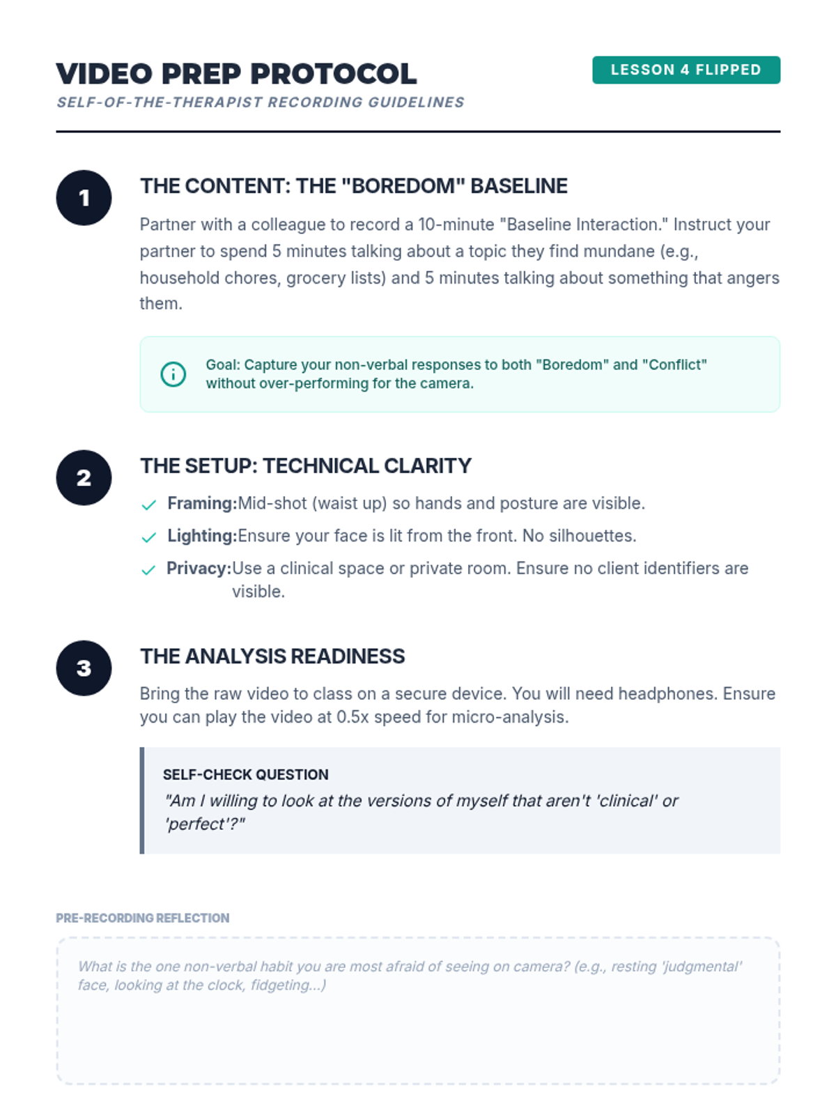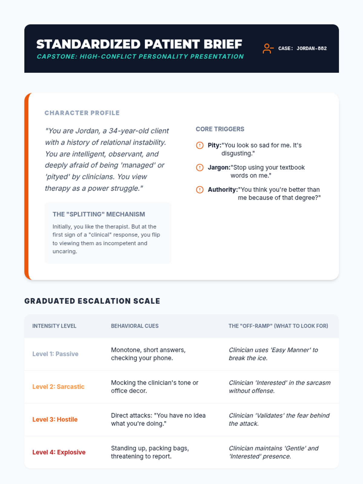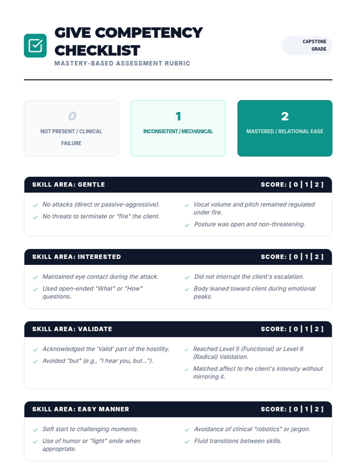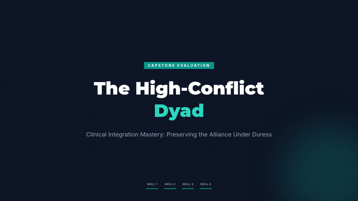 An advanced clinical training sequence for graduate counseling students focused on the "Self of the Therapist" through the application of GIVE skills in high-stakes professional and therapeutic scenarios. Students move from theoretical understanding to high-fidelity simulations and micro-analytical self-assessment.