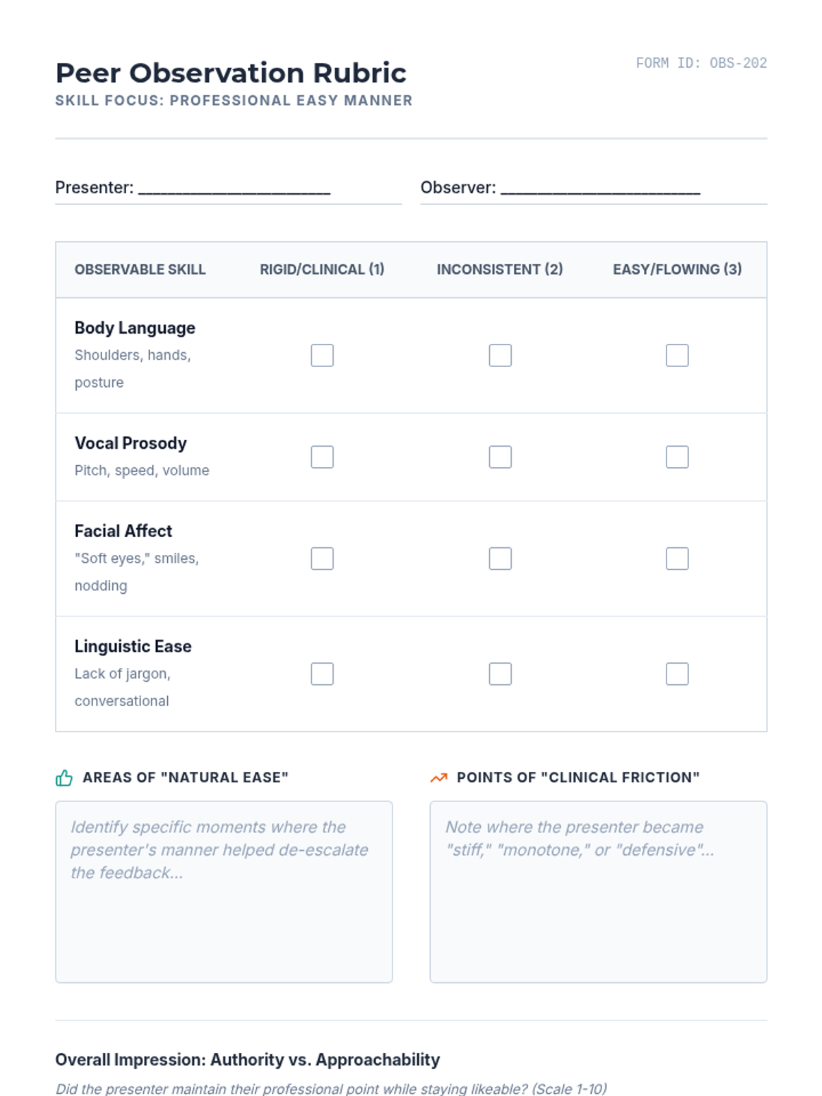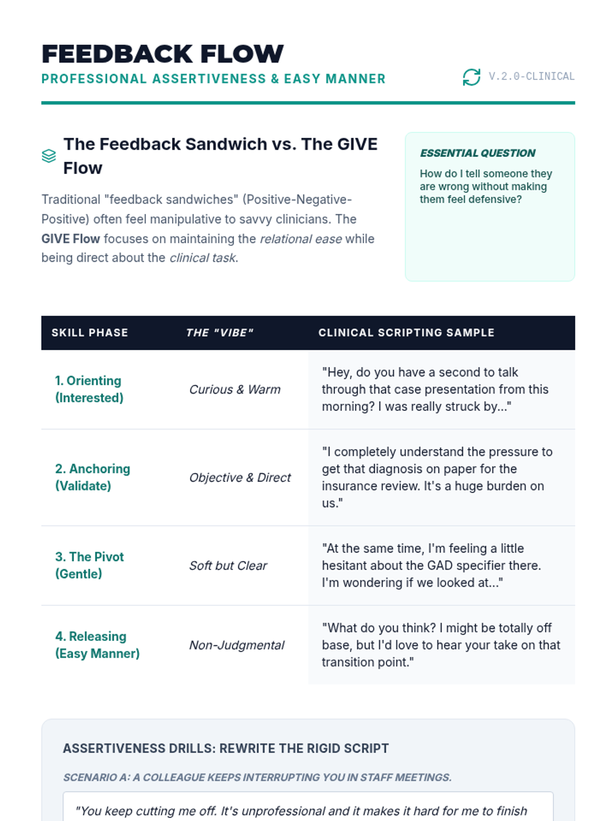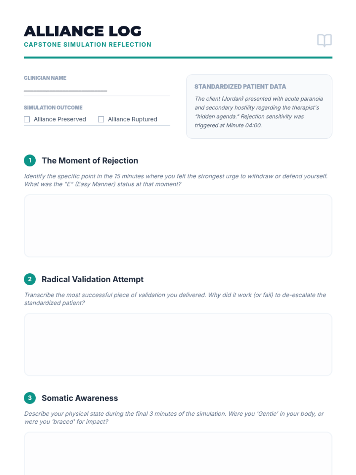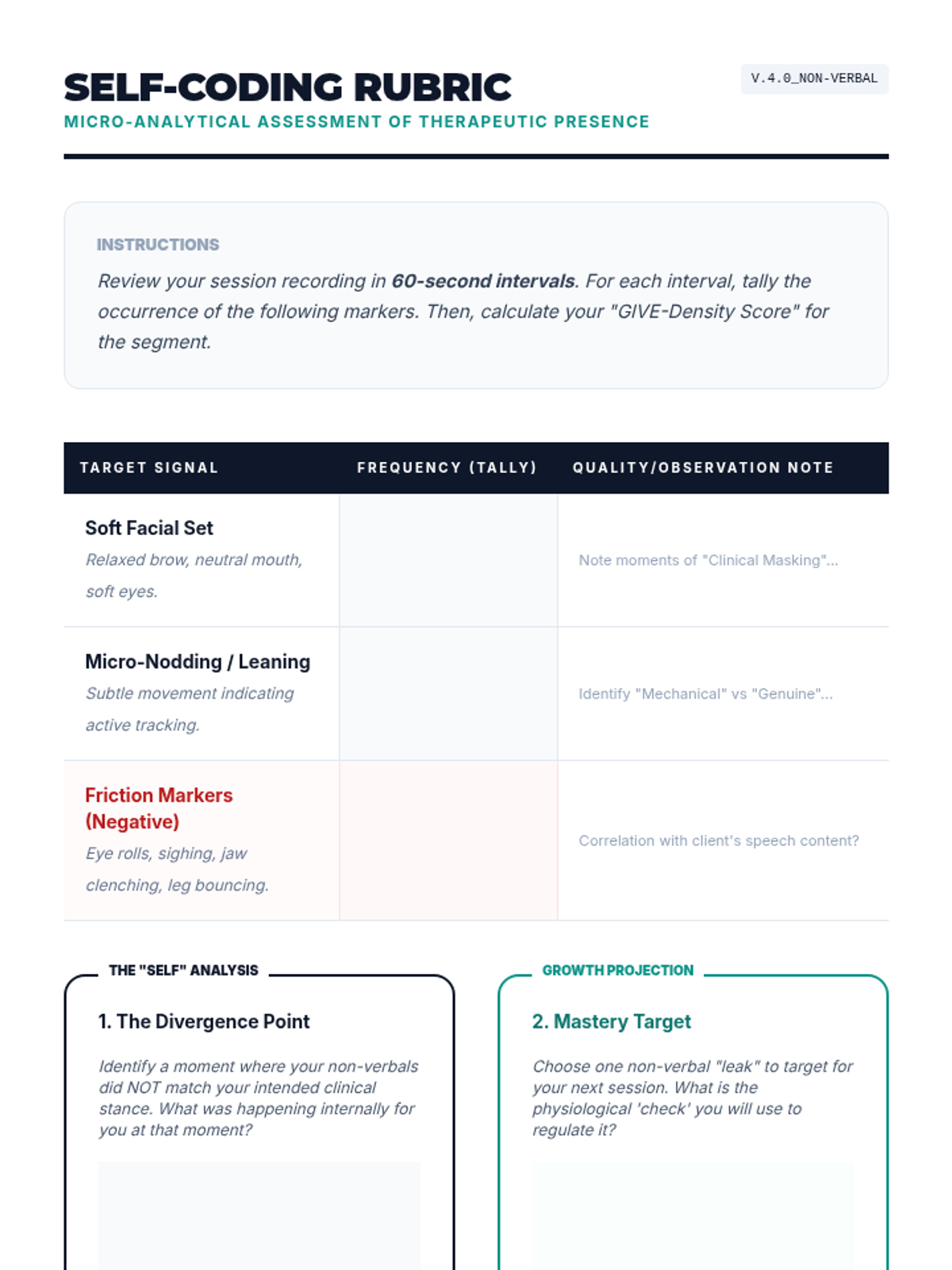An advanced clinical training sequence for graduate counseling students focused on the "Self of the Therapist" through the application of GIVE skills in high-stakes professional and therapeutic scenarios. Students move from theoretical understanding to high-fidelity simulations and micro-analytical self-assessment.