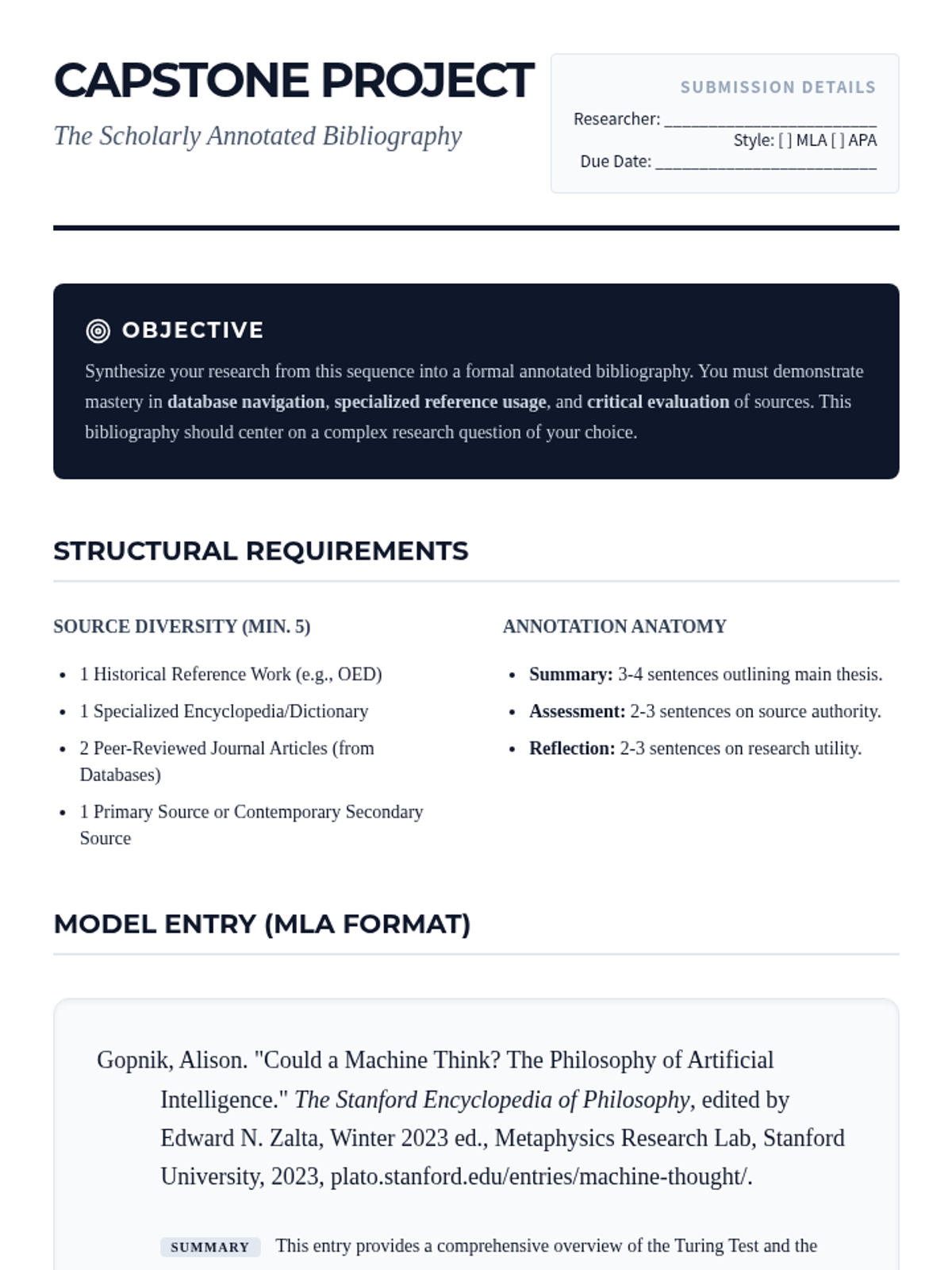 This advanced sequence transitions students from general information retrieval to the rigors of collegiate-level research and specialized reference usage. Students master boolean logic, historical linguistics, source evaluation, and citation management.