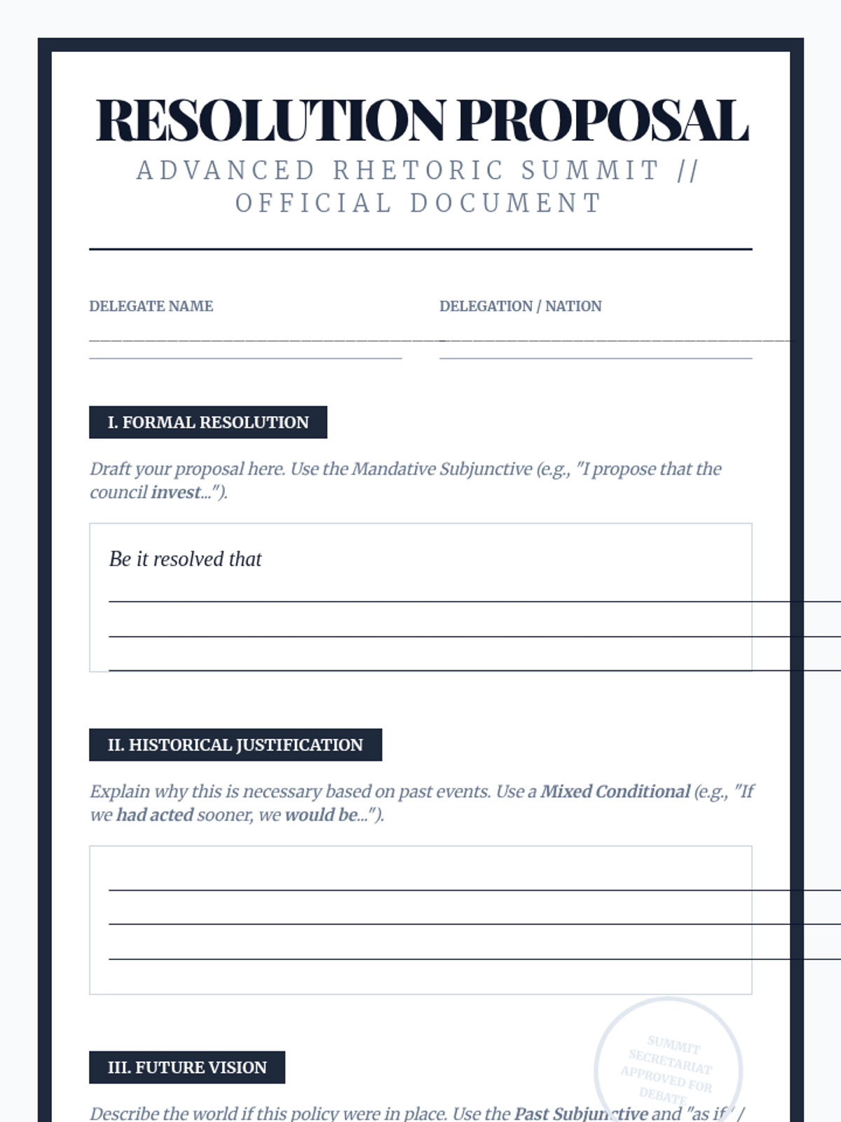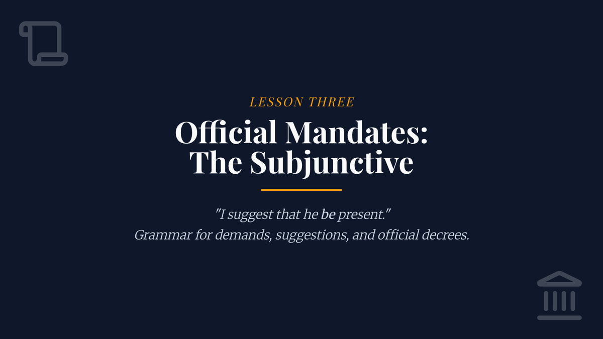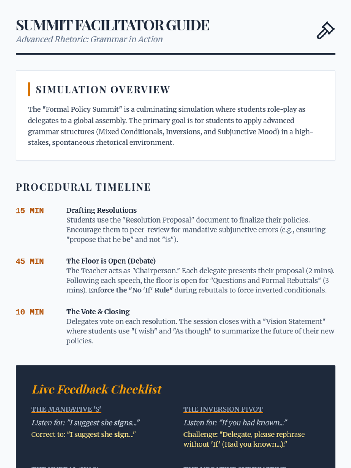 A high-level grammar sequence for 11th-grade students focused on mastering mixed conditionals, inverted structures, and the subjunctive mood within the context of formal rhetoric and debate. Students progress from logical structures to high-stakes policy simulations.