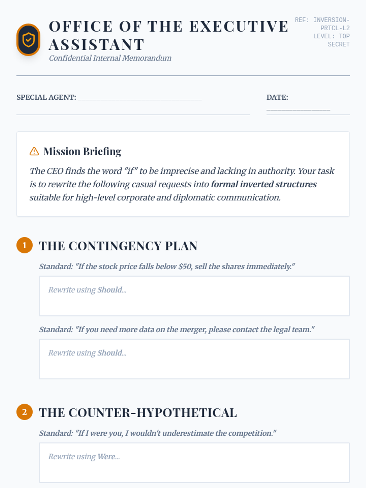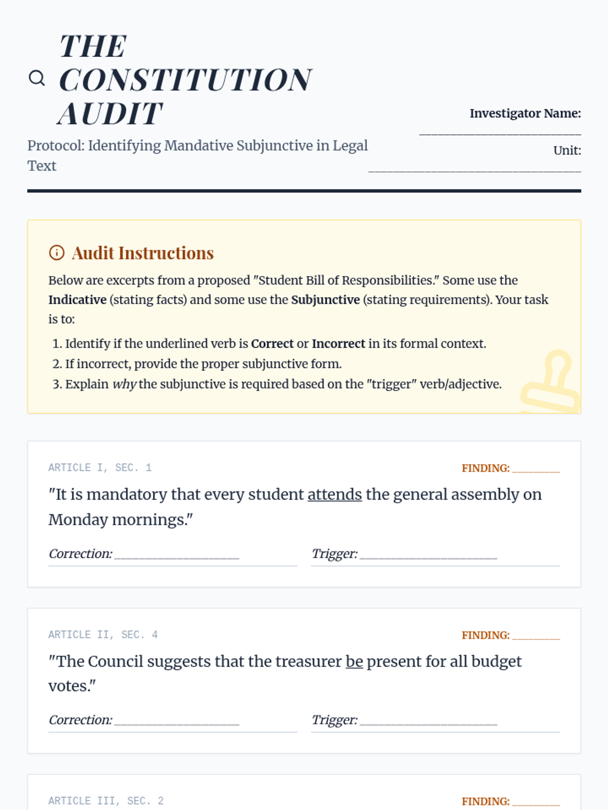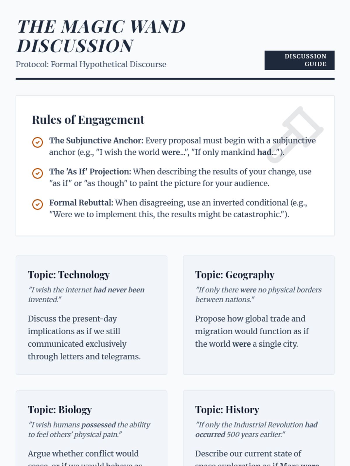 A high-level grammar sequence for 11th-grade students focused on mastering mixed conditionals, inverted structures, and the subjunctive mood within the context of formal rhetoric and debate. Students progress from logical structures to high-stakes policy simulations.