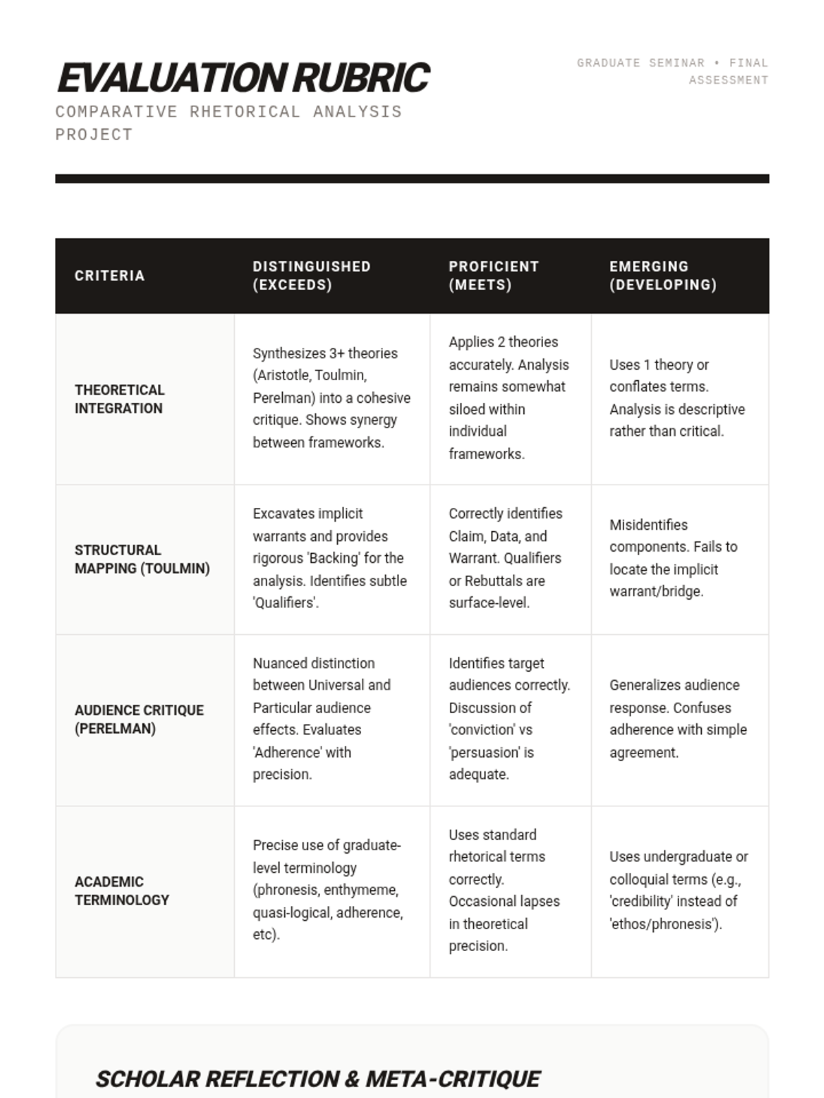 This advanced seminar explores the foundational and contemporary theories of rhetoric, moving beyond basic definitions of ethos, pathos, and logos to analyze their complex interplay in public discourse. Students will critique seminal texts using the Toulmin Model and Aristotelian frameworks to deconstruct high-level arguments found in legal, political, and academic spheres.