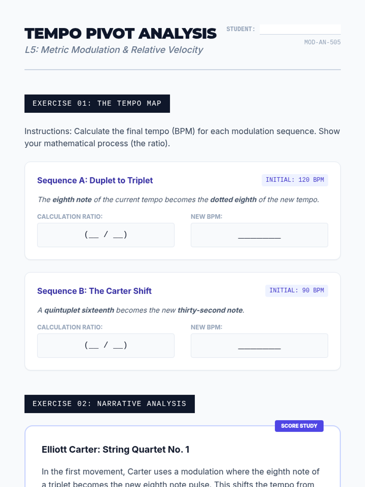 A rigorous workshop-based sequence for graduate music students exploring advanced rhythmic perception, meter architecture, asymmetrical rhythms, polyrhythms, and metric modulation. The course emphasizes both the mathematical calculation and the physical internalization of complex temporal structures.