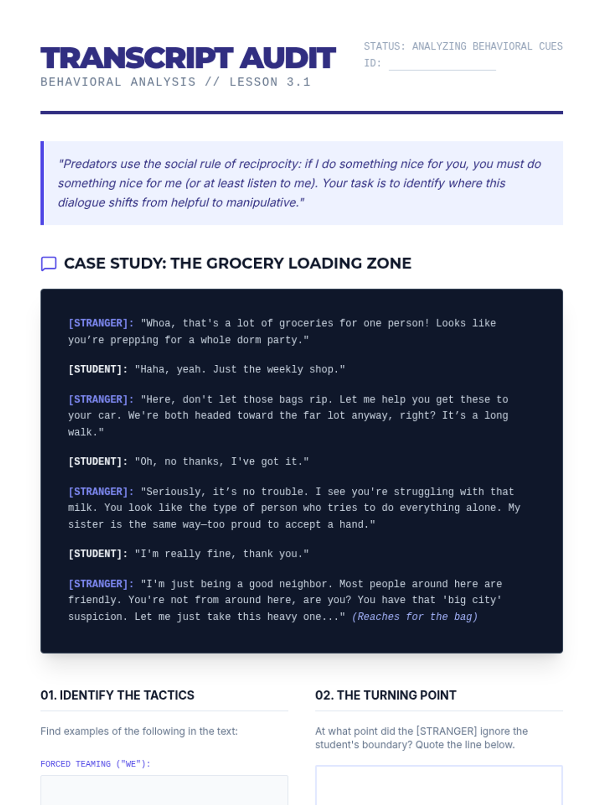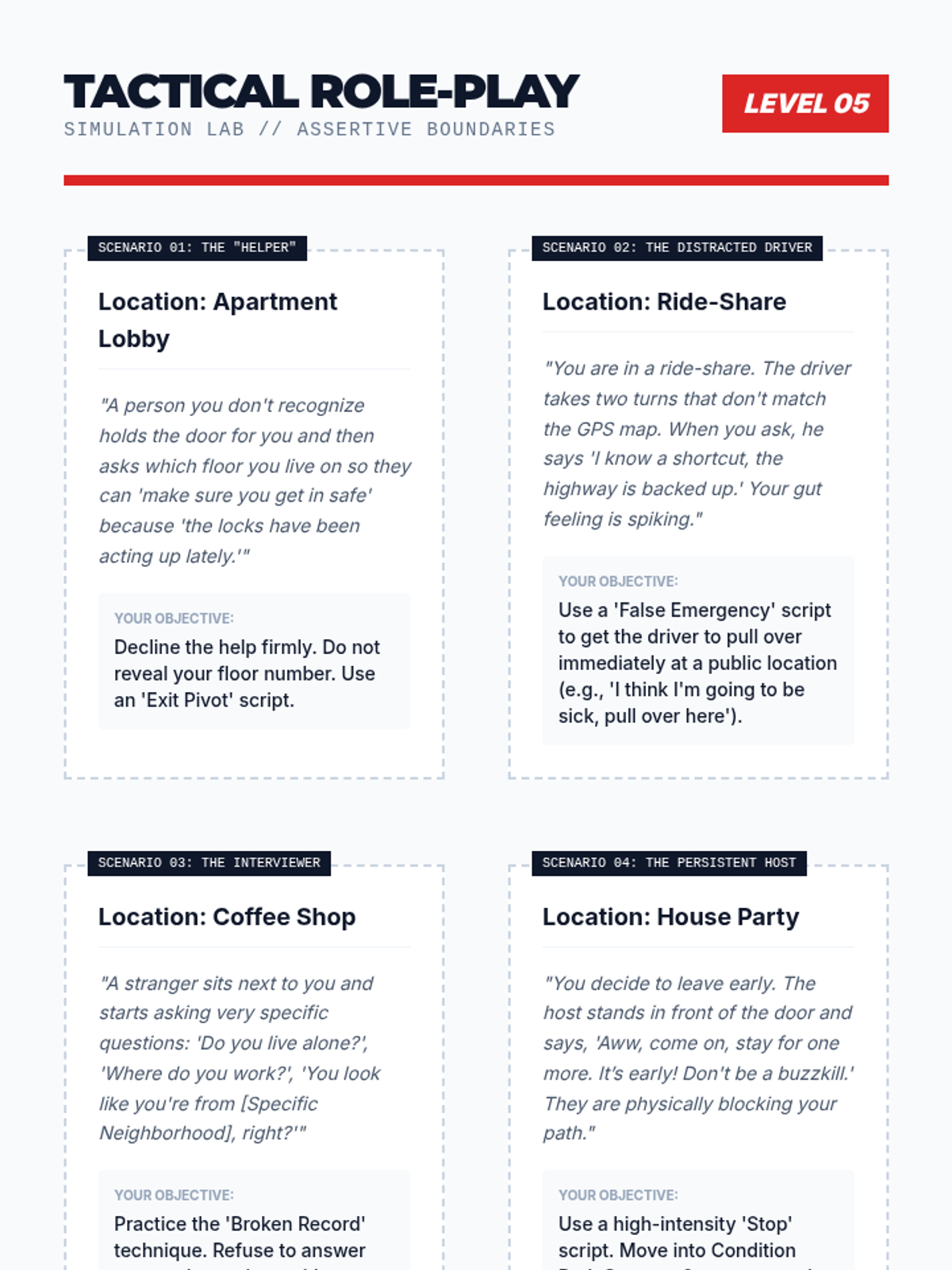 A comprehensive safety sequence for graduating seniors focusing on situational awareness, the OODA loop framework, and recognizing predatory social behaviors in physical and digital spaces.