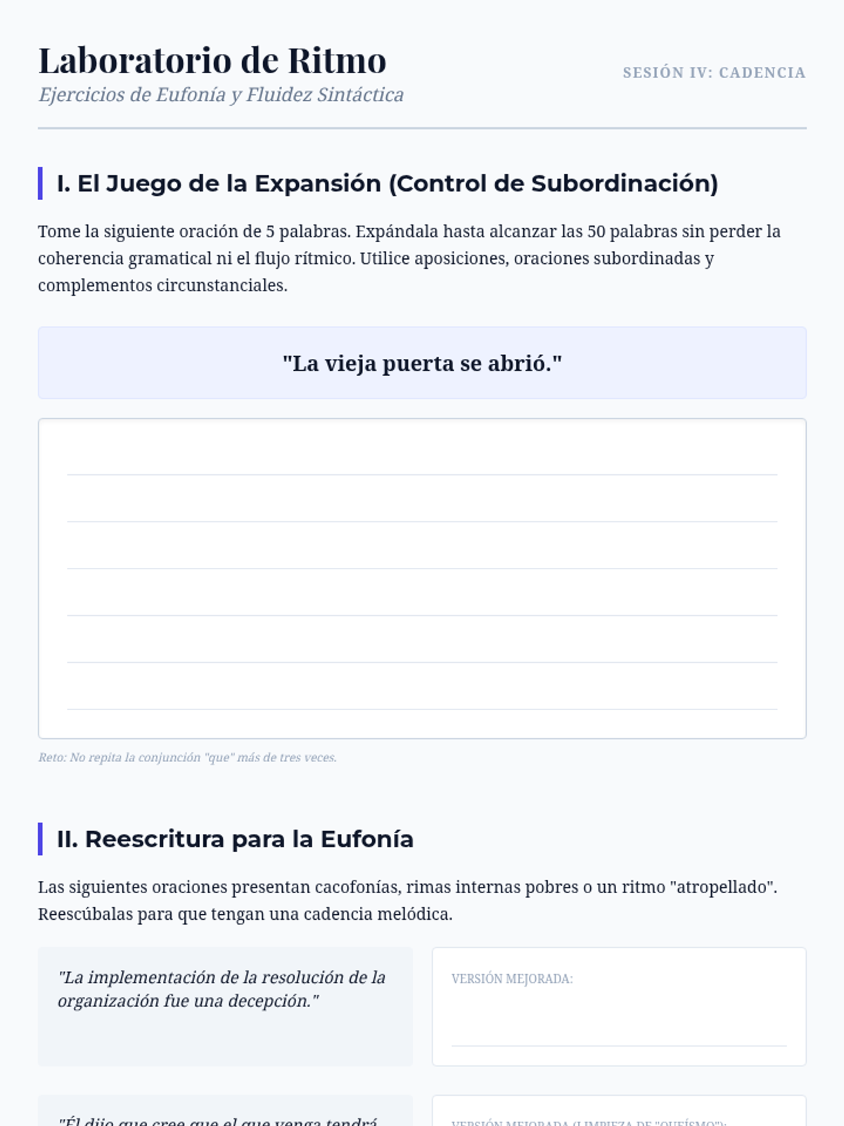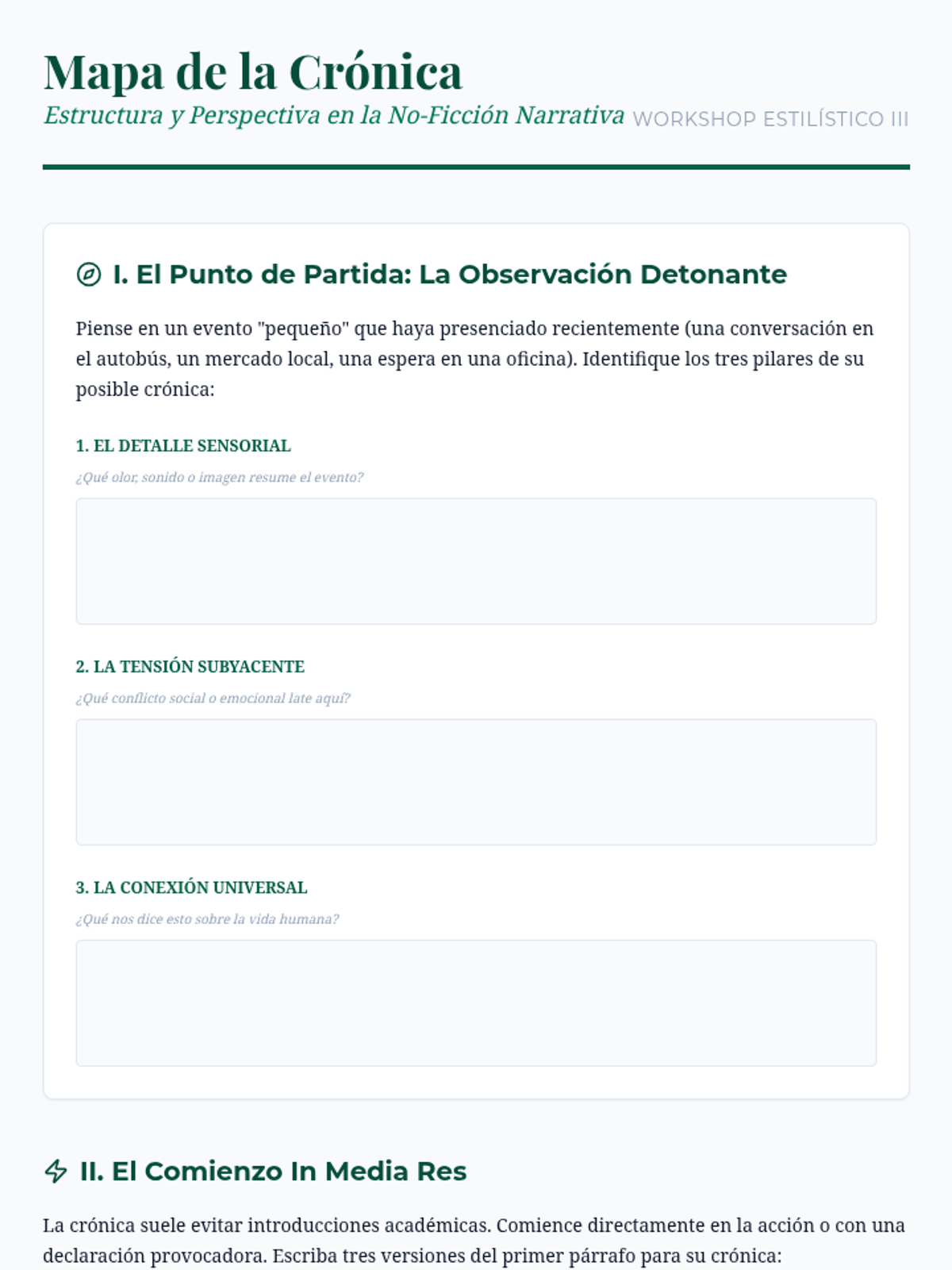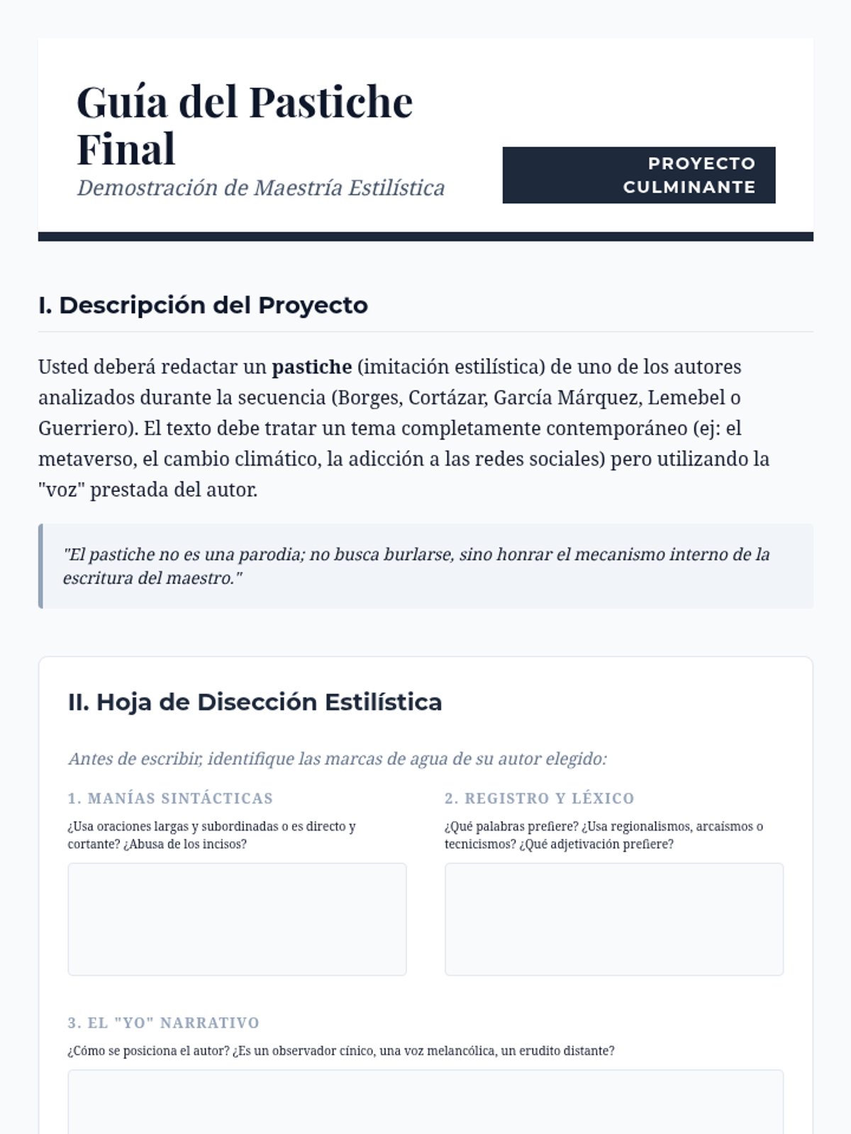 An advanced writing sequence for graduate students focusing on stylistics, narrative voice, and creative non-fiction in Spanish. Students analyze master works from Hispanic authors to develop a sophisticated personal voice and technical mastery of prose rhythm, irony, and sensory detail.