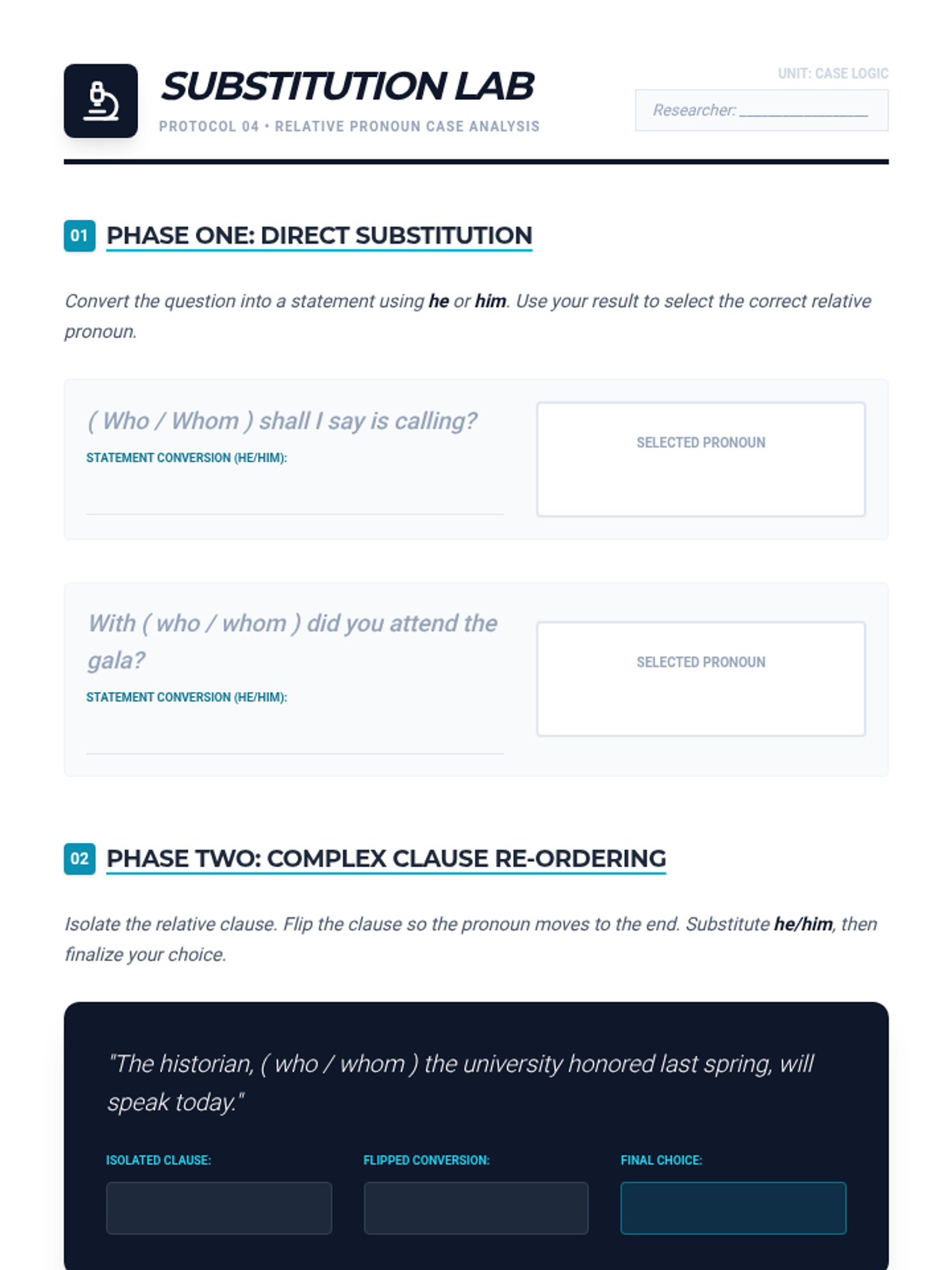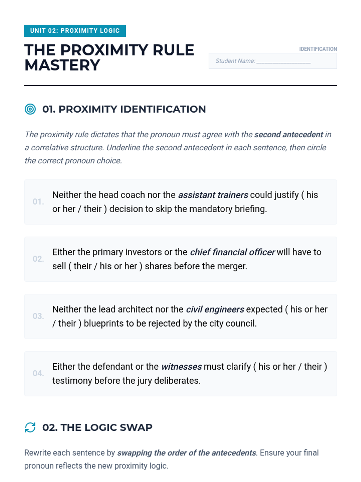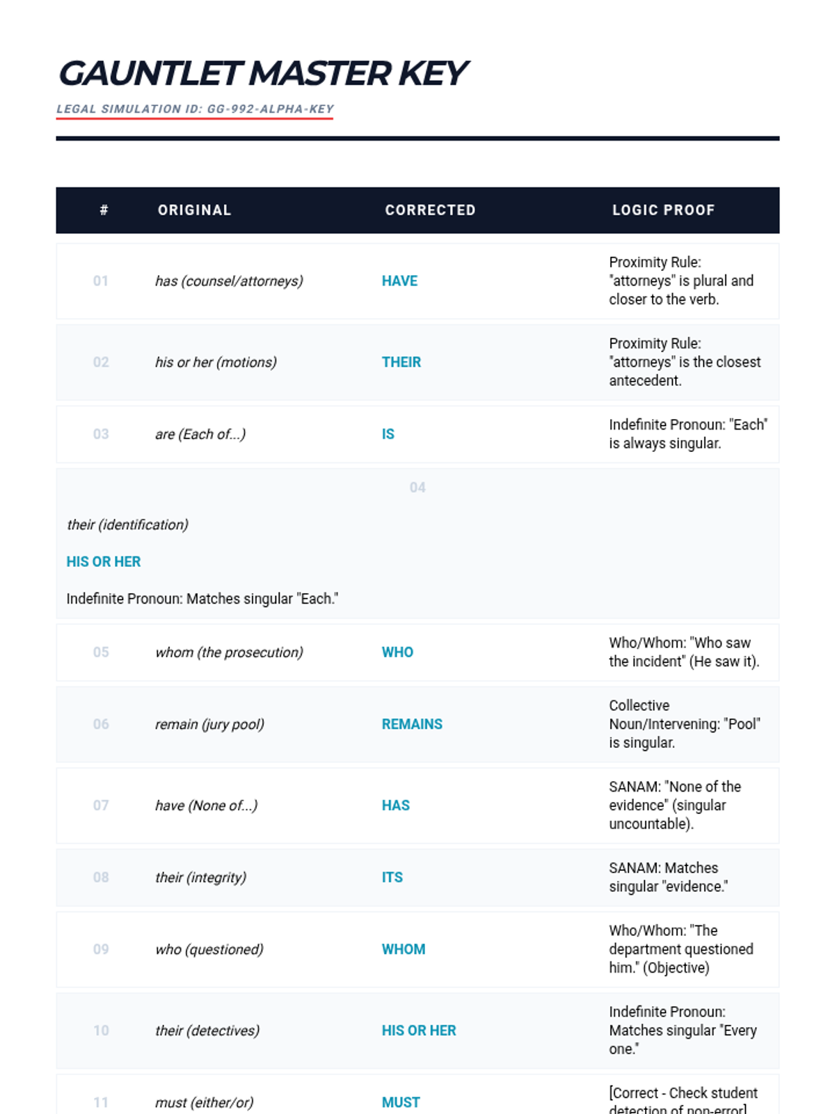 An advanced 12th Grade English Language Arts sequence focused on the technical challenges of pronoun-antecedent agreement. Students apply mathematical-style logic to solve complex syntax puzzles, mastering indefinite pronouns, proximity rules, intervening phrases, and case distinction.