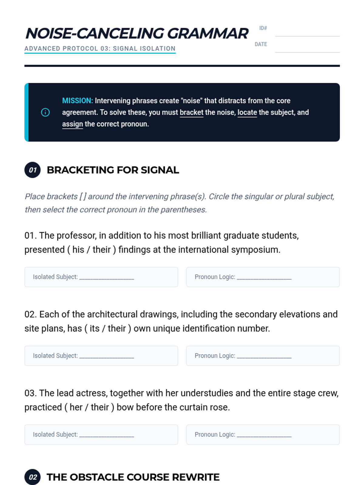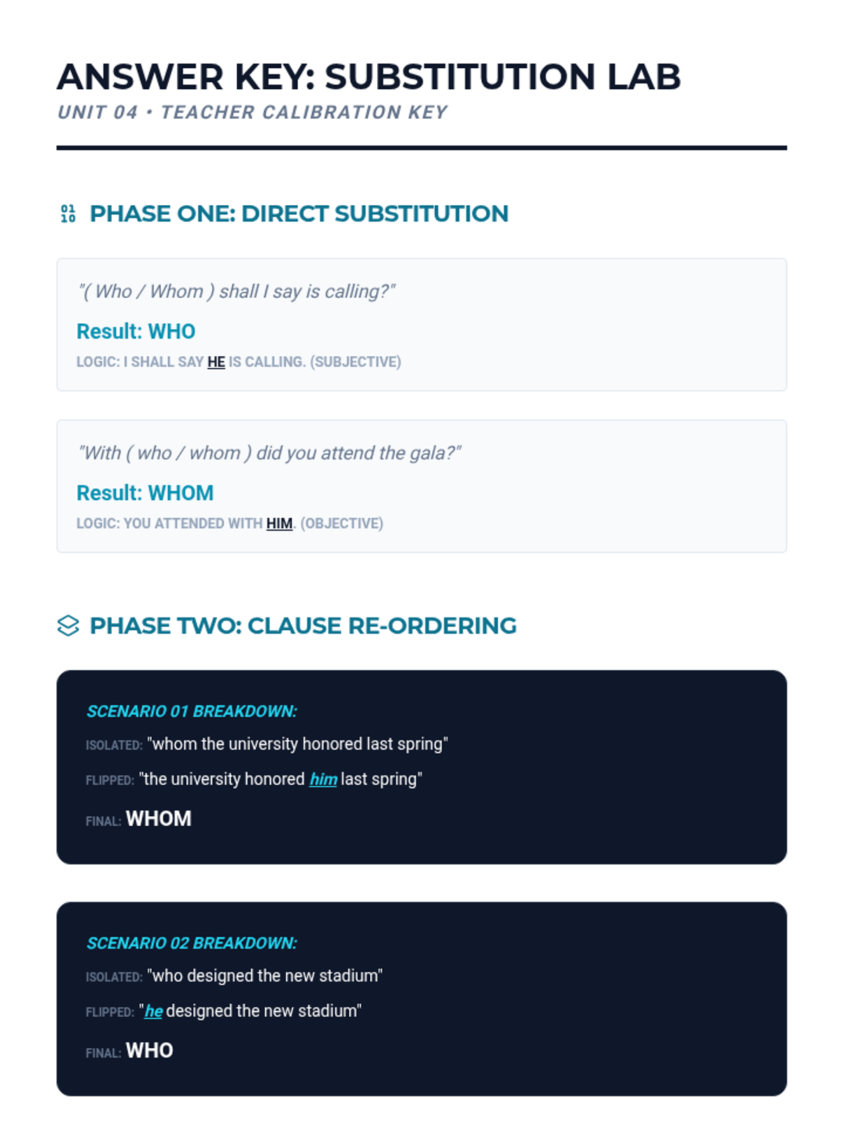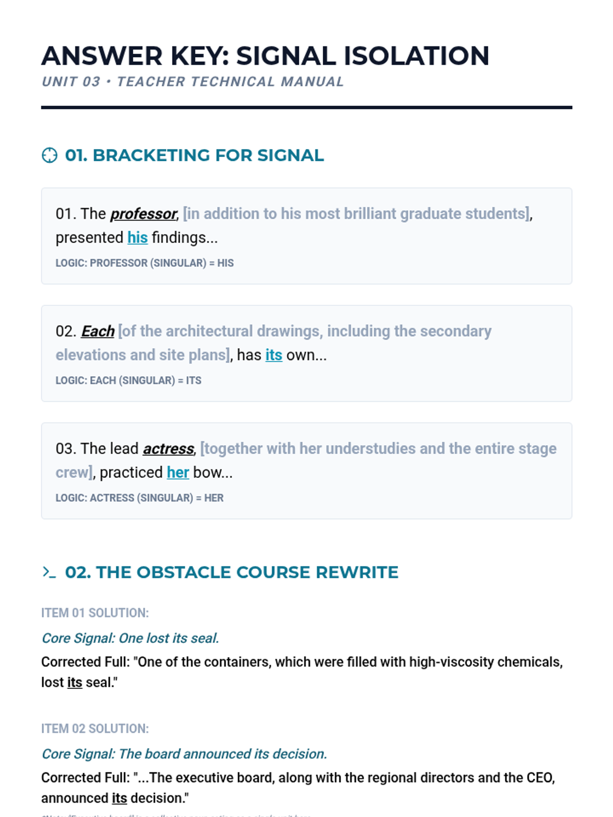 An advanced 12th Grade English Language Arts sequence focused on the technical challenges of pronoun-antecedent agreement. Students apply mathematical-style logic to solve complex syntax puzzles, mastering indefinite pronouns, proximity rules, intervening phrases, and case distinction.
