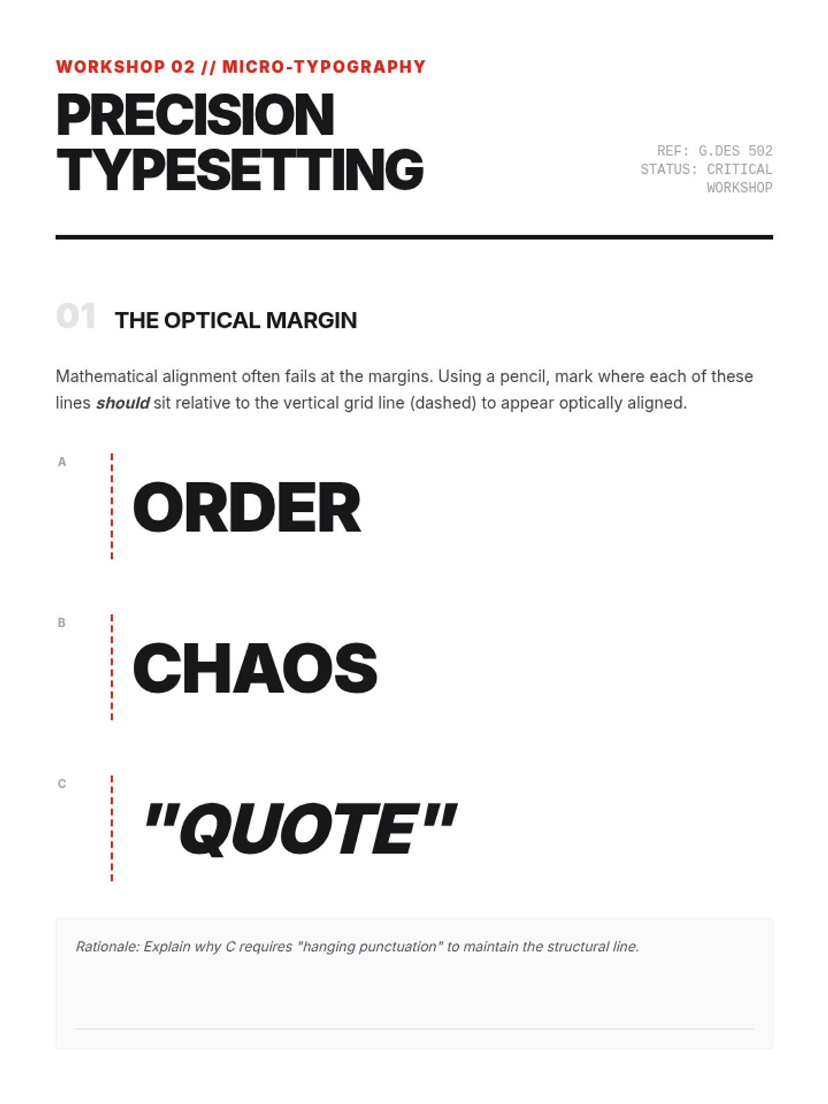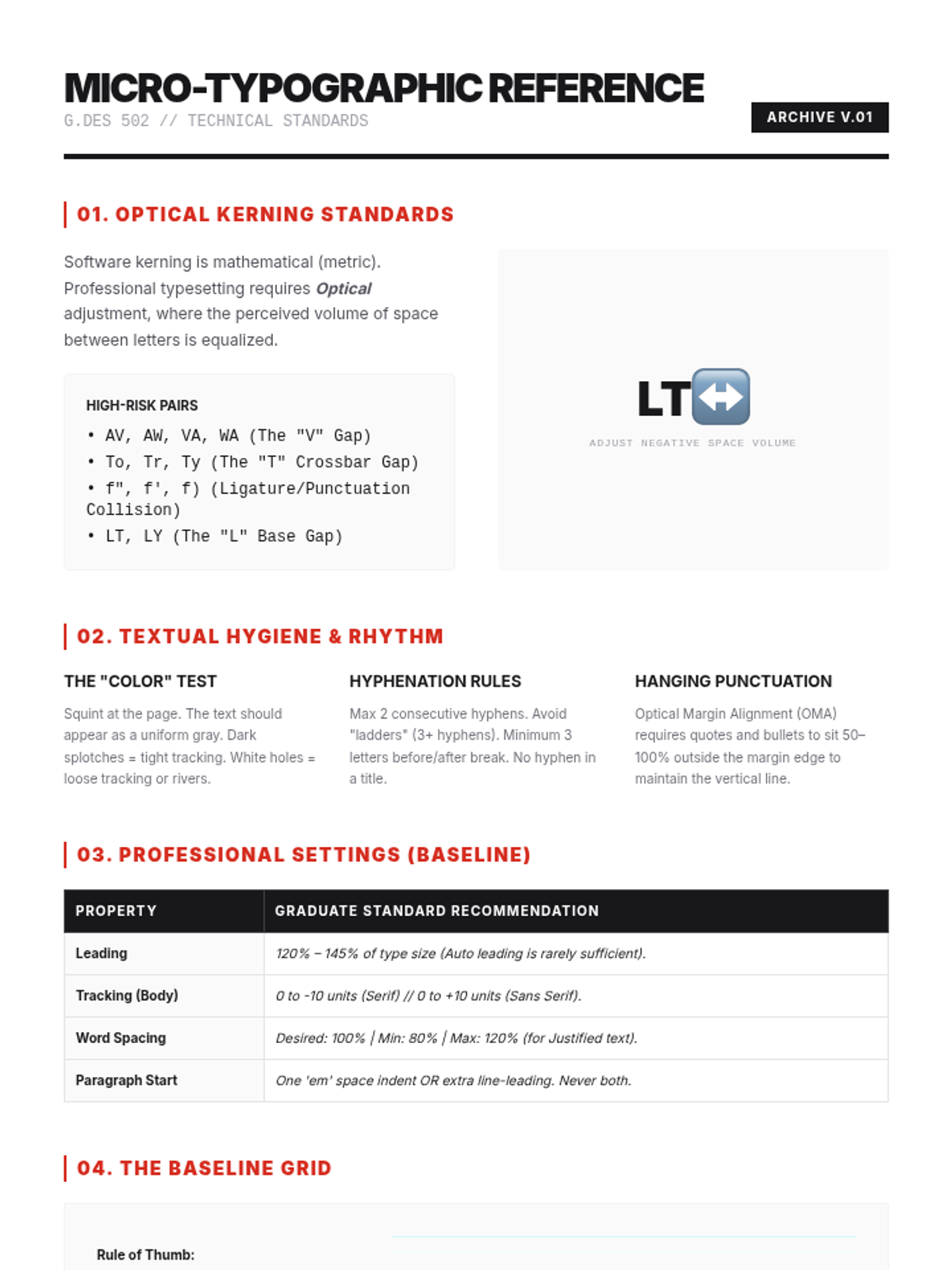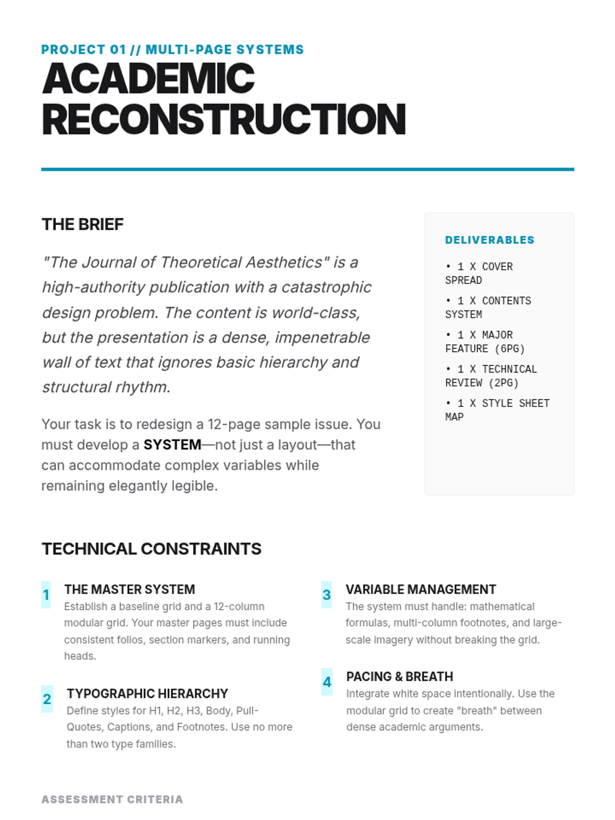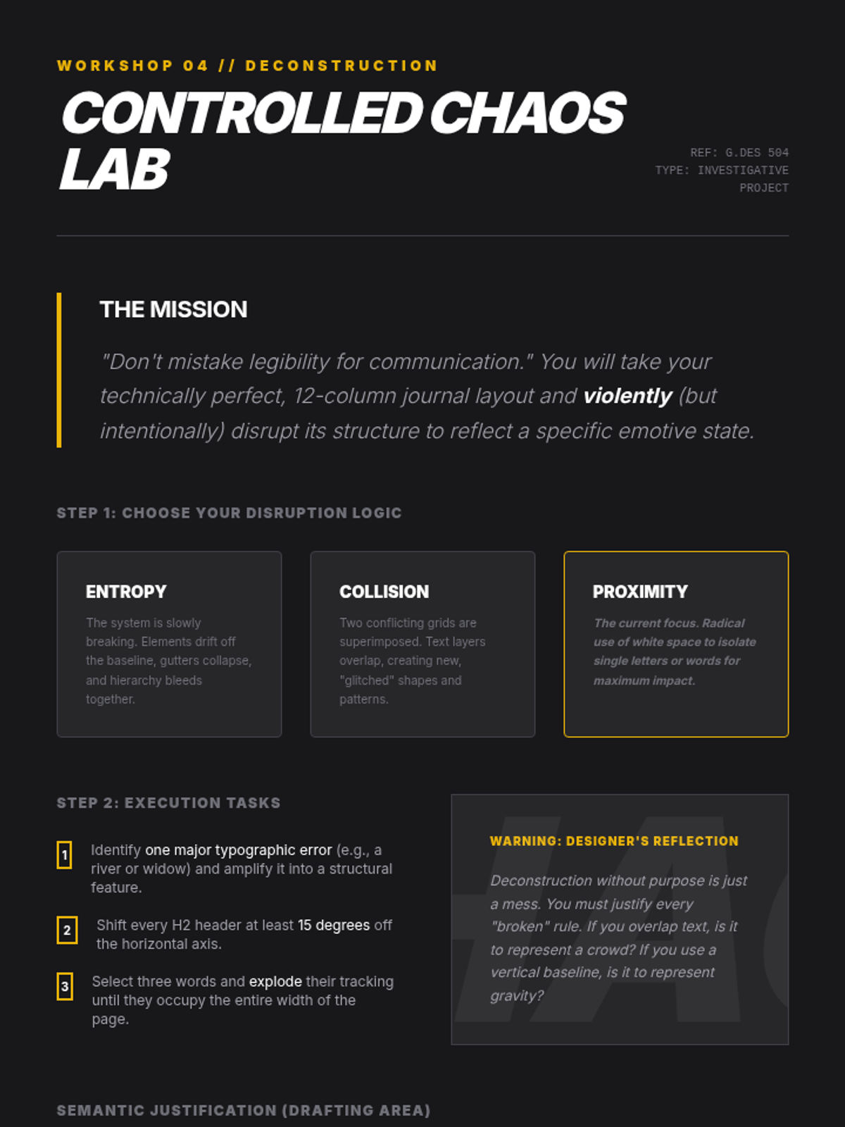 An advanced exploration of typographic systems, from the mathematical precision of Modernist grid structures to the expressive potential of post-modern deconstruction and kinetic typography. Students master micro-typography, complex hierarchy, and structural integrity in both print and digital environments.