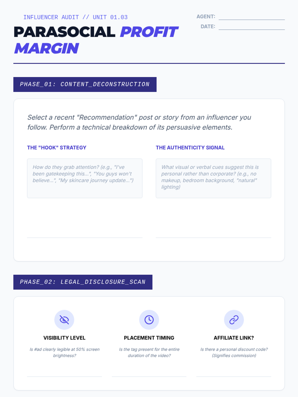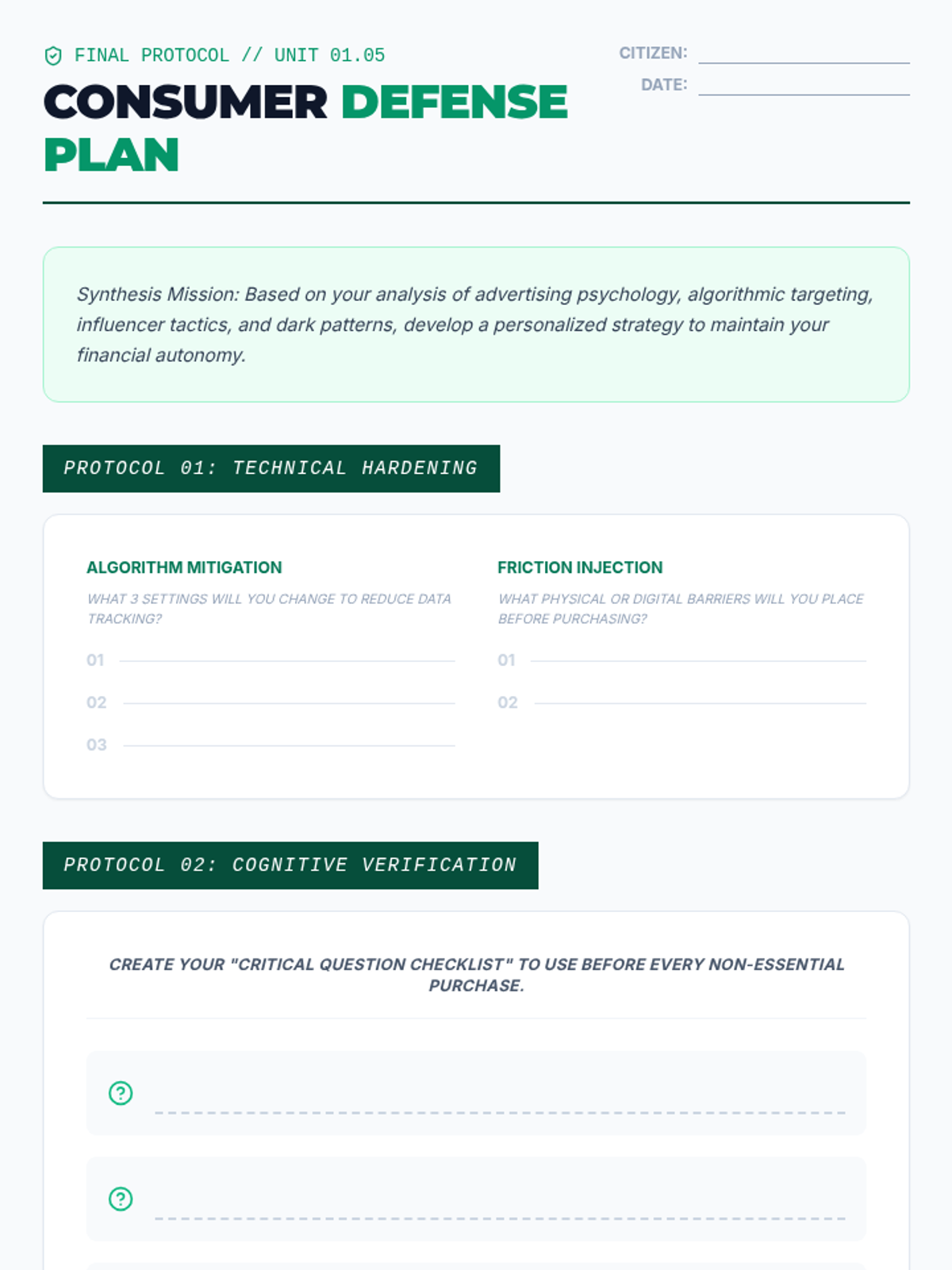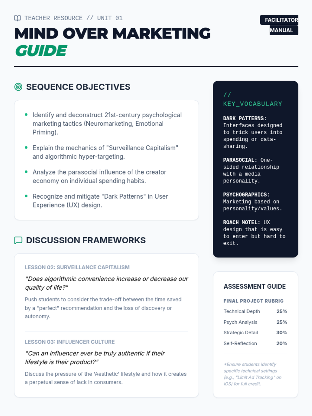 A high-school level sequence exploring the psychological and digital mechanisms of modern advertising. Students learn to identify neuromarketing, algorithmic targeting, influencer tactics, and dark patterns to develop critical consumer autonomy.