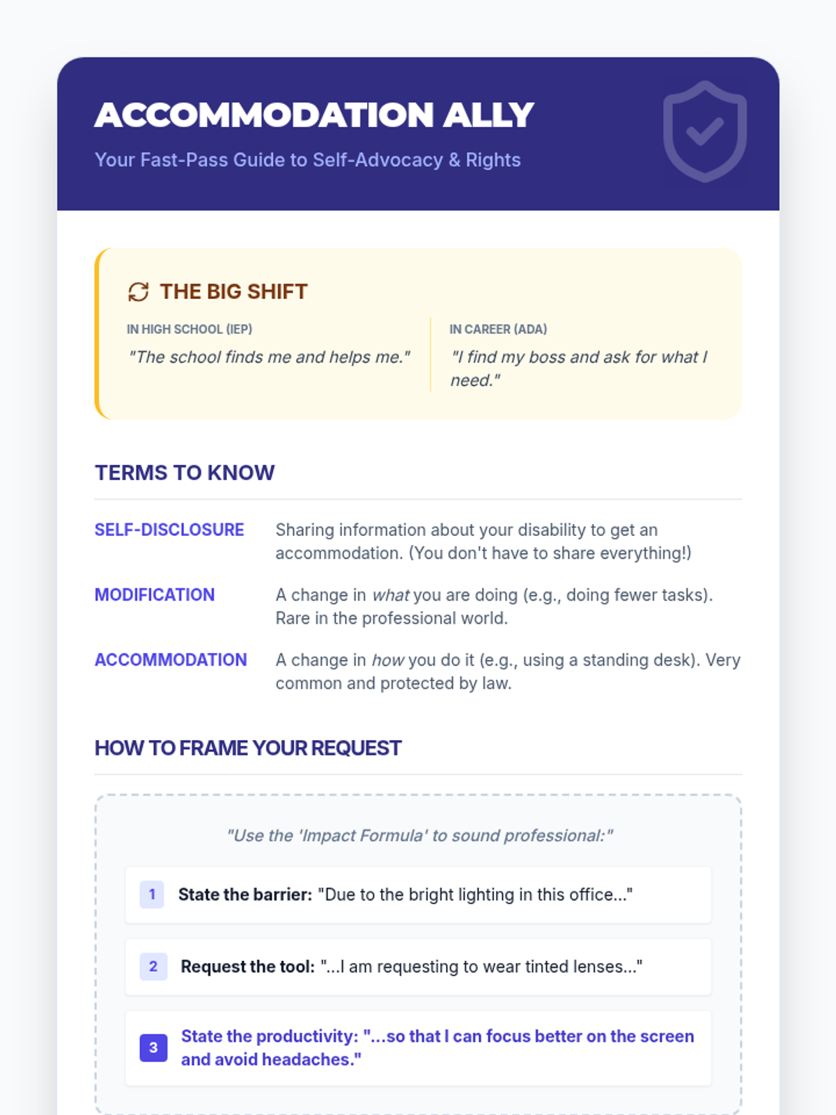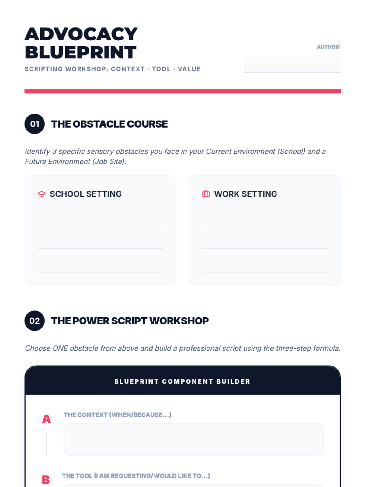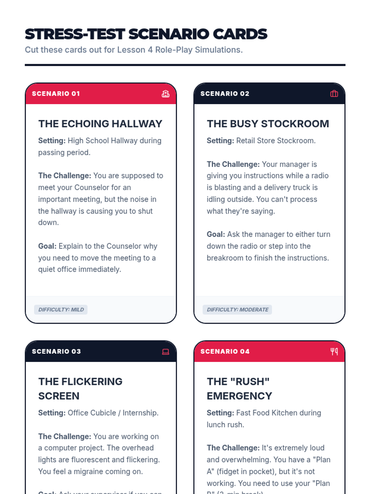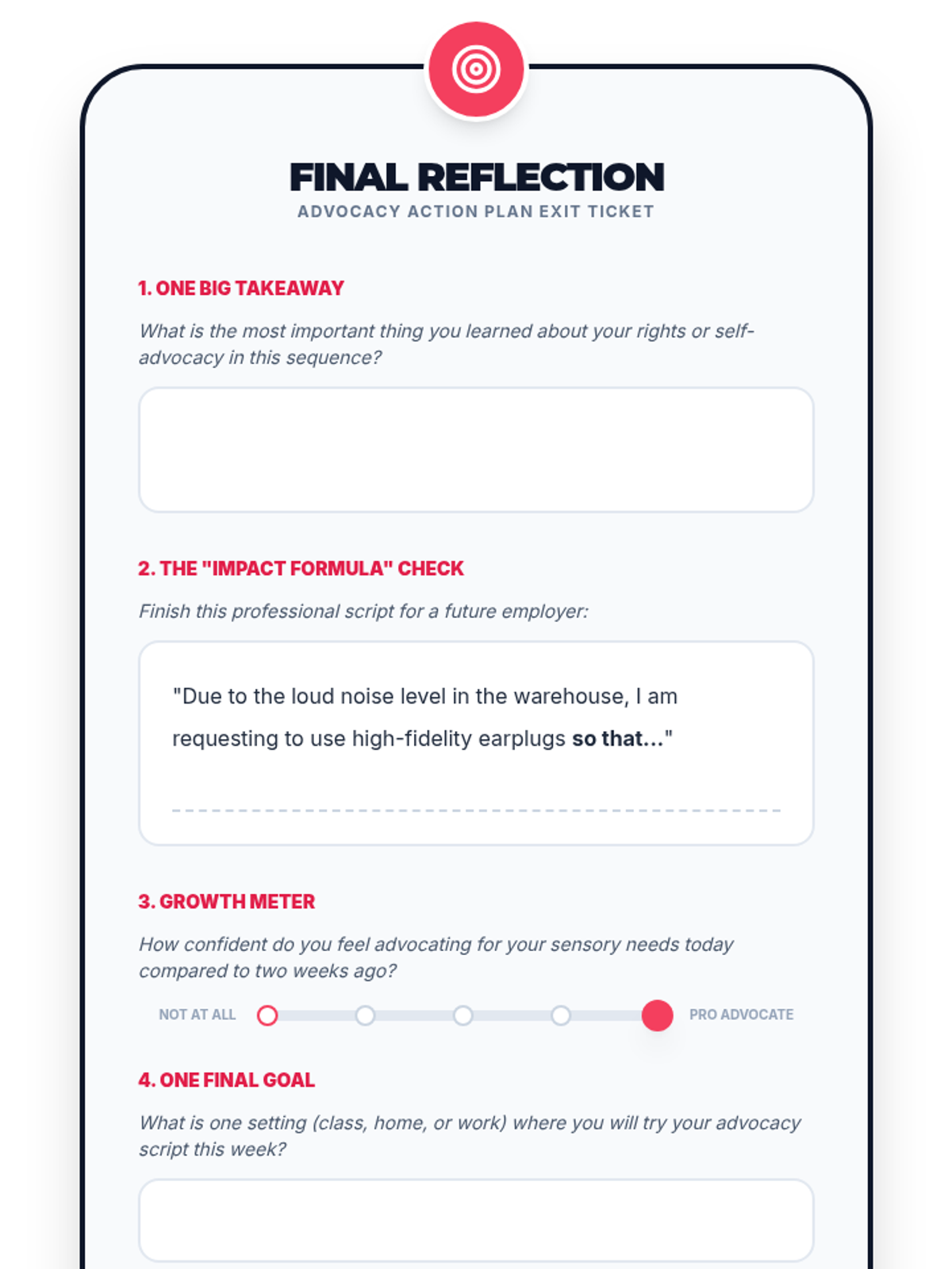 A 10th-grade sequence focused on transitioning sensory regulation strategies from private spaces to public, academic, and vocational environments. Students learn to analyze sensory landscapes, understand their legal rights, and develop professional self-advocacy skills.