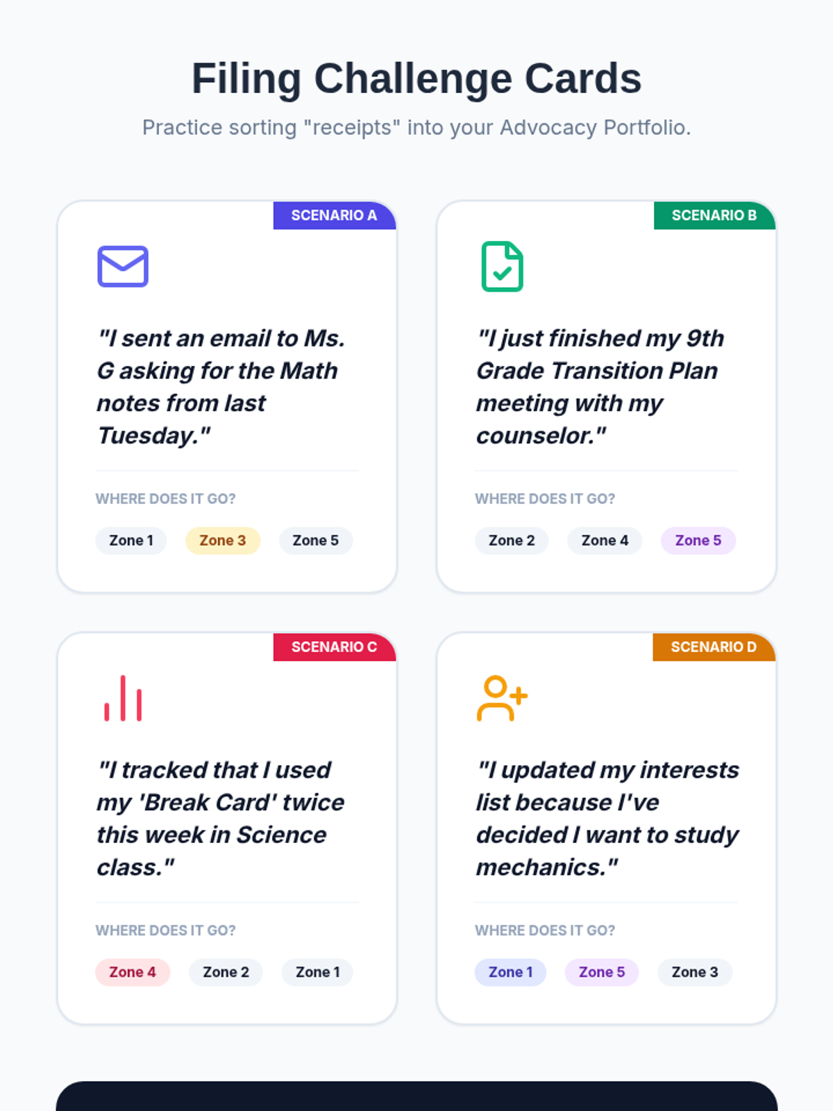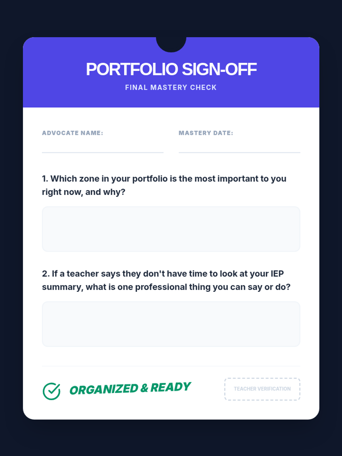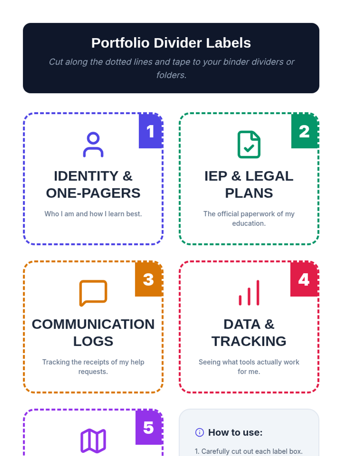 A 5-lesson sequence for 9th-grade students to build and maintain a physical 'Advocacy Portfolio' of their Special Education documentation. This unit teaches document literacy, physical organization, and the importance of record-keeping for self-advocacy.