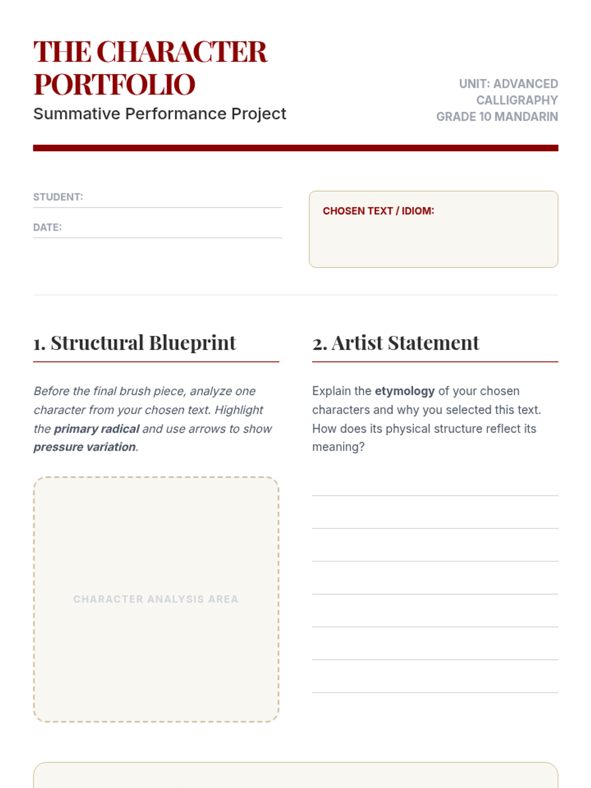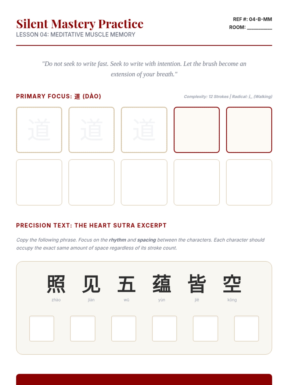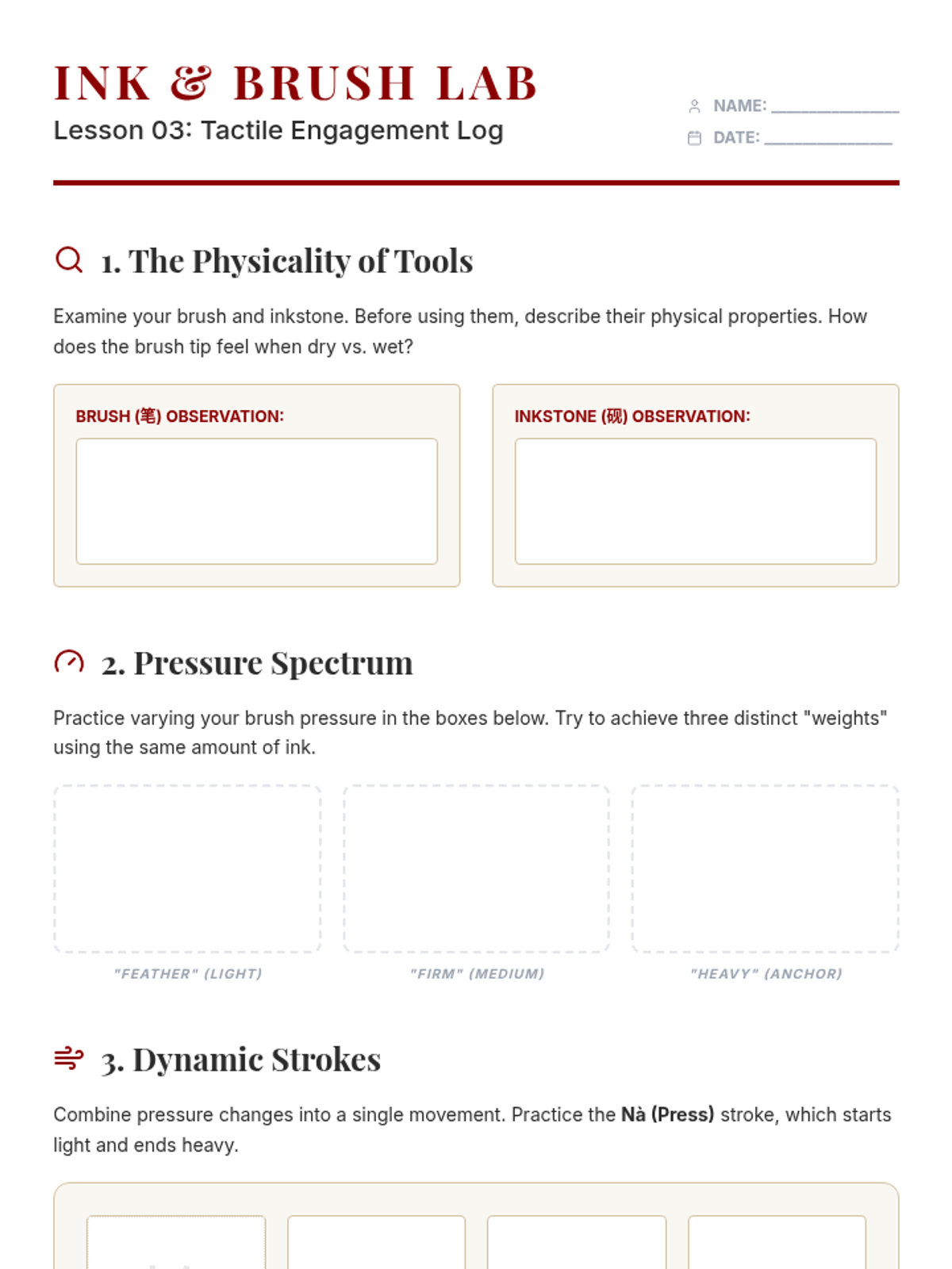 This sequence explores advanced Mandarin characters through the lens of calligraphy and physical structure. Students connect kinetic writing with cognitive retention by studying stroke order, structural balance, traditional tools, and mindfulness.