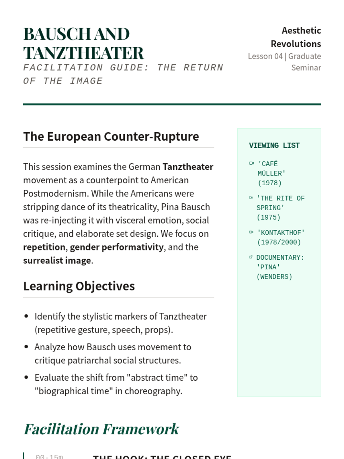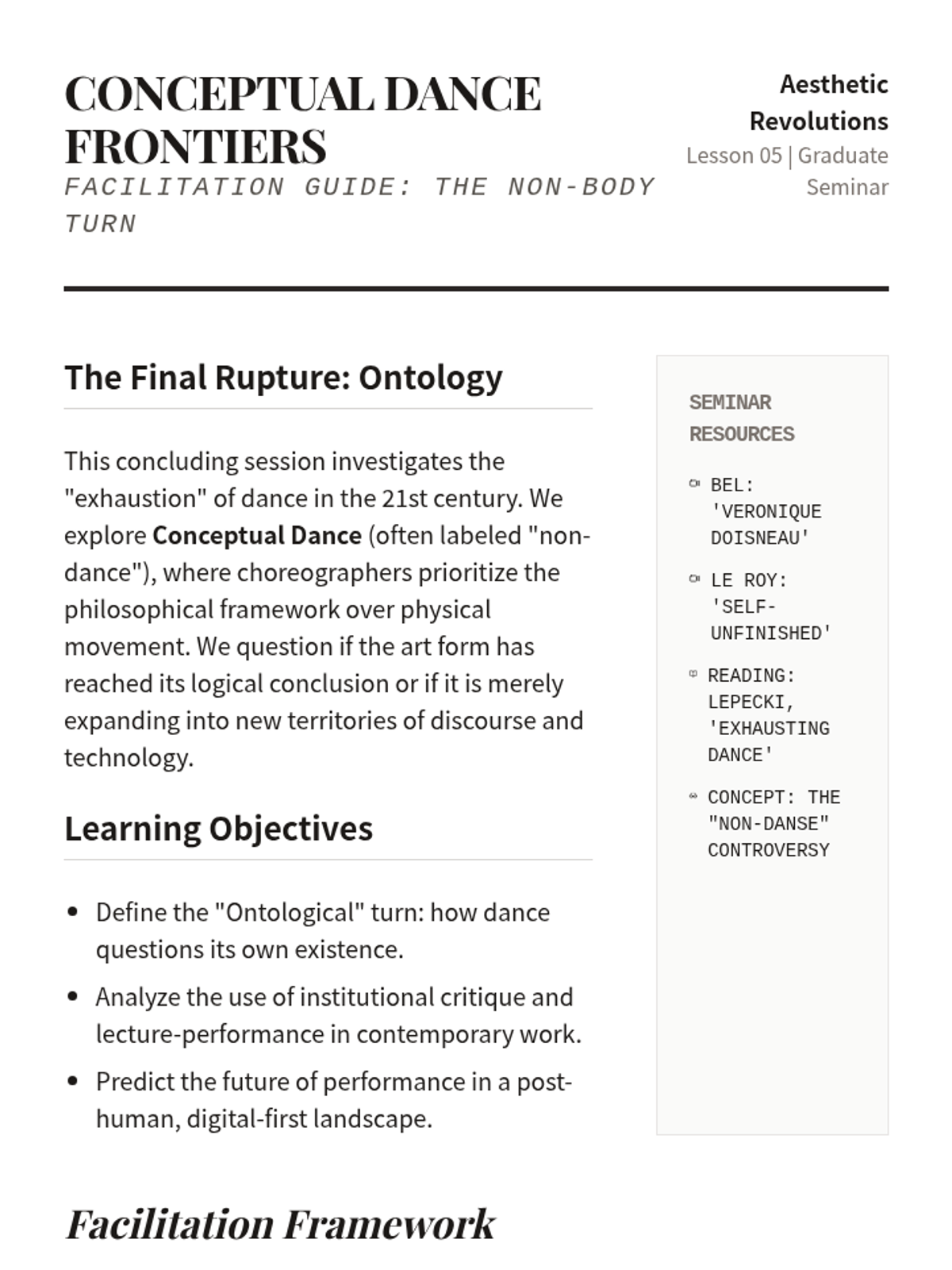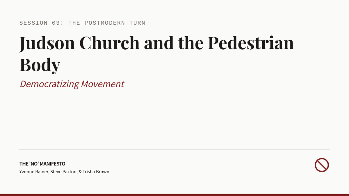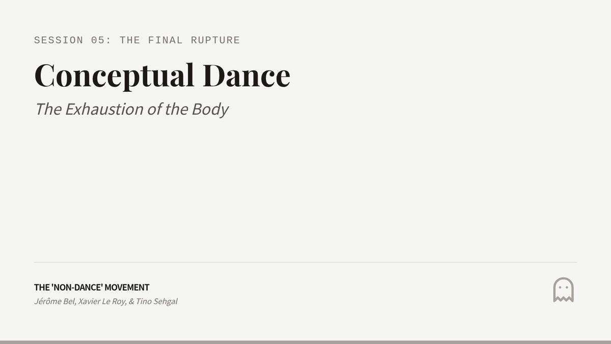 An intensive graduate-level exploration of major aesthetic ruptures in 20th and 21st-century Western dance, tracking the evolution from modern expressionism to contemporary conceptualism.