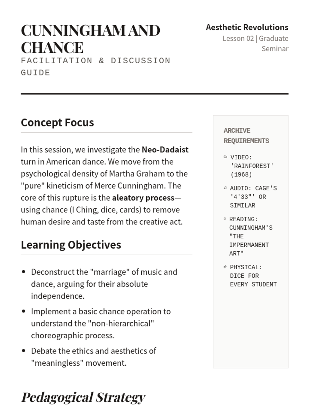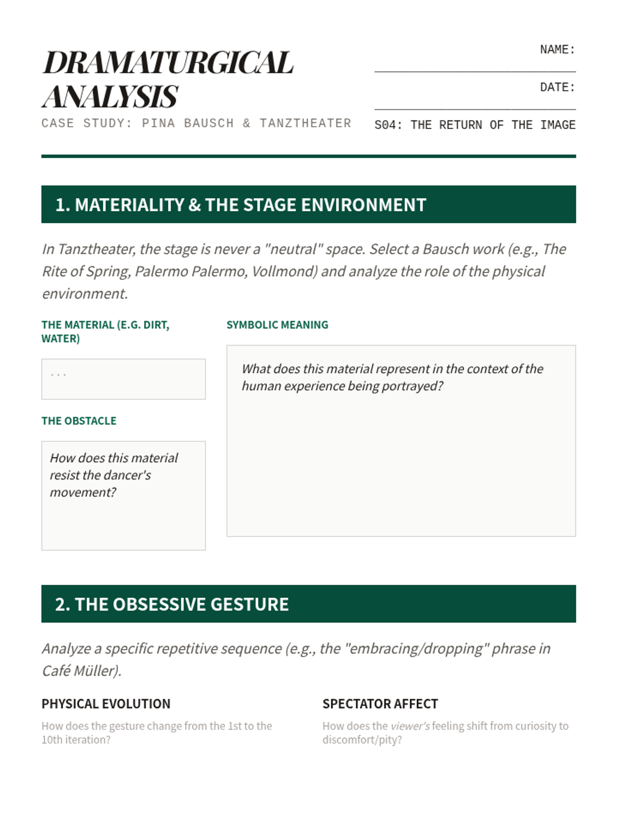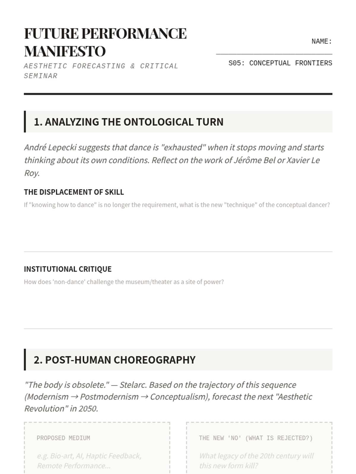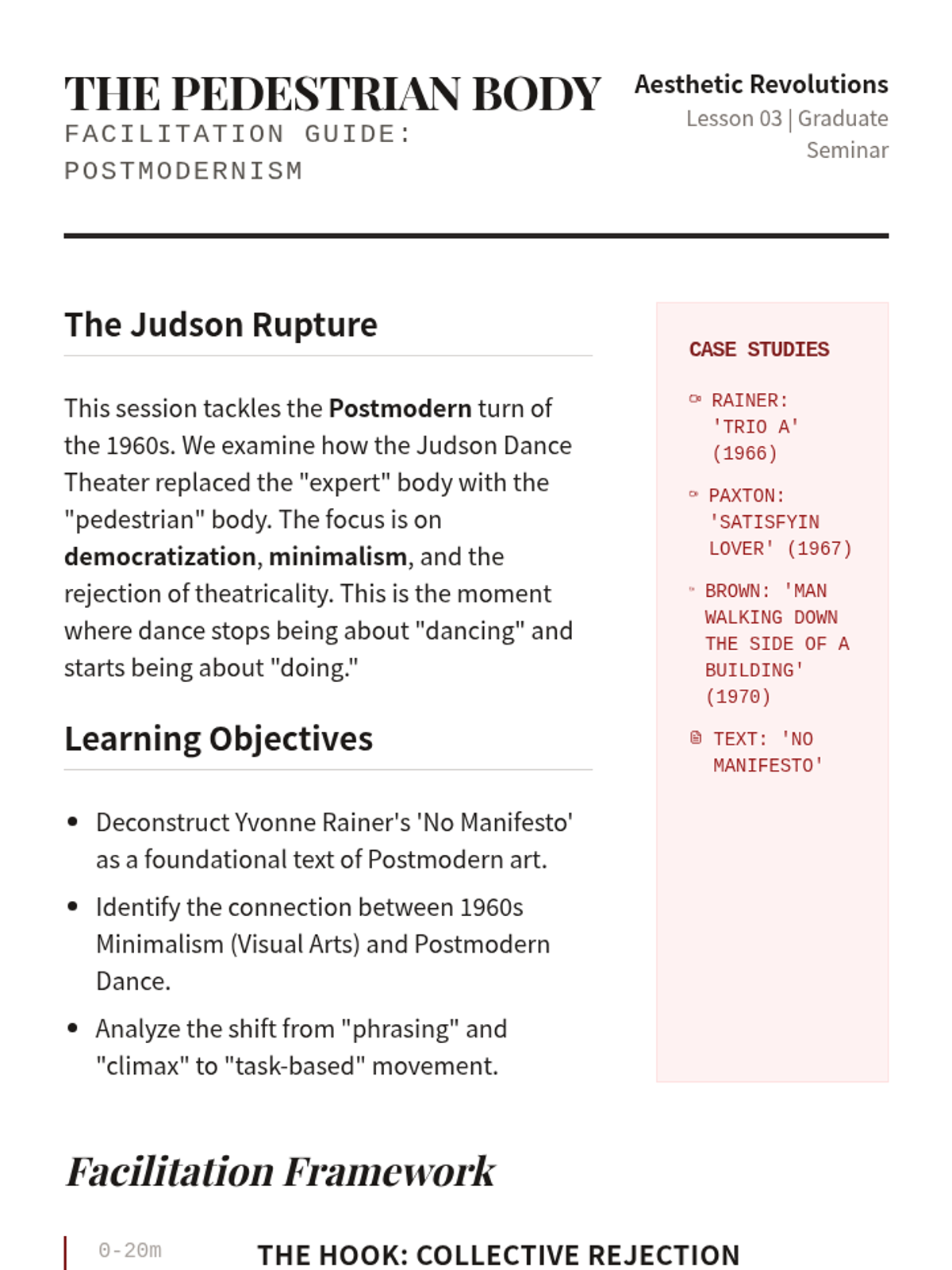 An intensive graduate-level exploration of major aesthetic ruptures in 20th and 21st-century Western dance, tracking the evolution from modern expressionism to contemporary conceptualism.