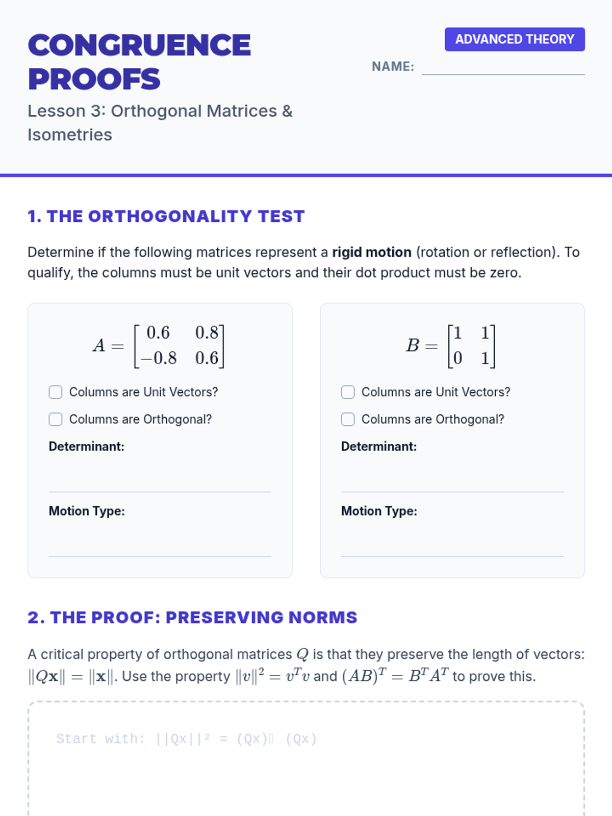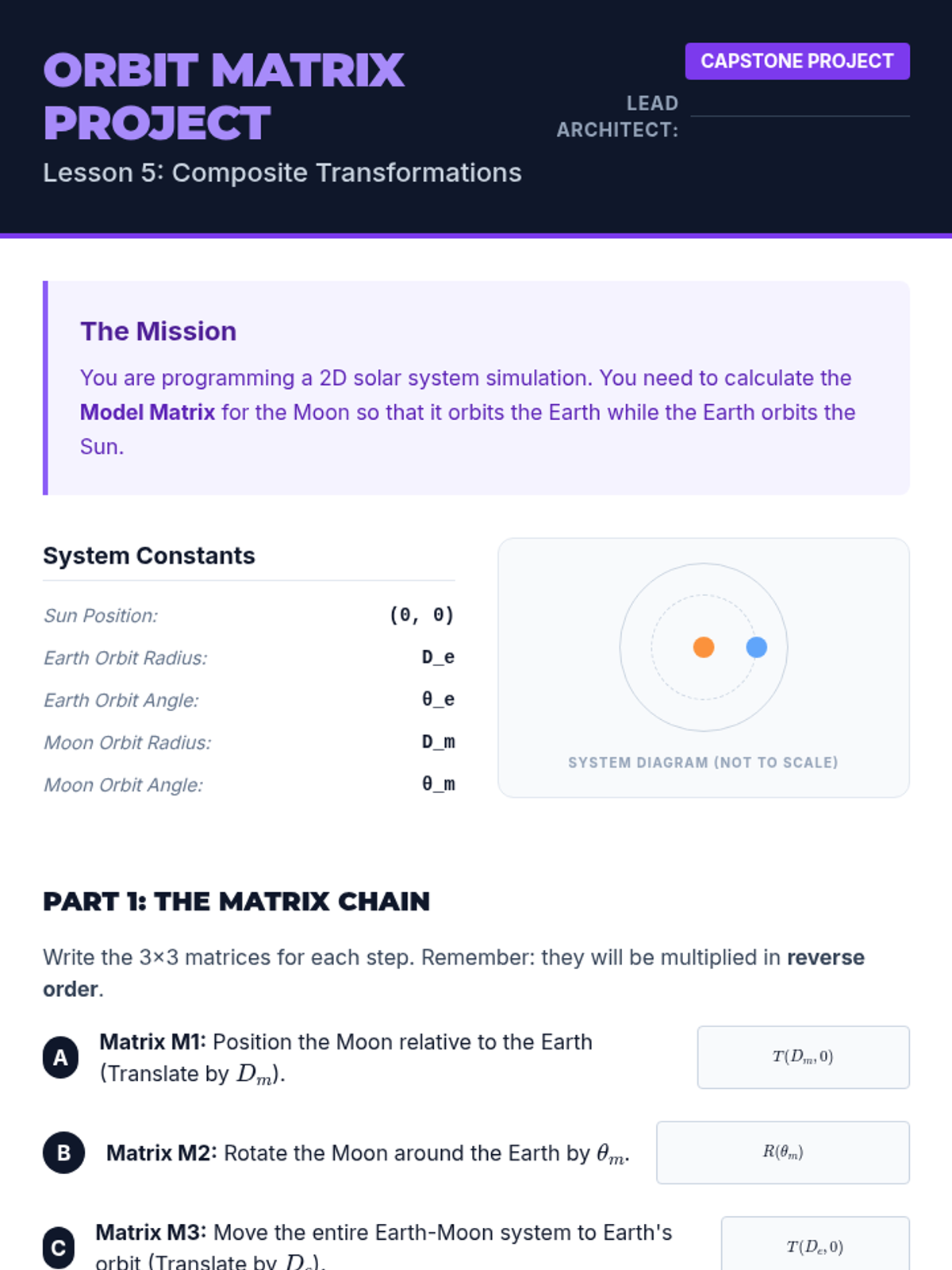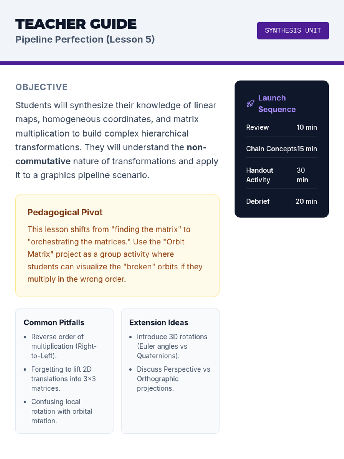 This sequence explores geometric congruence and similarity through the lens of linear algebra. Students learn to represent and manipulate shapes using matrices, homogeneous coordinates, and composite transformations, bridging the gap between abstract geometry and computer graphics.