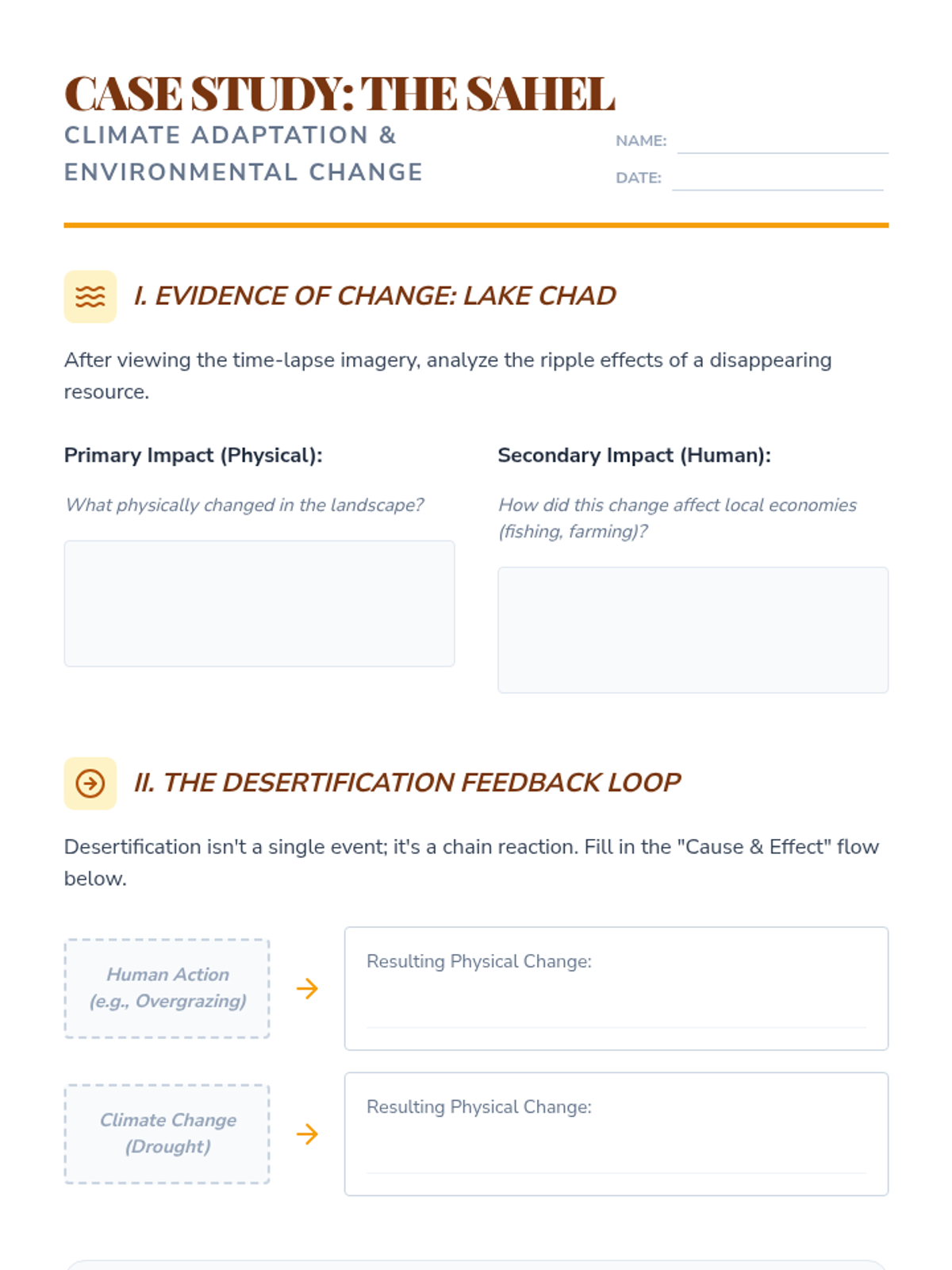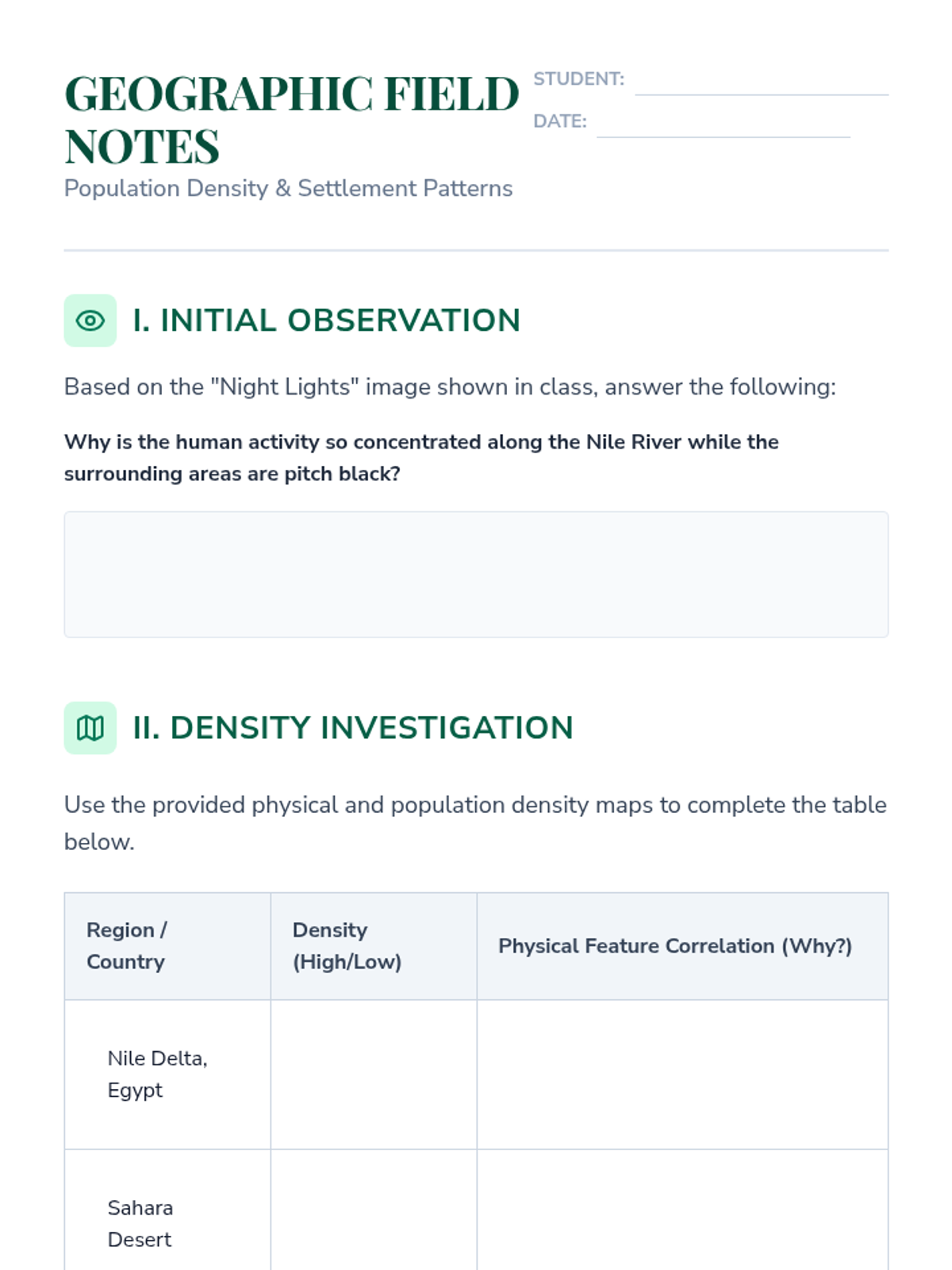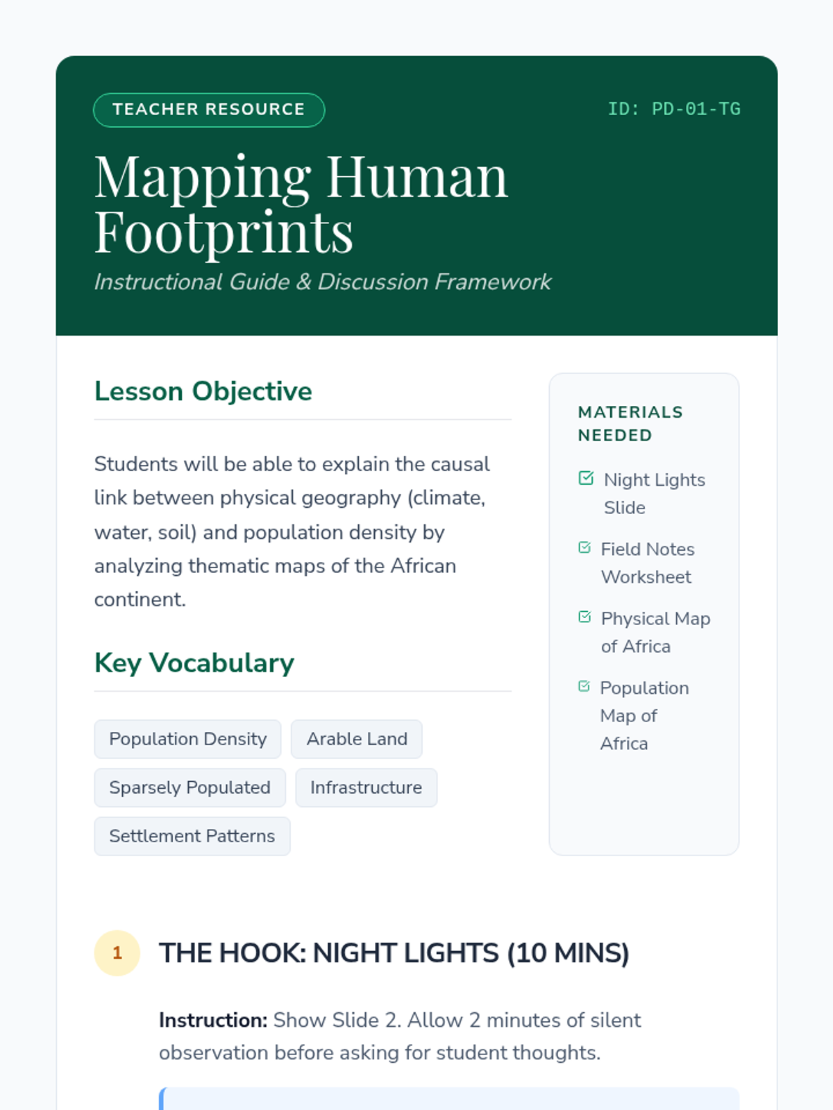A 9th-grade geography sequence exploring the interaction between Africa's physical environment and human settlement patterns, from historical population clusters to modern urbanization and sustainable adaptations.