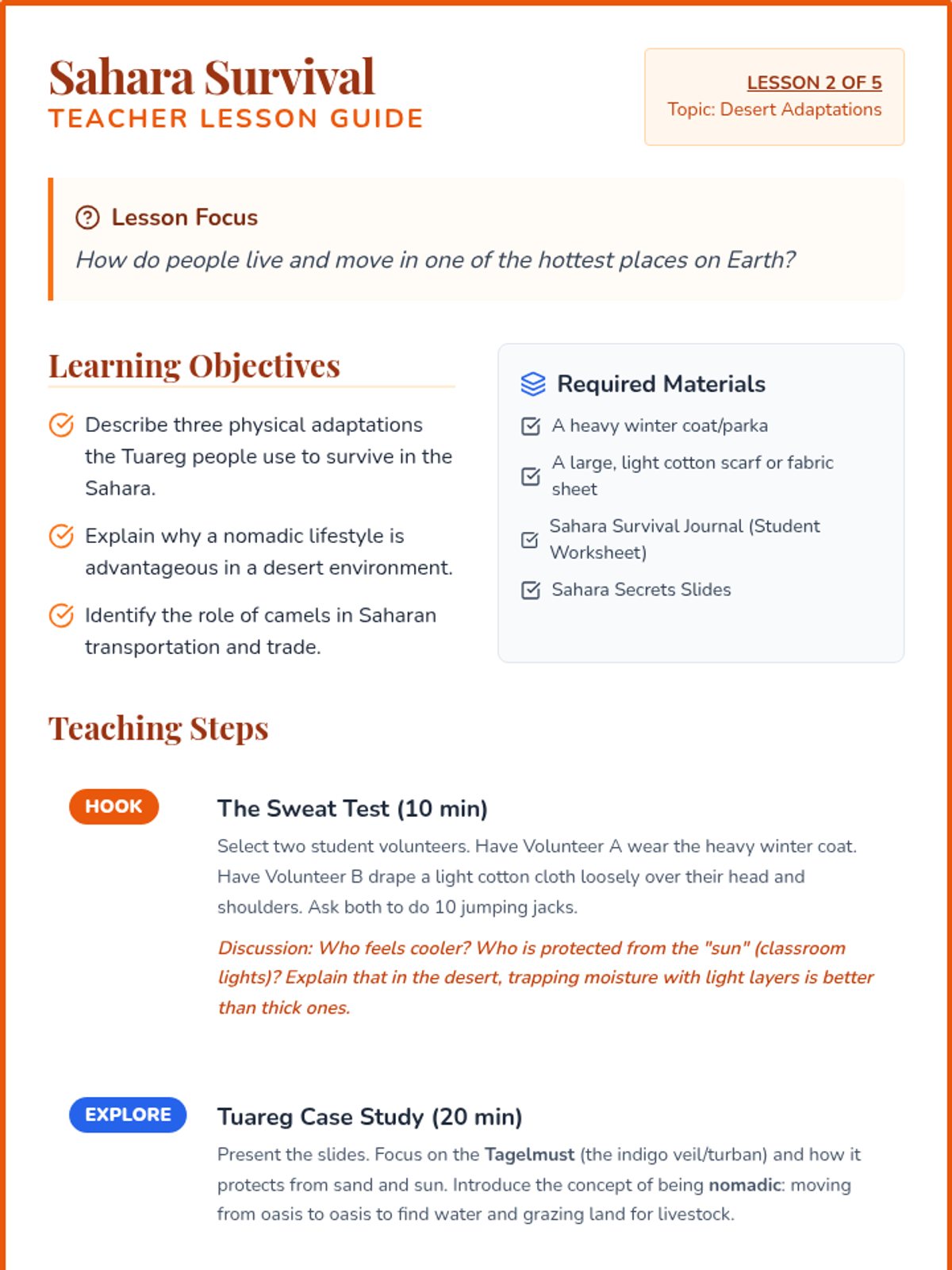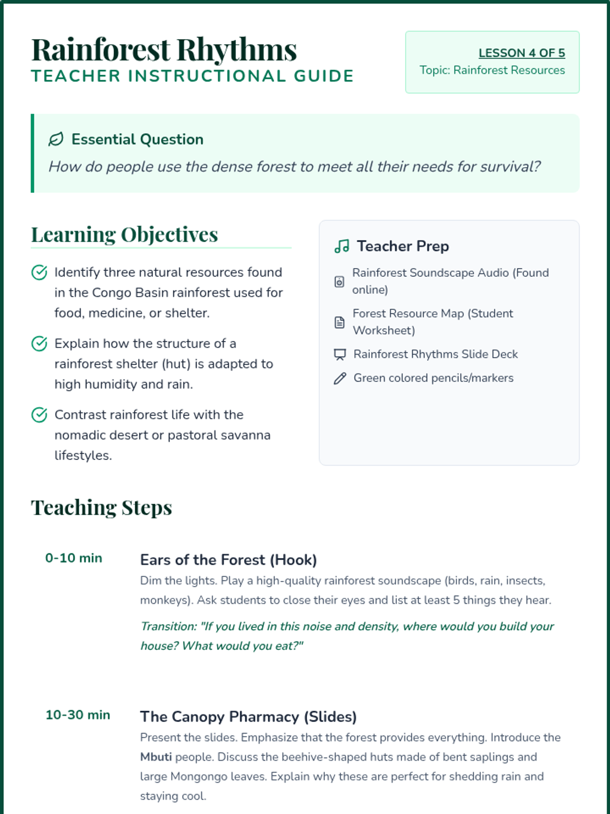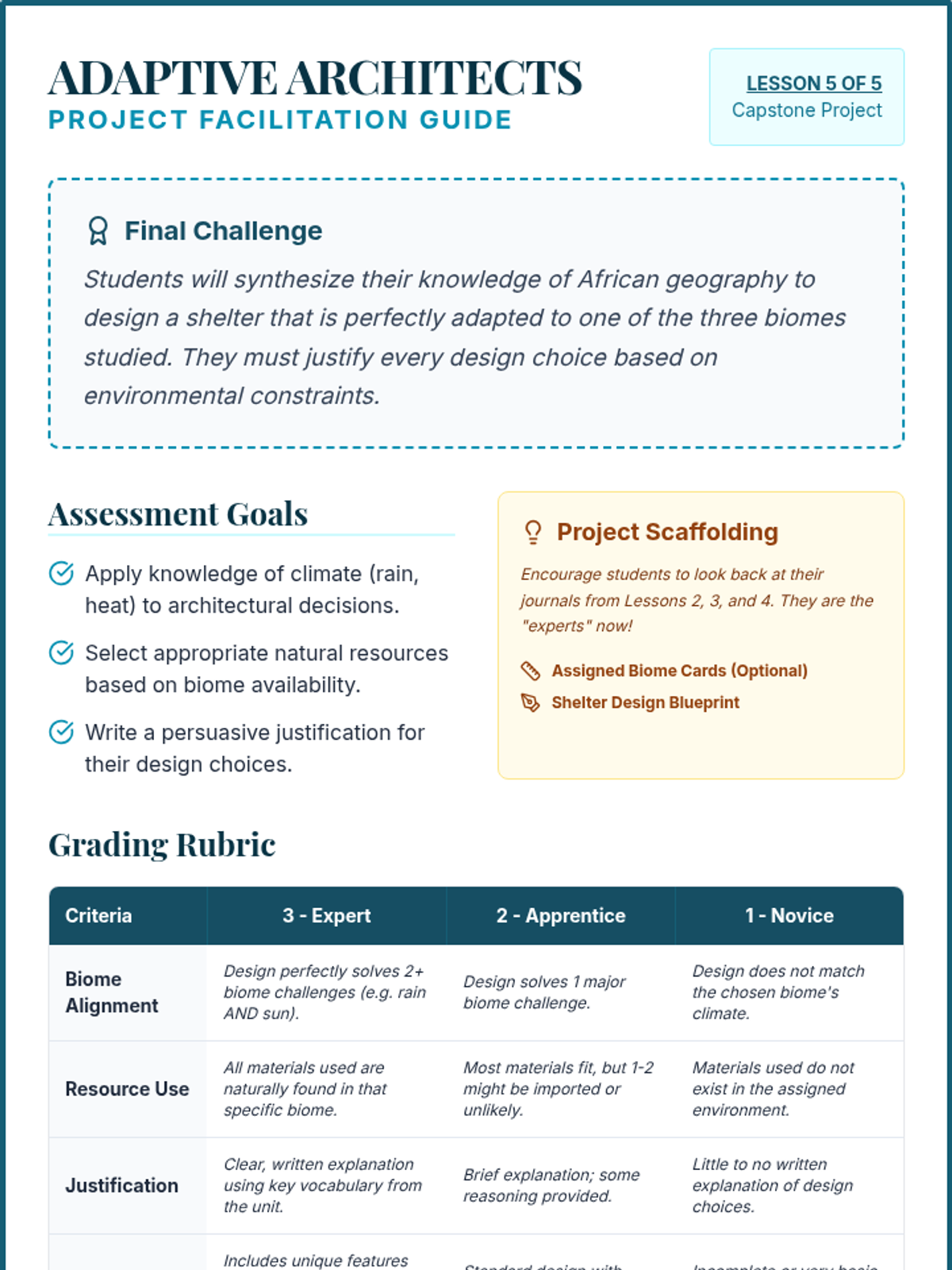 A 3rd-grade geography sequence exploring Africa's three major biomes—rainforest, savanna, and desert—and how human communities adapt their lifestyles, shelters, and clothing to these diverse environments.