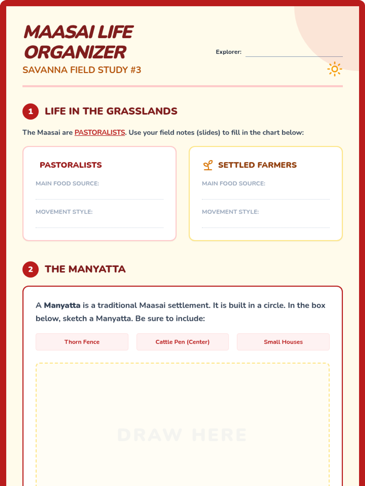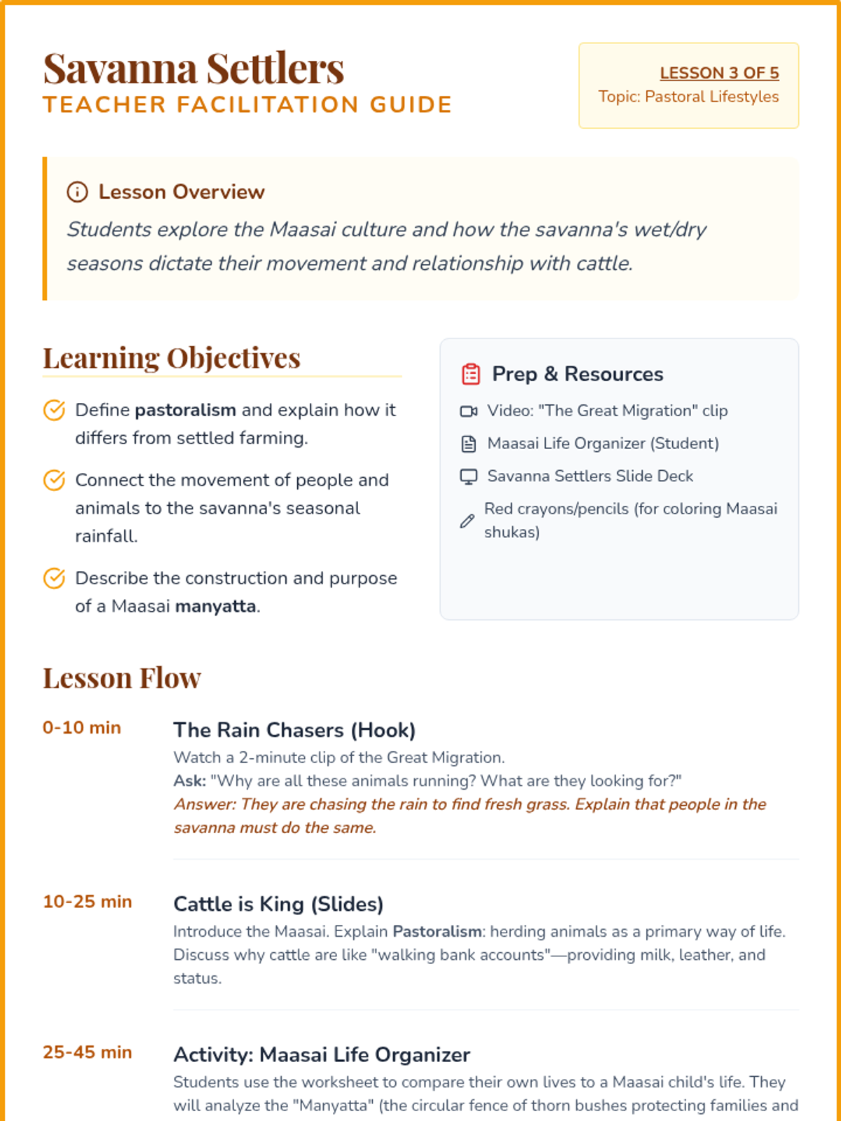 This sequence challenges stereotypes by exploring the diversity of cultures, languages, and settlement types across Africa's regions. Students compare rural village life with modern urban centers, recognizing that Africa is a continent of contrast and modernity through inquiry, case studies, and creative projects.