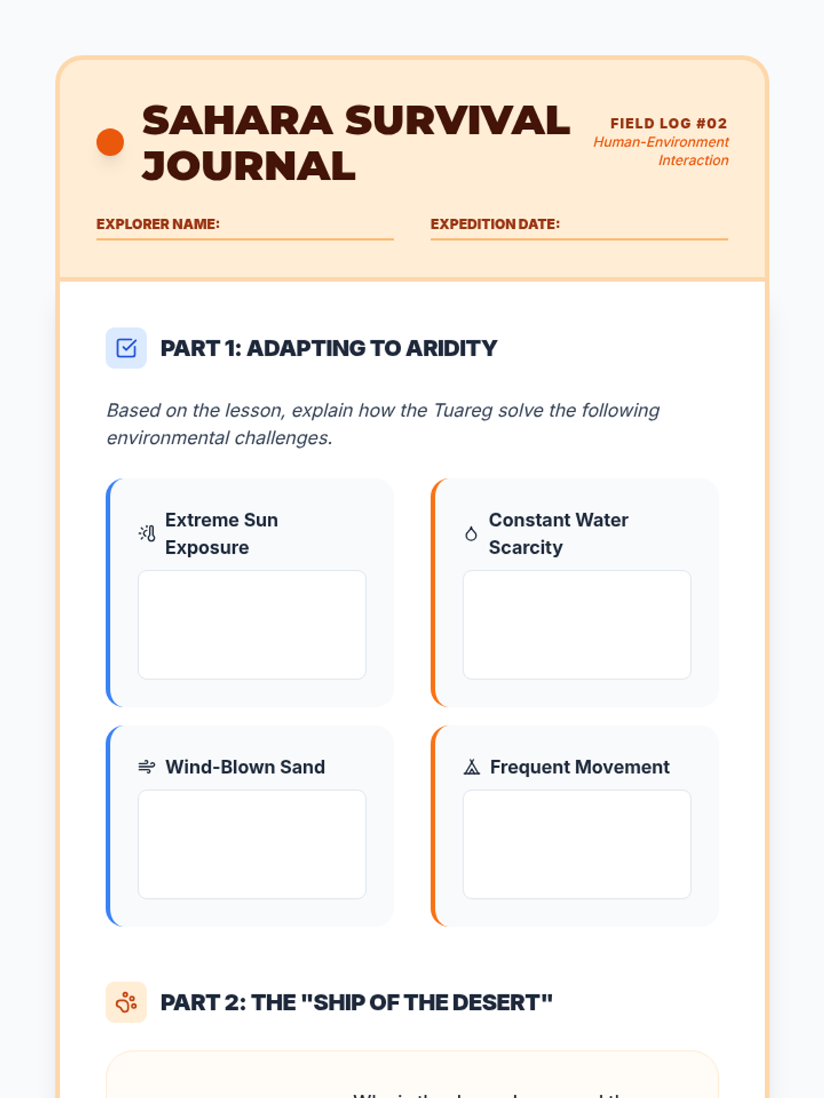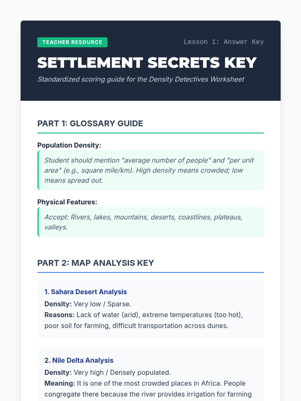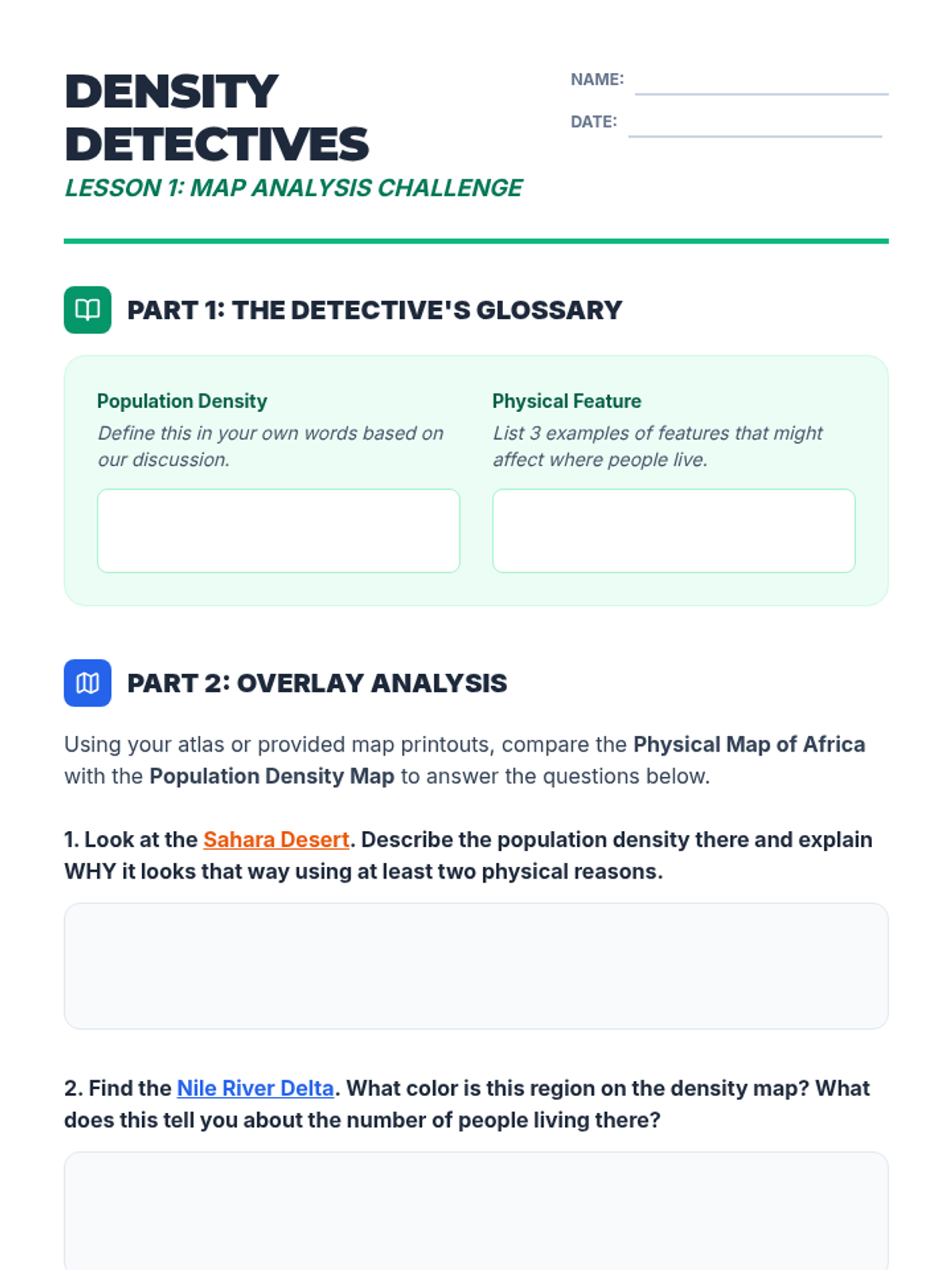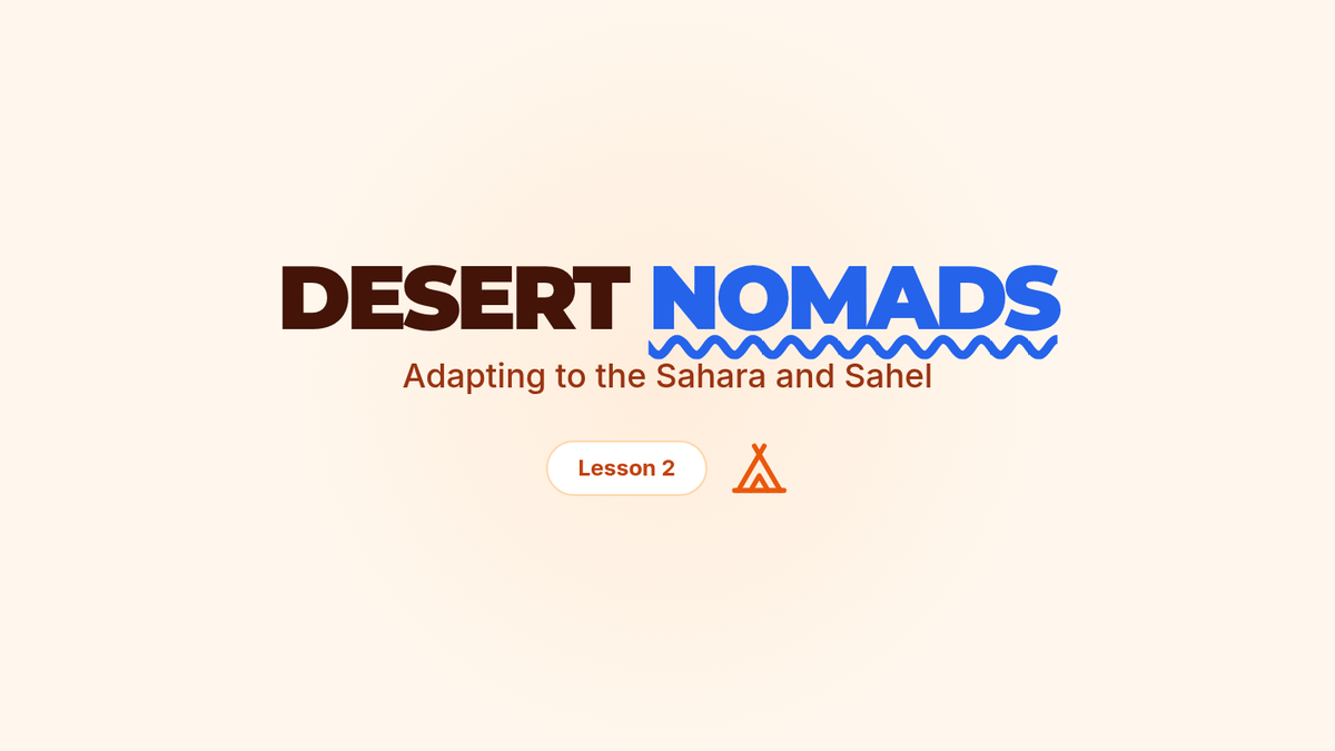A 5-lesson 6th-grade geography sequence focusing on human-environment interaction in Africa. Students investigate how physical geography influences population density, cultural adaptations in the Sahara and Sahel, the impacts of desertification, life in the Congo Basin, and the challenges of modern urbanization.